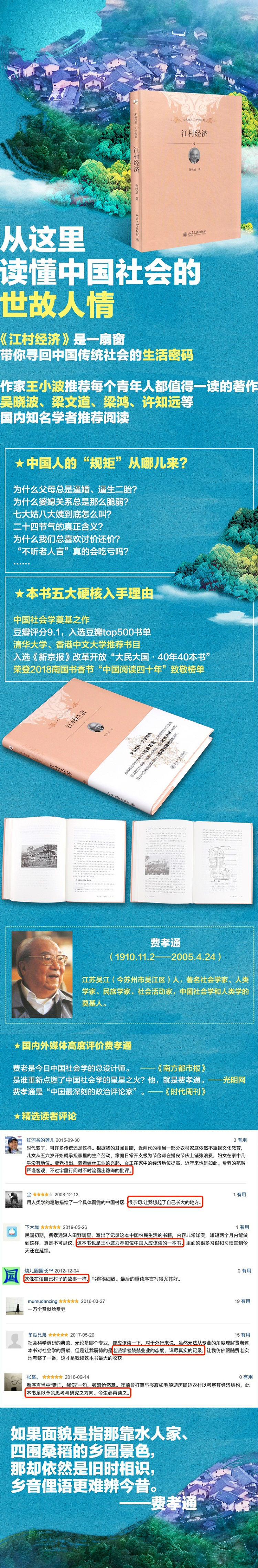 《江村经济》原本是作者用英文写成的博士论文,原题《中国农民的生活》,在国外先出版,后译成中文在国内出版。作为费孝通先生研究乡土中国的代表作品,该书一度被知名人类学家马林诺夫斯基誉为“人类学实地调查和理论工作发展中的一个里程碑”,值得后学不断研读欣赏。