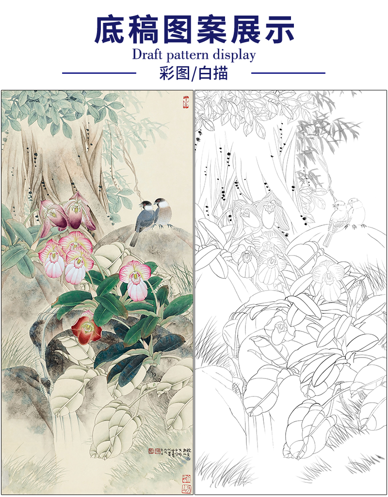 俞致贞花鸟工笔画白描底稿《山茶双禽》临摹勾线高清打印稿ZZ06