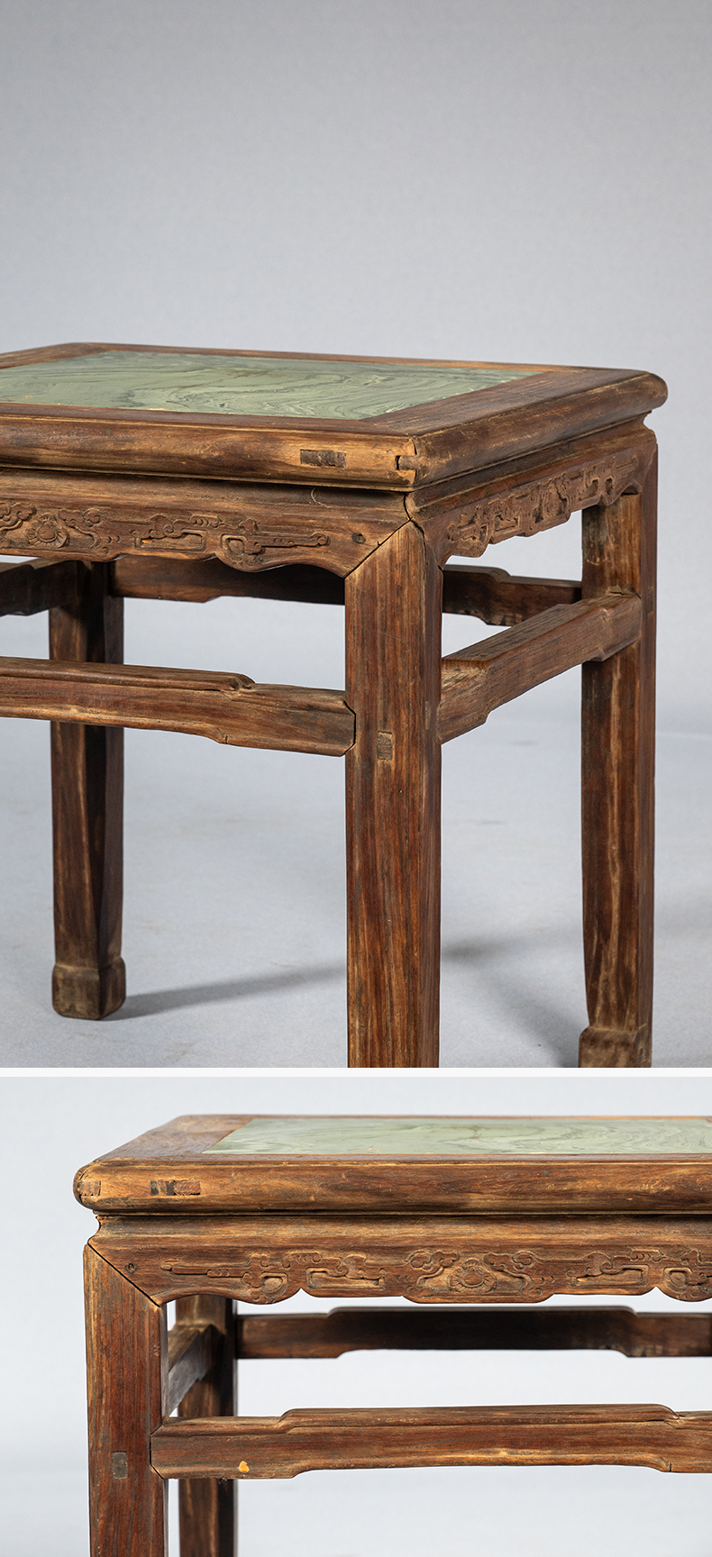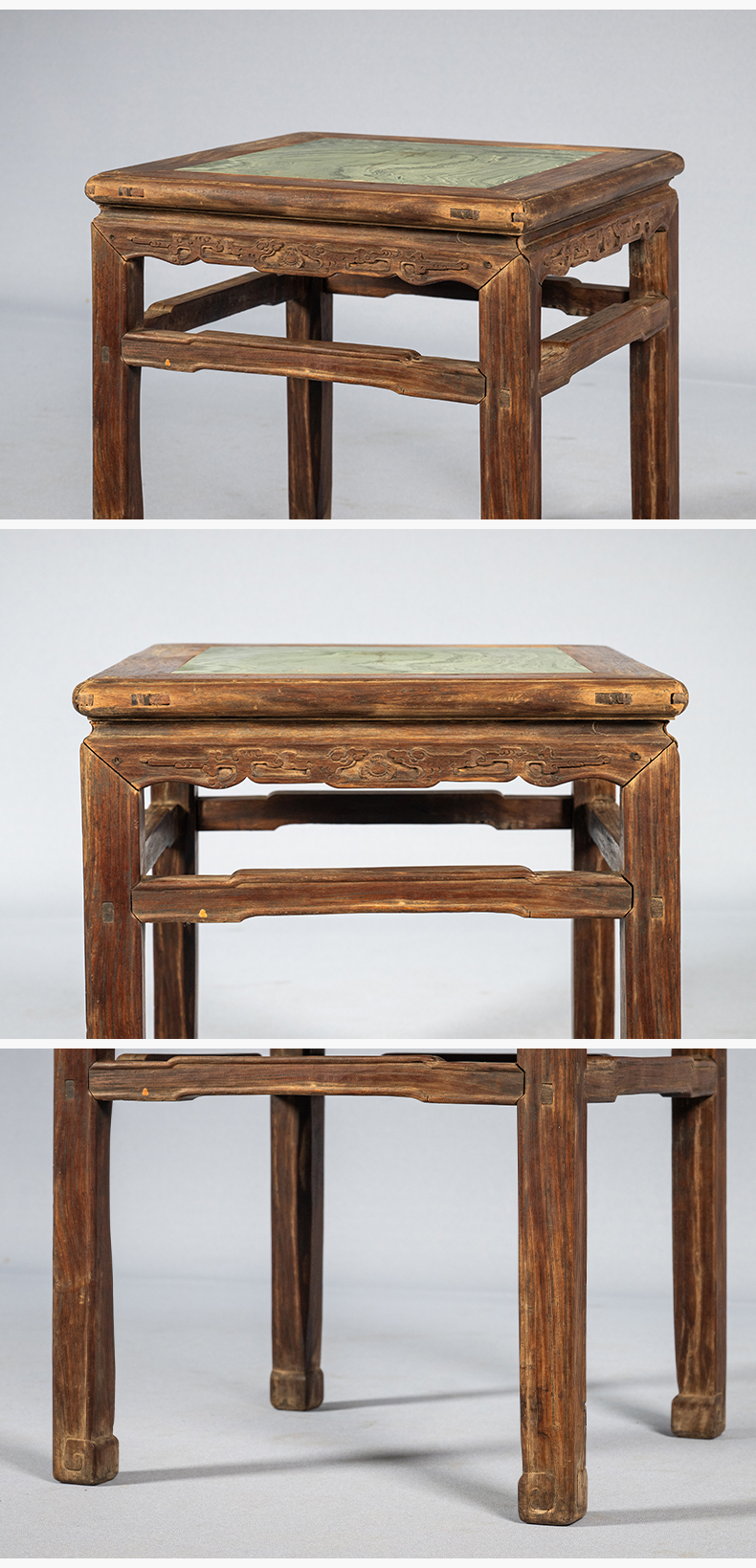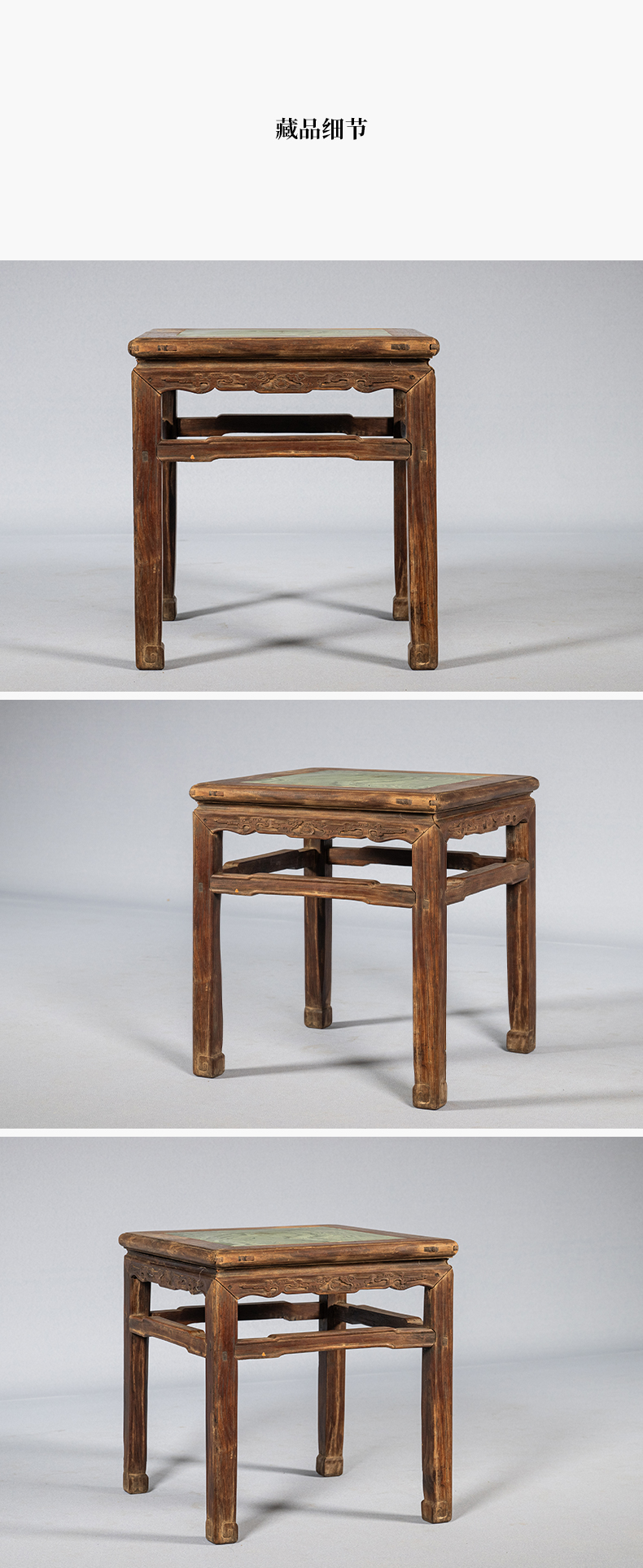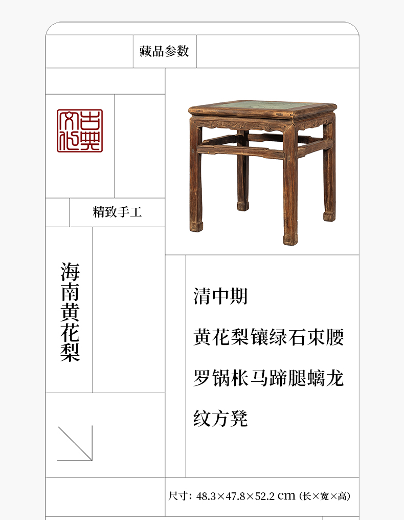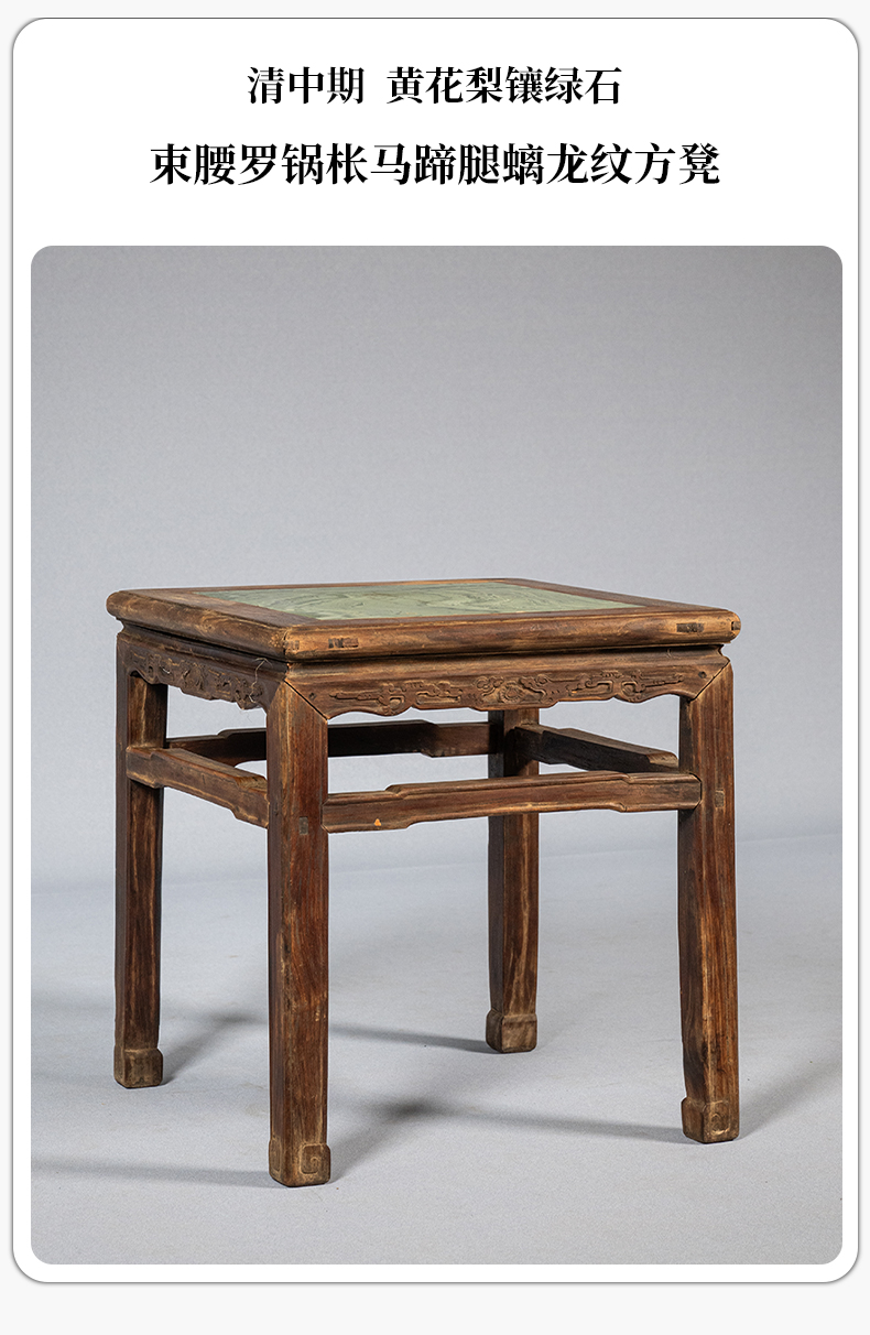 清中期 黄花梨镶绿石束腰罗锅枨马蹄腿螭龙纹方凳