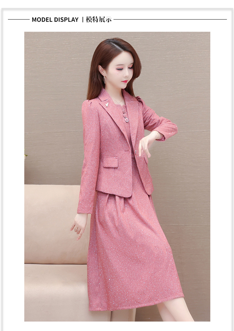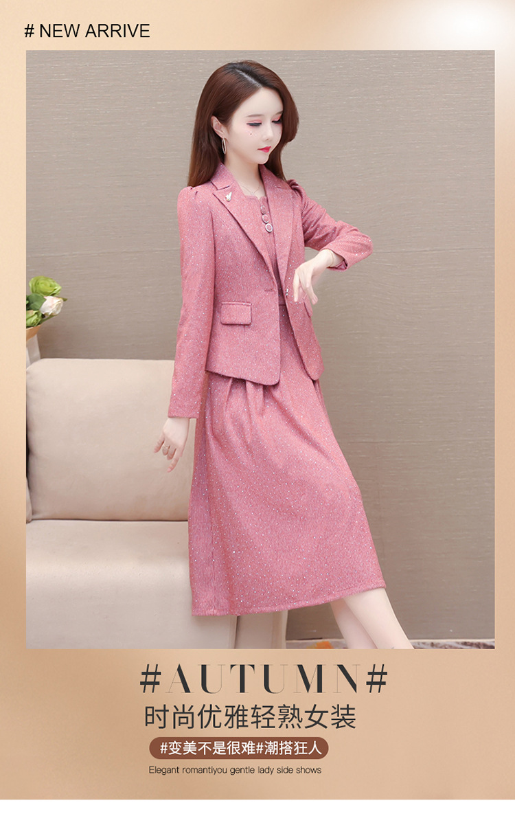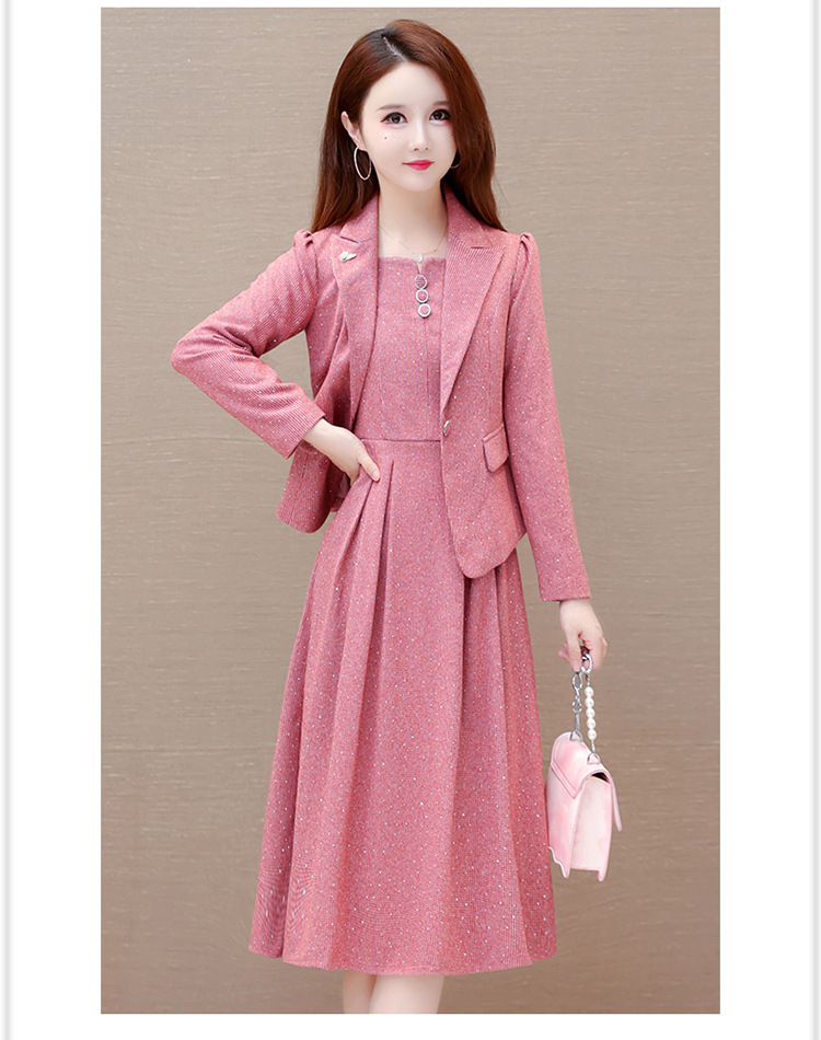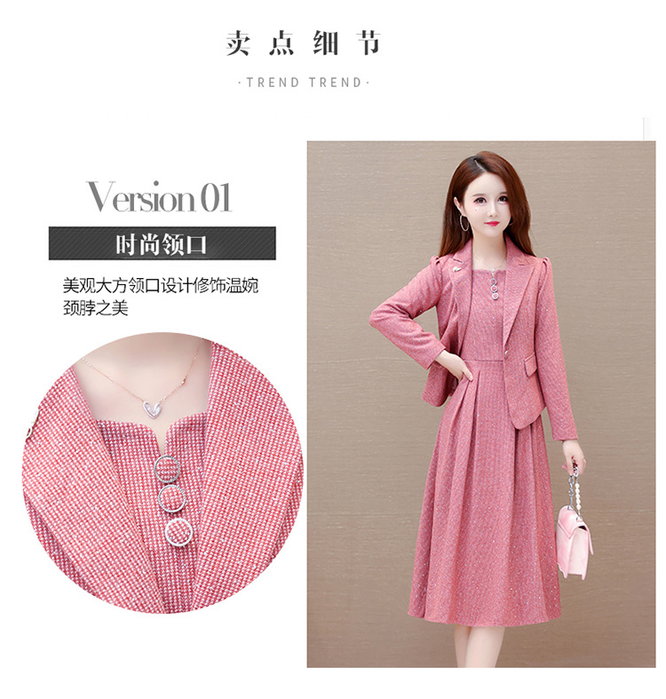 QYM-YX-MZ555-Y,两件套连衣裙粉色西装短款外套中长款百褶A字裙秋季套装裙
