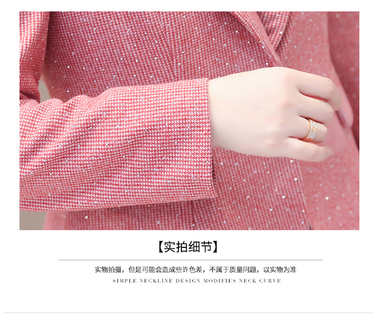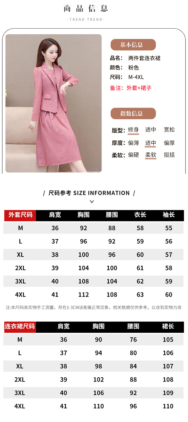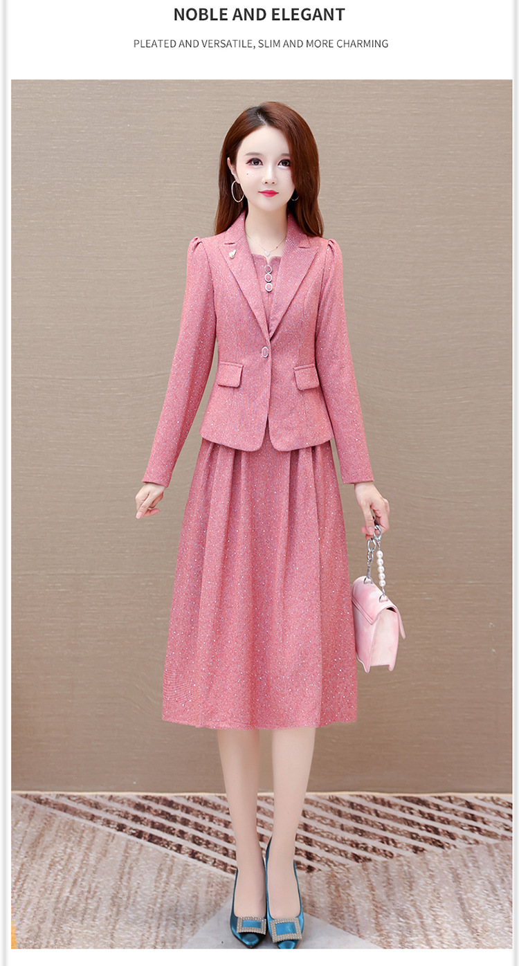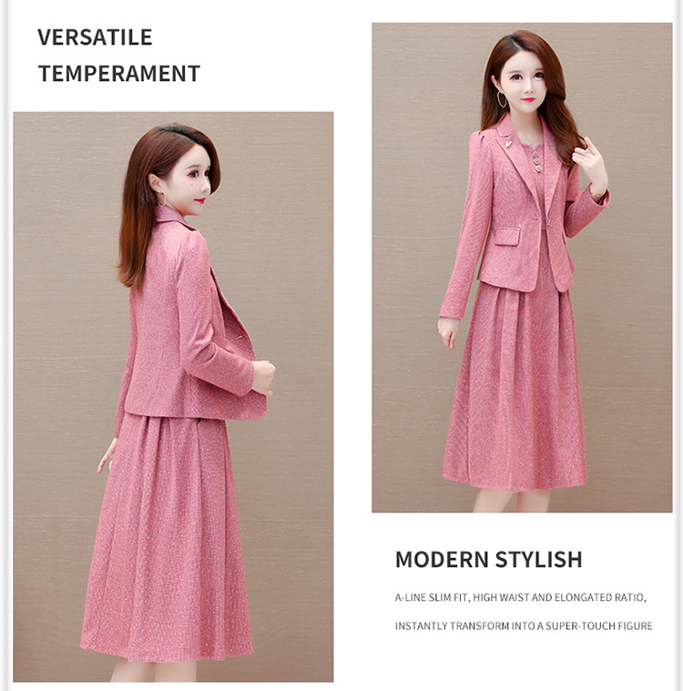 QYM-YX-MZ555-Y,两件套连衣裙粉色西装短款外套中长款百褶A字裙秋季套装裙