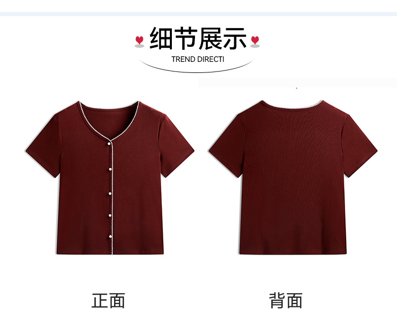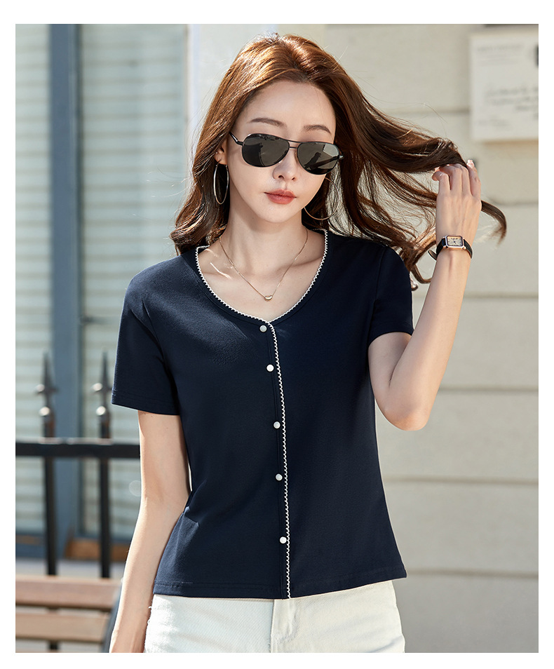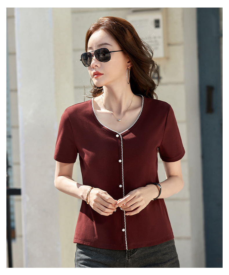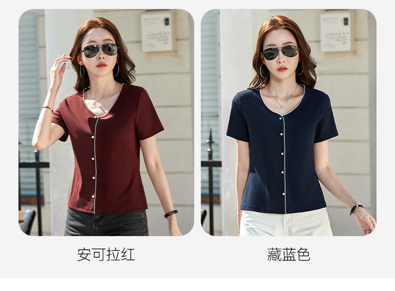 百媚生 棉质短袖T恤女撞色圆领纽扣上衣3329 商品图0