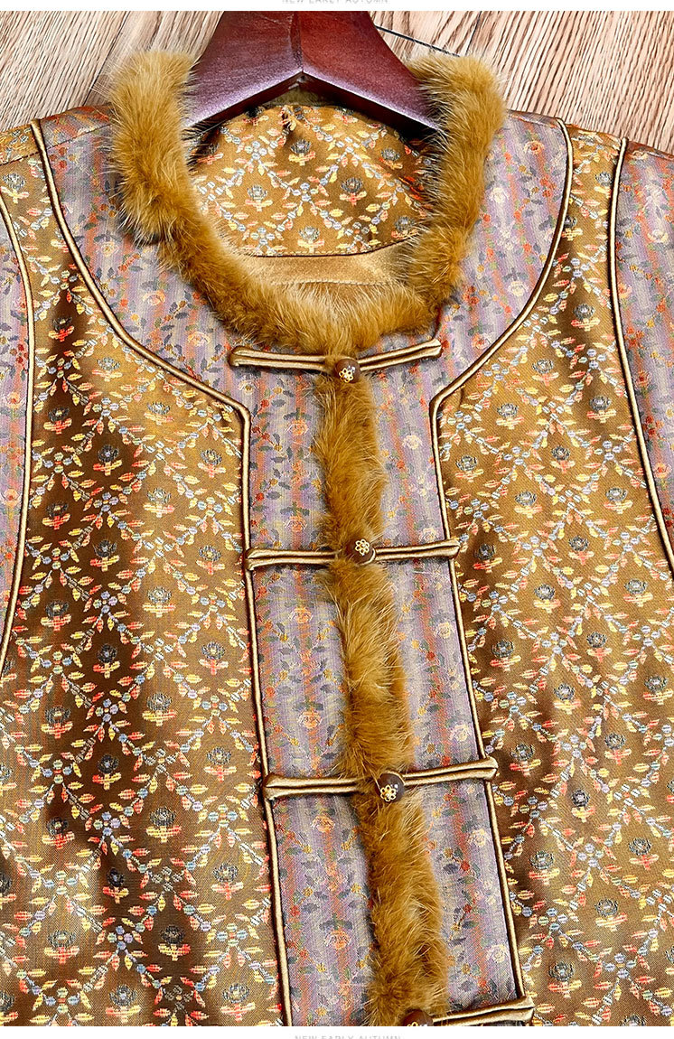 OG 8697新中式国风水貂毛时尚拼接圆领贵气夹棉开衫马甲