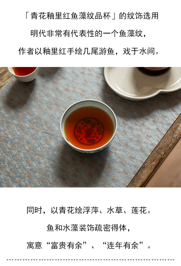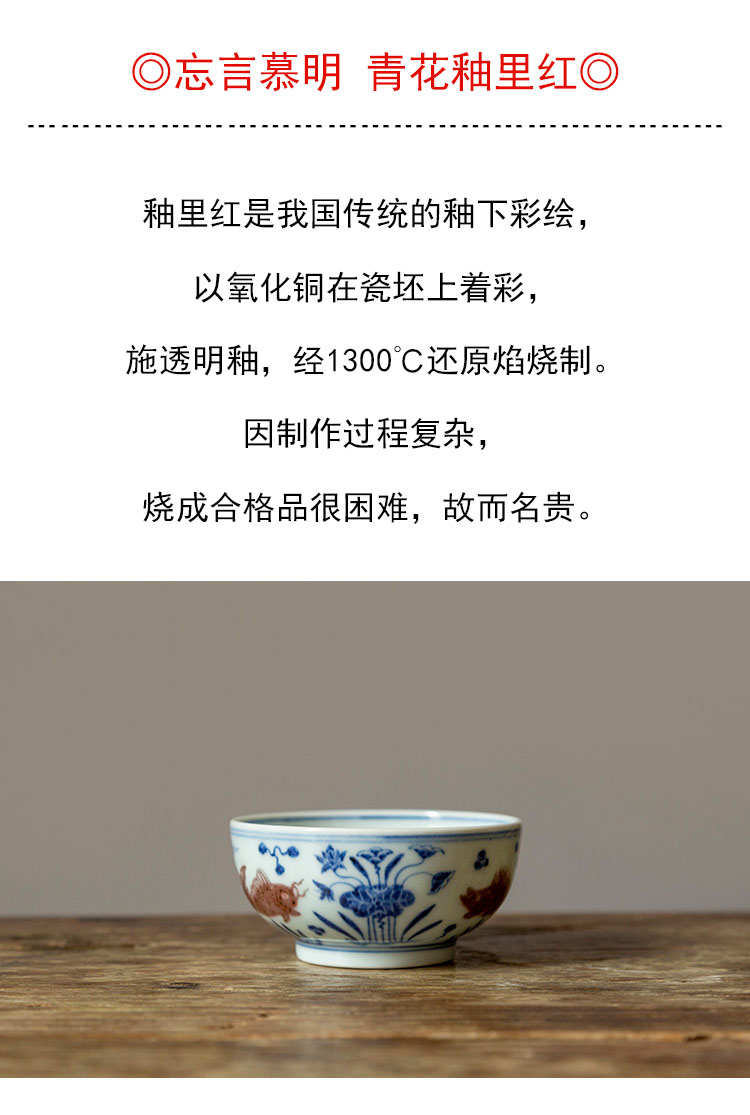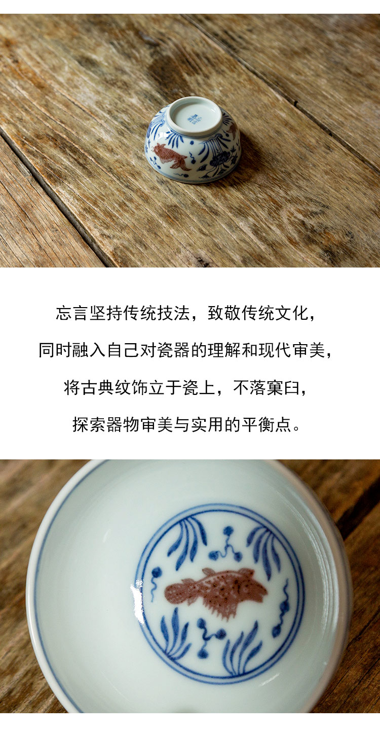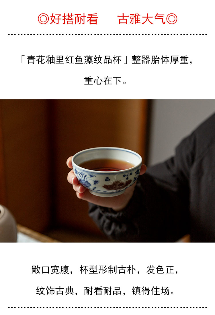 茶香记 景德镇忘言慕明青花釉里红鱼藻纹品杯110ml手绘茶杯主人杯