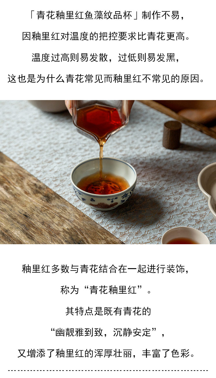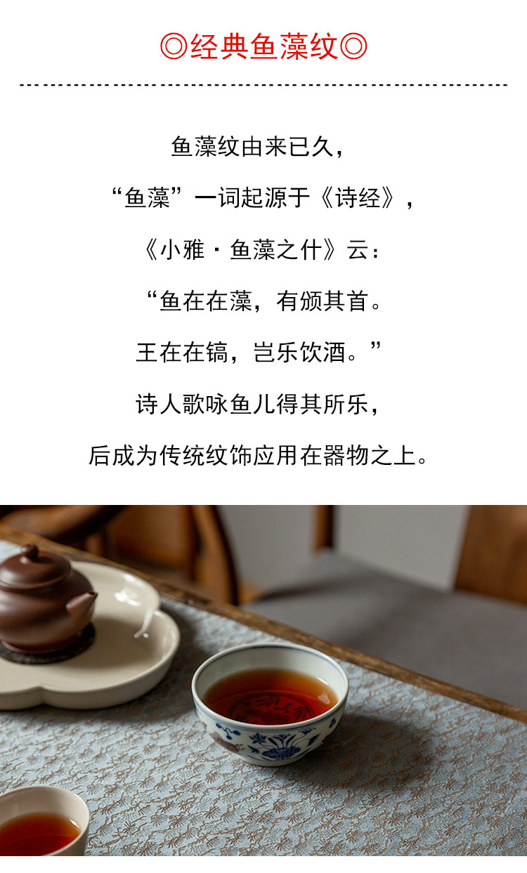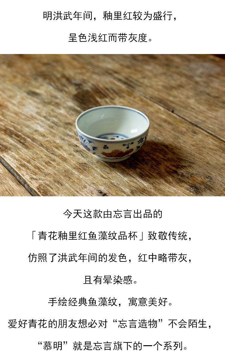 茶香记 景德镇忘言慕明青花釉里红鱼藻纹品杯110ml手绘茶杯主人杯