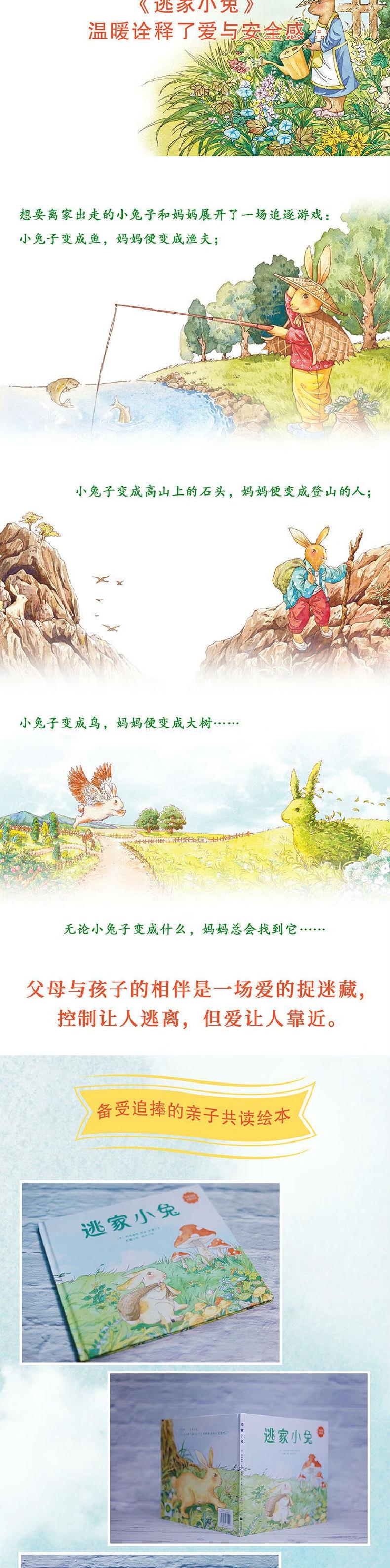 《逃家小兔》是美国儿童文学作家玛格丽特·怀兹·布朗的代表作,通过想要离家出走的小兔子与妈妈对话,幻想出一场追逐游戏,以愉悦的方式呈现了爱与安全感的主题。这是一本简单的小书,却能让孩子从生活琐事的烦恼中逃脱,进入永恒的童话世界,获得宁静的愉悦感。
