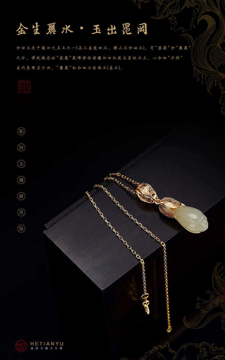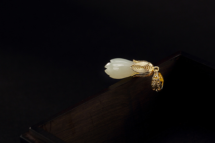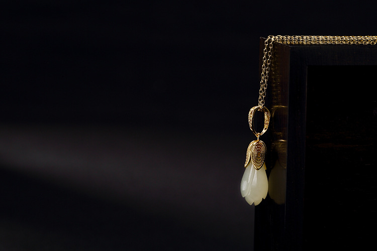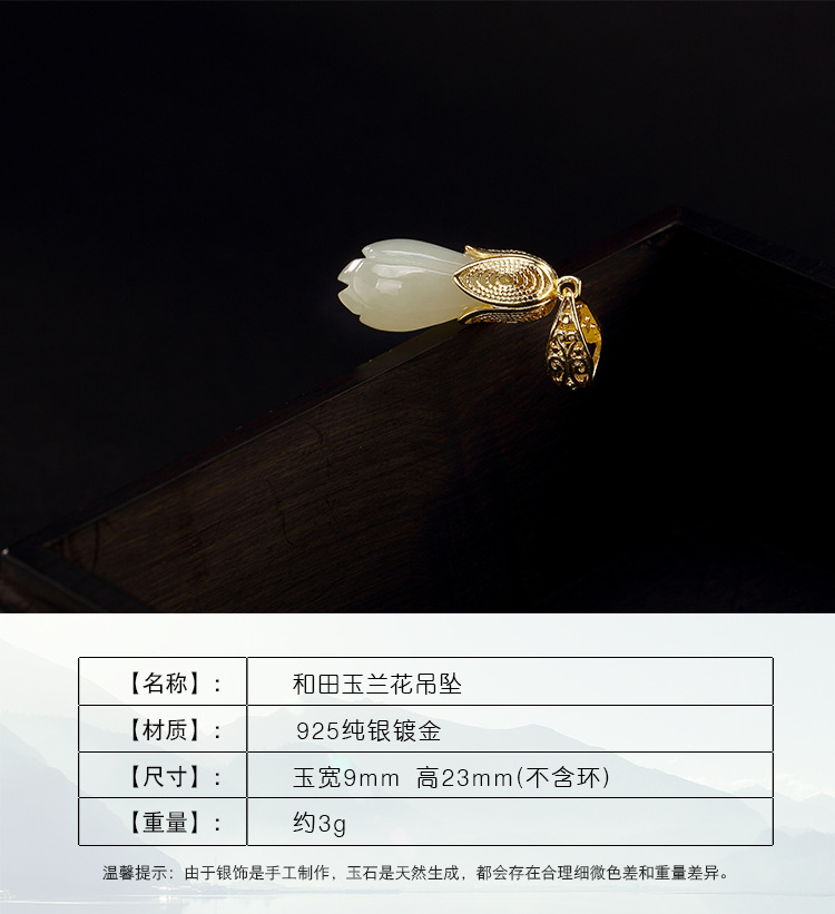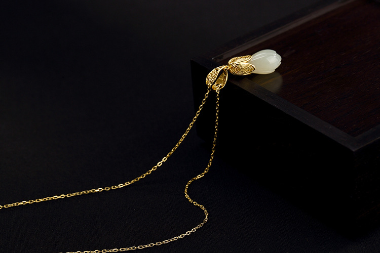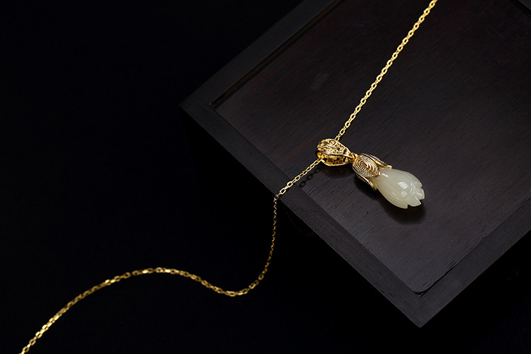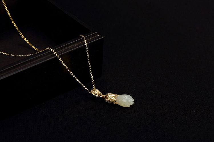 S925纯银镀金掐丝和田玉玉兰花复古百搭项链 CW