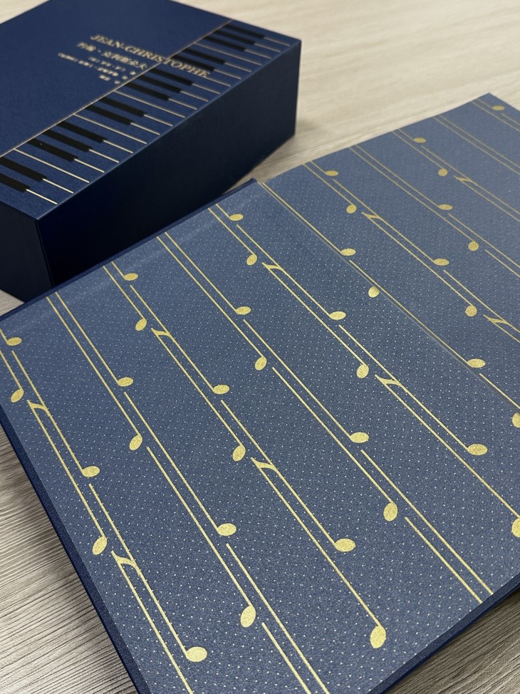 环衬精选艺术纸,金色音符在环衬组成一排钢琴键。