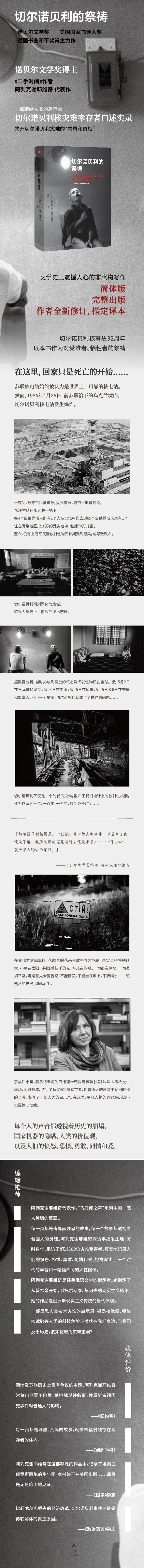 「切尔诺贝利核爆是二十世纪重大的灾害事件,时至今日我还是不解,我所见证的究竟是过去还是未来?……一不小心,就会陷入恐惧的窠臼。」——阿列克谢耶维奇