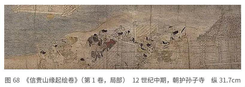 这种戏画的精神和手法,在谢尔曼·李分类为“写实性、讽刺性的故事样式”的绘卷作品中得到了艺术升华,比如12世纪的《鸟兽戏画》《信贵山缘起绘卷》《伴大纳言绘词》等。