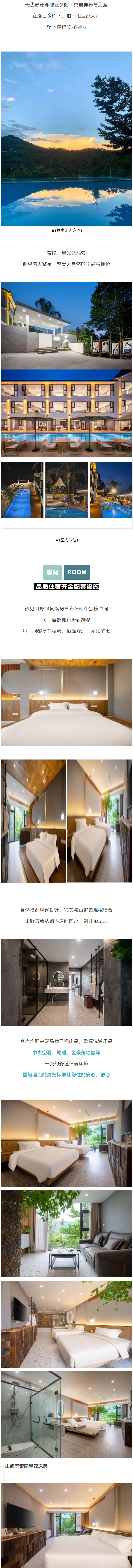 轻奢山景大床/双床房 抢购价:418元 ·轻奢山景大床/双床1间1晚(二选一)1份 ·2大1小营养早餐1份 ·恒温悬崖无边泳池、公共温泉不限次数使用1份 ·立顿红茶2包+雀巢咖啡2包+矿泉水2瓶1份 ·浆板、军旗、围棋、五子棋免费使用1份 ·快乐肥宅水2瓶+红酒一瓶