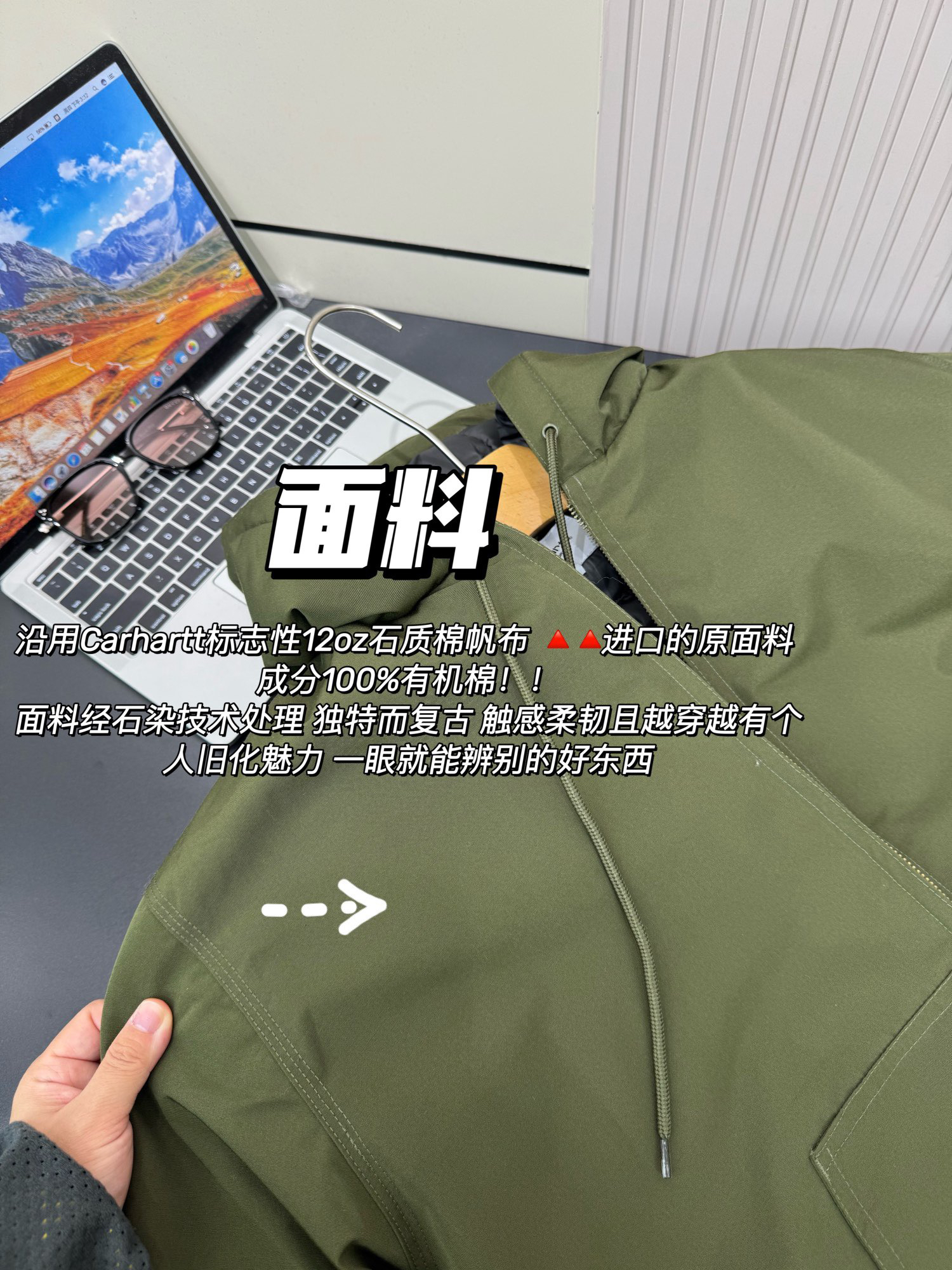 沿用Carhartt标志性12oz石质棉帆布 🔺🔺进口的原面料 成分100%有机棉!!