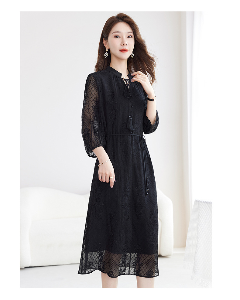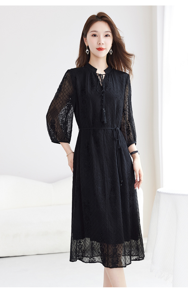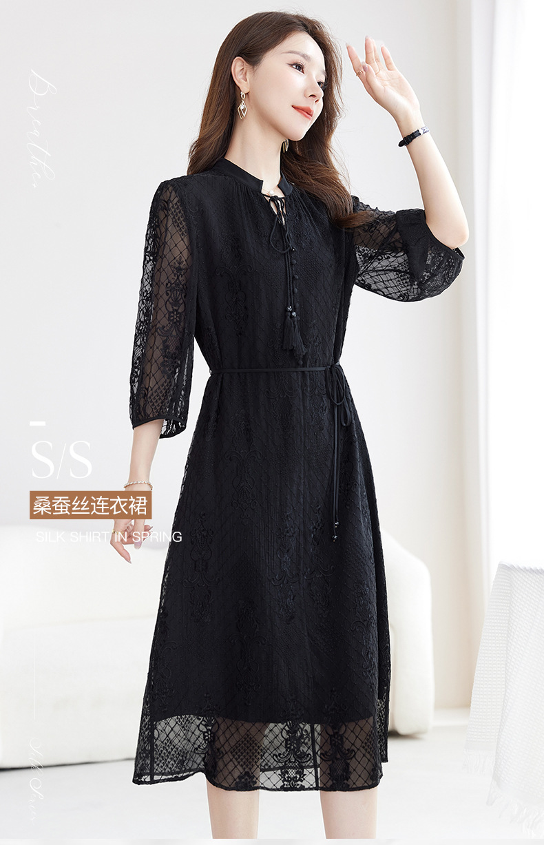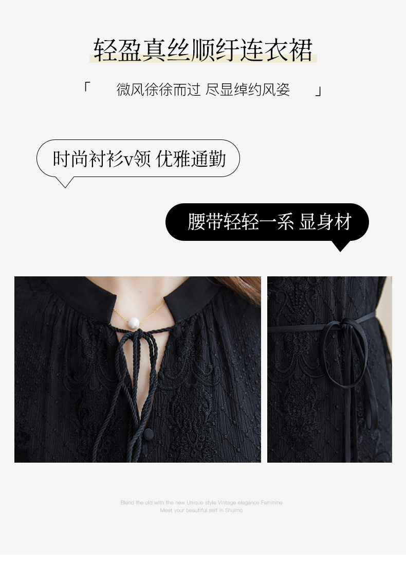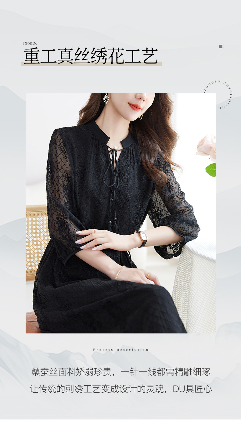 QS-82501031【5A桑蚕丝】中大淑女装100%真丝绣花连衣裙立领收腰中长裙子1031