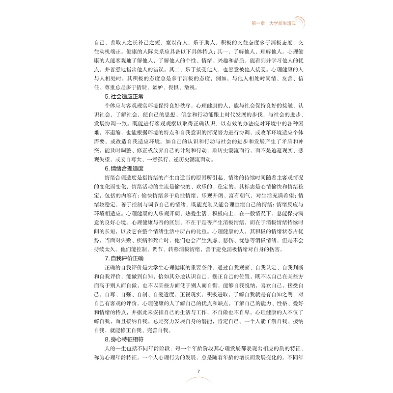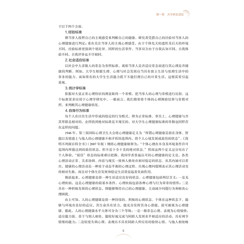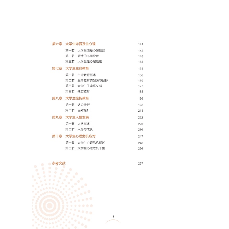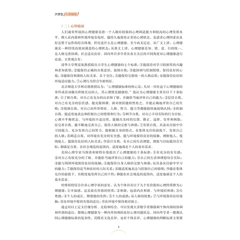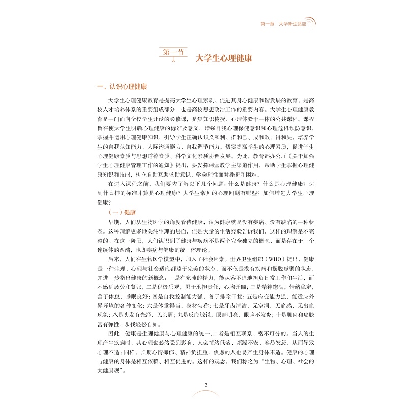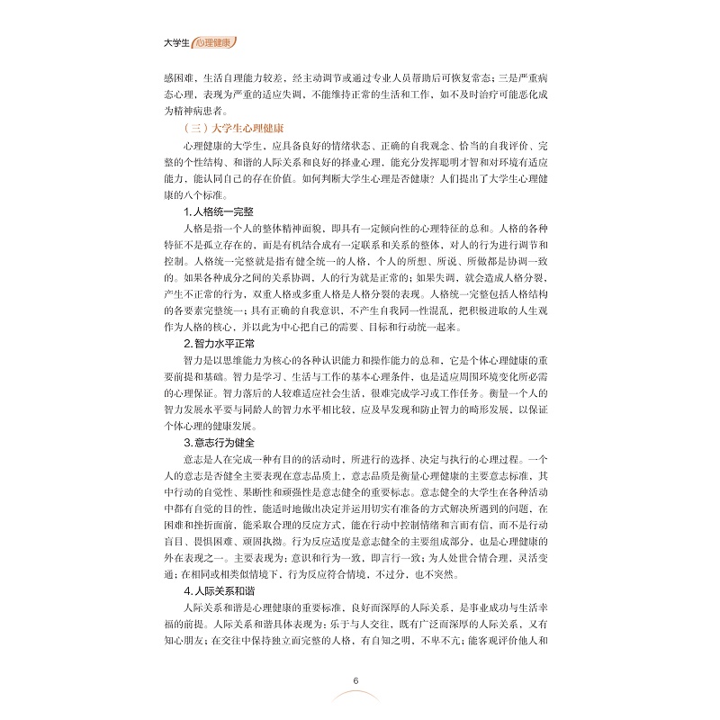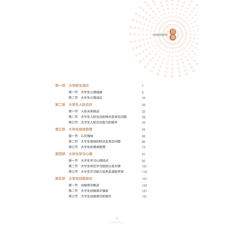 根据《普通高等学校学生心理健康教育课程教学基本要求》,高校学生心理健康教育课程是集知识传授、心理体验与行为训练为一体的公共课程。本教材主要包括十章内容:大学新生适应、大学生人际交往、大学生情绪管理、大学生学习心理、大学生自我意识、大学生爱情心理、大学生生命教育、大学生挫折教育、大学生人格心理、大学生心理危机干预。