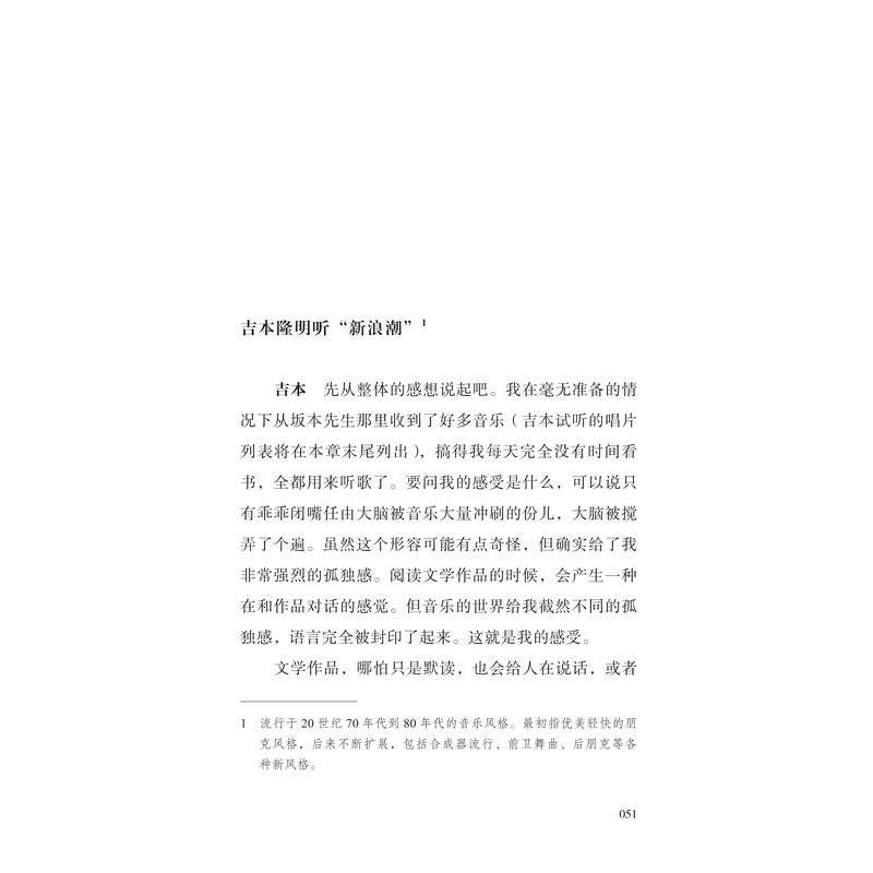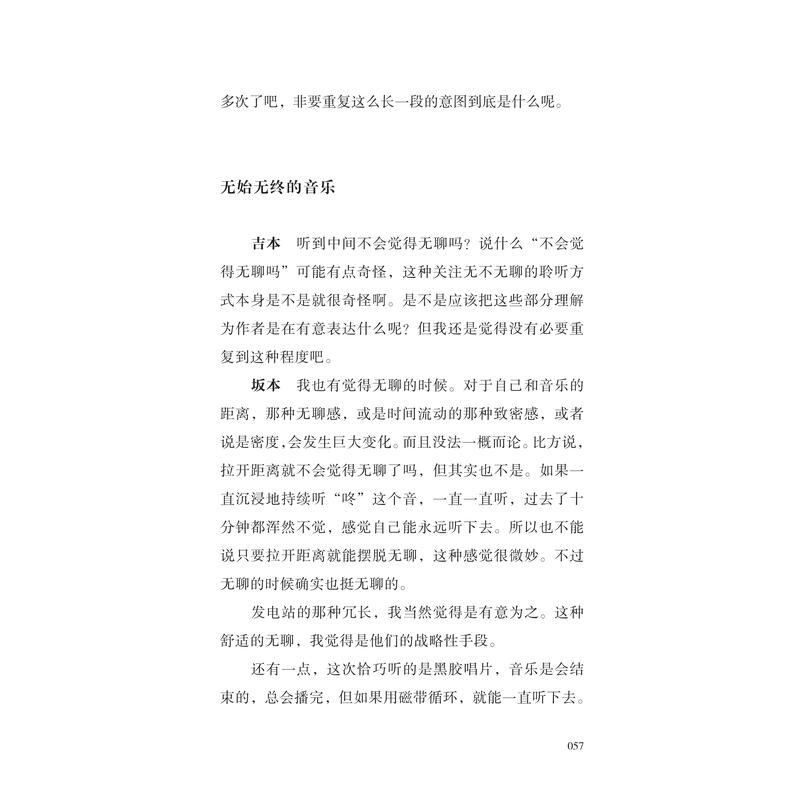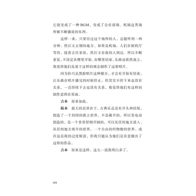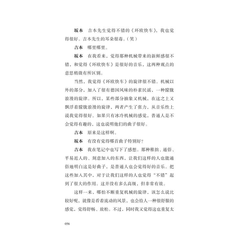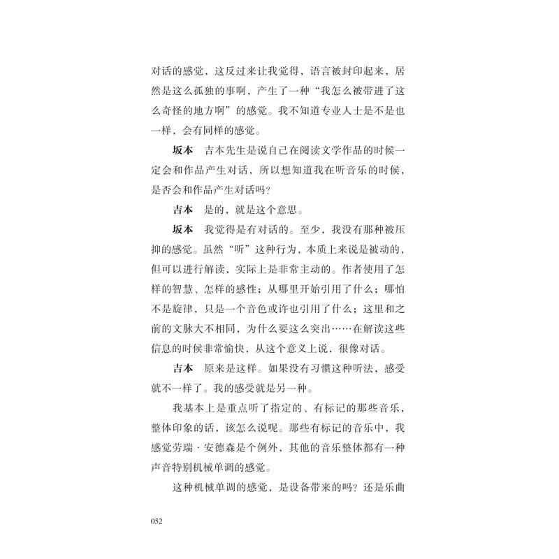 吉本隆明是一位谦逊却敏锐的提问者,他以音乐的外行身份向坂本龙一请教,也引导着他去思考并回答:怎样定位自身所做的音乐,对氛围、噪音、嘻哈、古典、歌谣曲等各种音乐类型有怎样的理解,音乐之路上受到过谁的启发与影响,对同时代诸多音乐人所做的工作又有怎样的见解……这是唯有面对吉本才能到达的话题深度,也让这场对话成为了解坂本龙一音乐理念的重要入口。