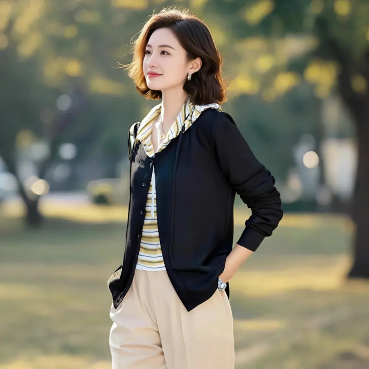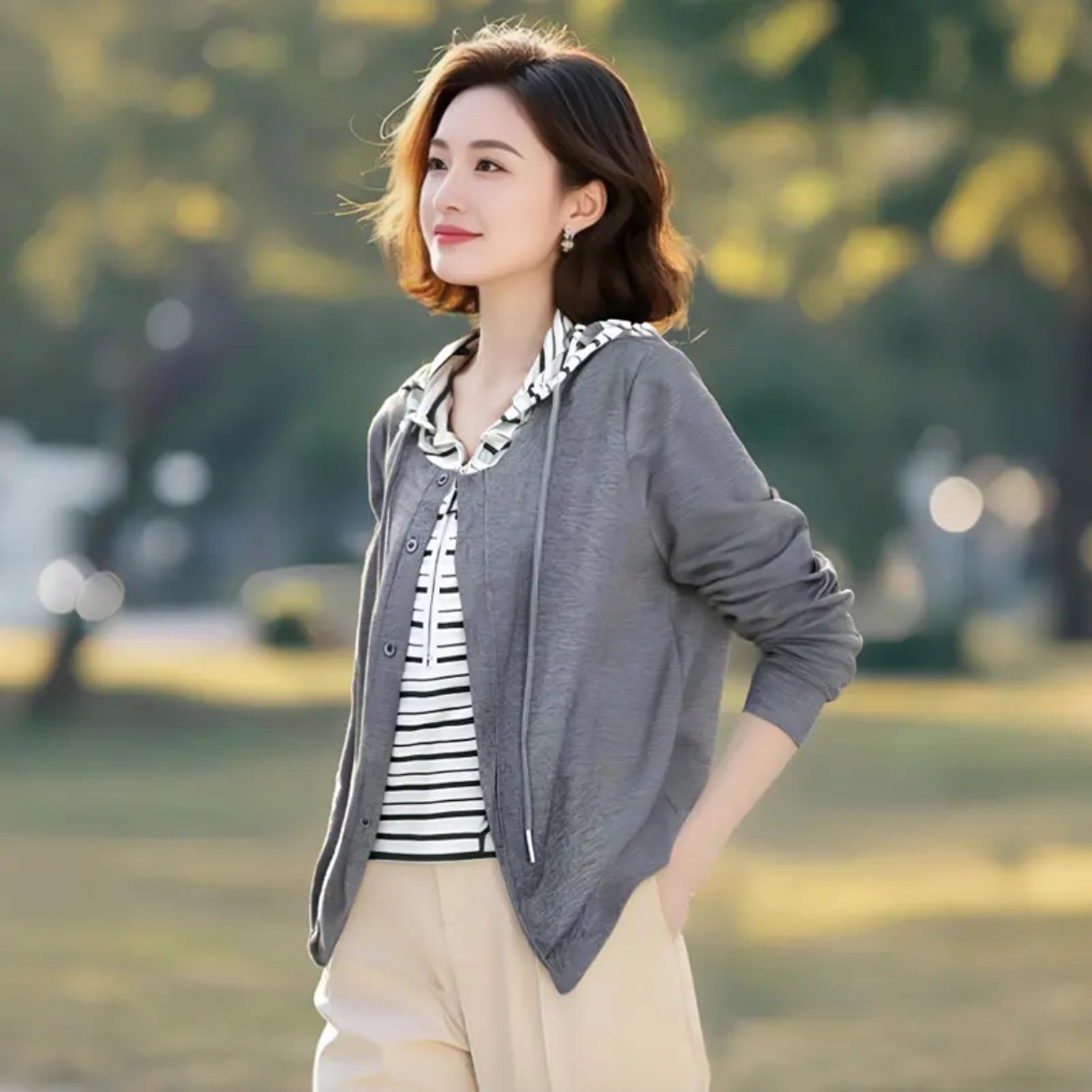 NP-时尚妈妈装假两件连帽条纹卫衣女士2025春秋新款休闲纯色开衫上衣