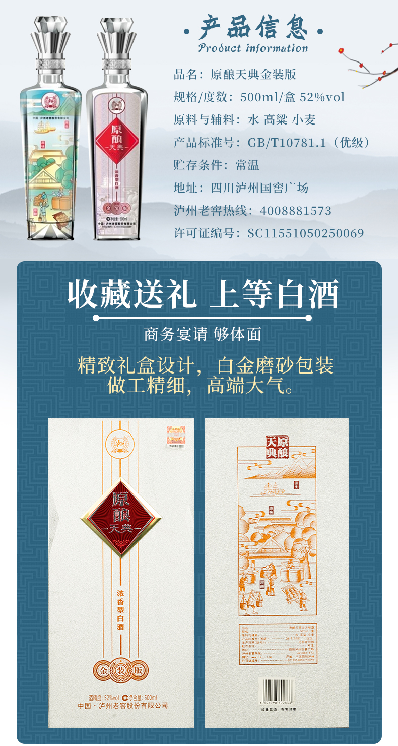 2020年 泸州 原酿天典金装版 浓香型 52度 500ml 单瓶 新老包装随机发