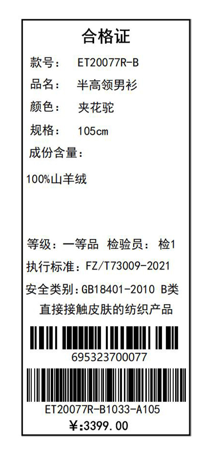 PALUOPO/PL 100%山羊绒 半高领男衫/ET20077R-B/约重366g帕罗