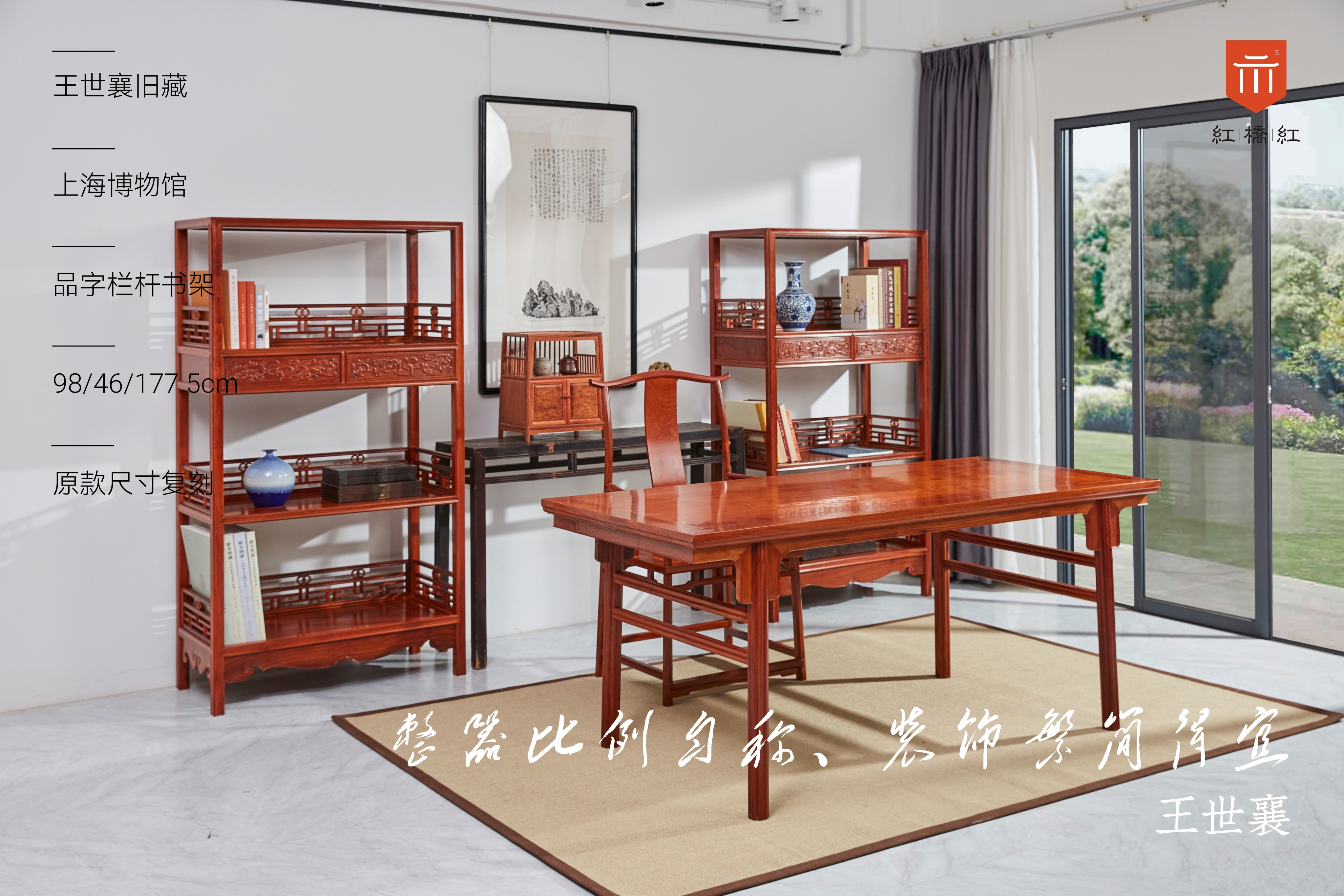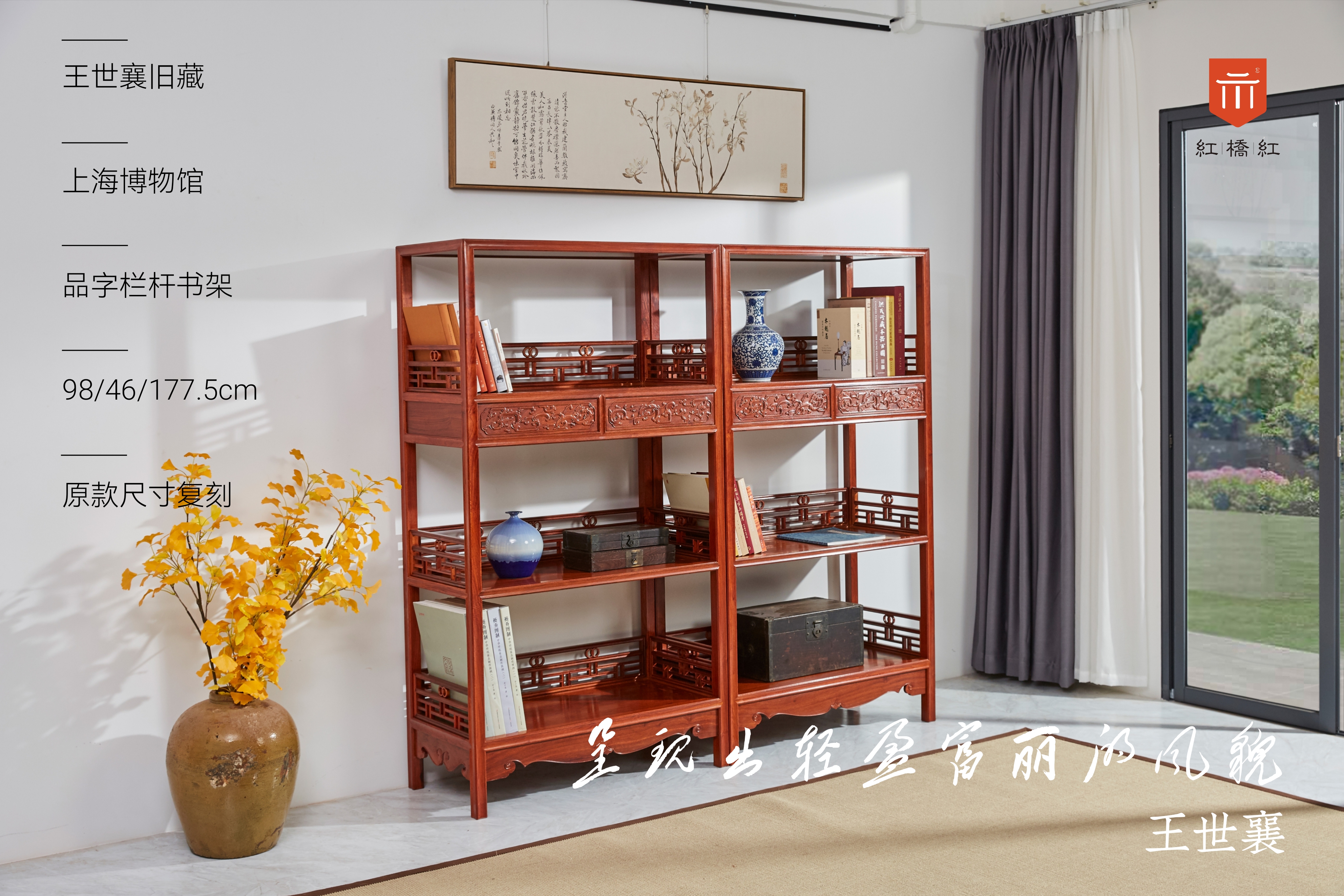 本款缅甸花梨经典复刻攒接品字栏杆架格,为王世襄先生旧藏,收录于《明式家具研究》及《明式家具珍赏》,于上海博物馆可见。