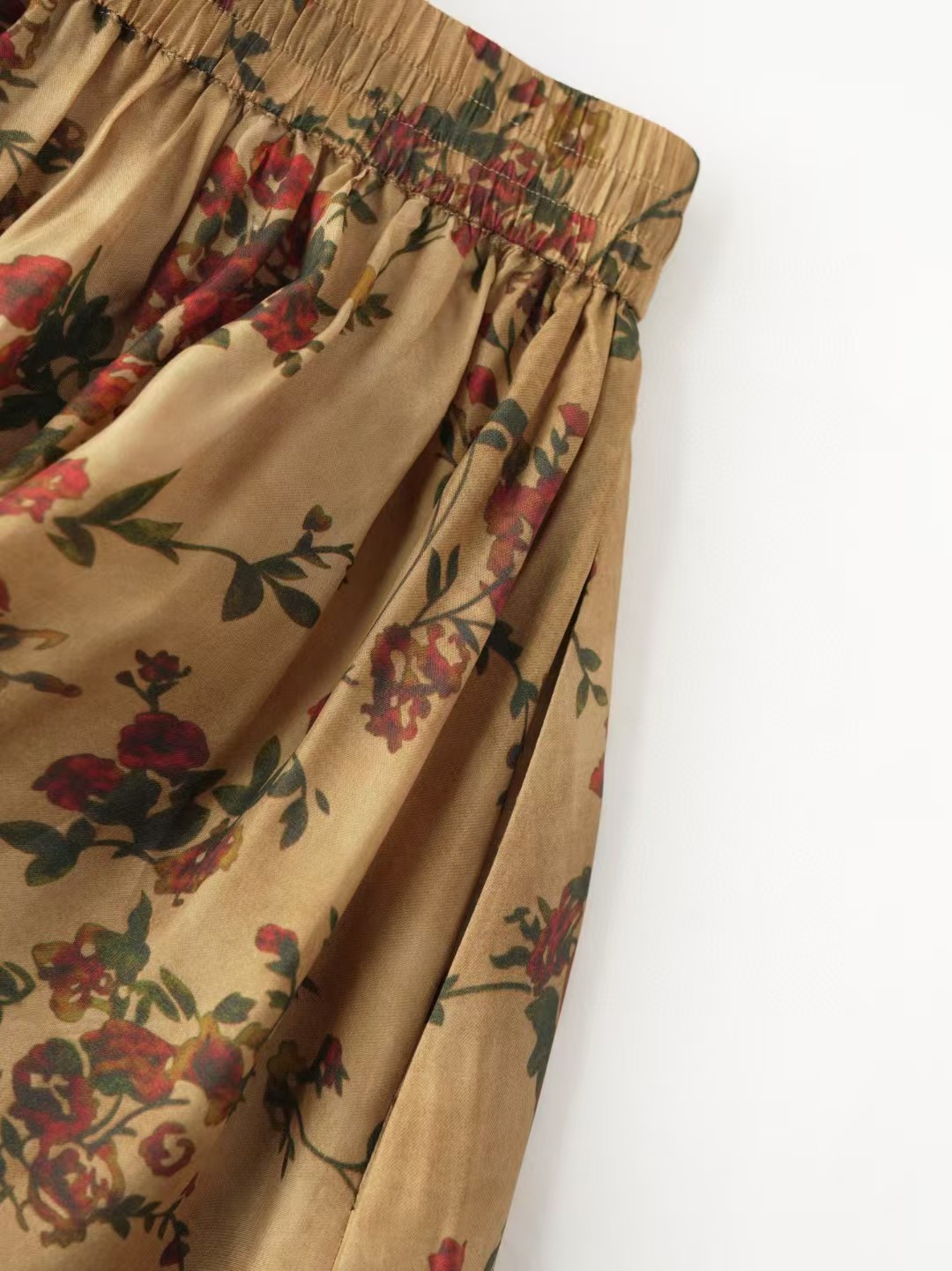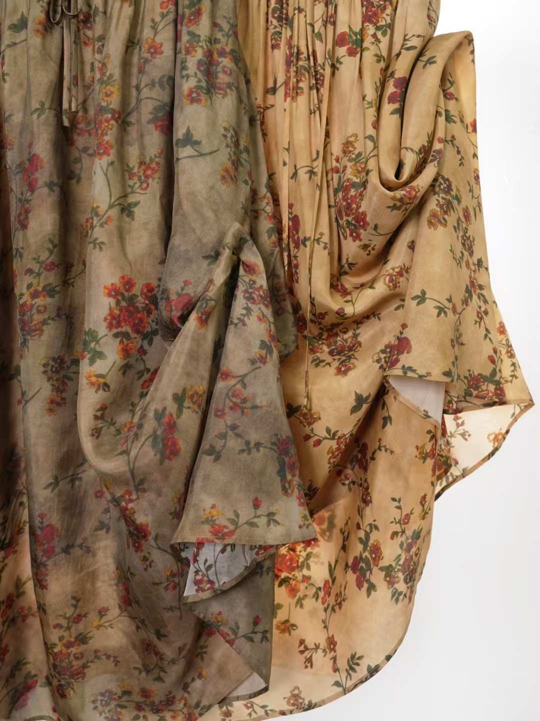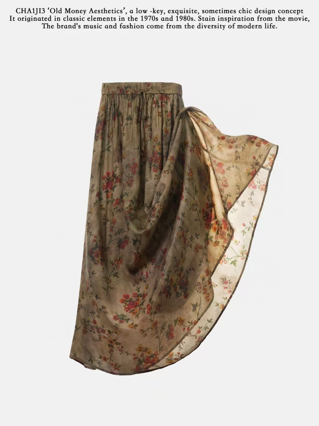 120D铜氨面料经过印花、下水定型呈现绒感的雾面效果,印花工艺的应用,将独特的铁锈花型色彩变化的更为多样,将半裙色彩推向更为丰富的变化中,Umawang的复古感与时尚感,廓形版拖地阔腿裤,沉稳的色彩极具独特效果,知性美感独具魅力,面料手感细腻丝滑,也有挺括的筋骨感,上身体感犹如真丝一般贴肤舒适,裁剪完美的廓形线条,松弛有度极简优雅,松紧腰身毫无拘束的包容性,持久耐用,休闲、旅游、通勤、率性的气质搭配很好的结合在一起,驾驭时尚,与众不同