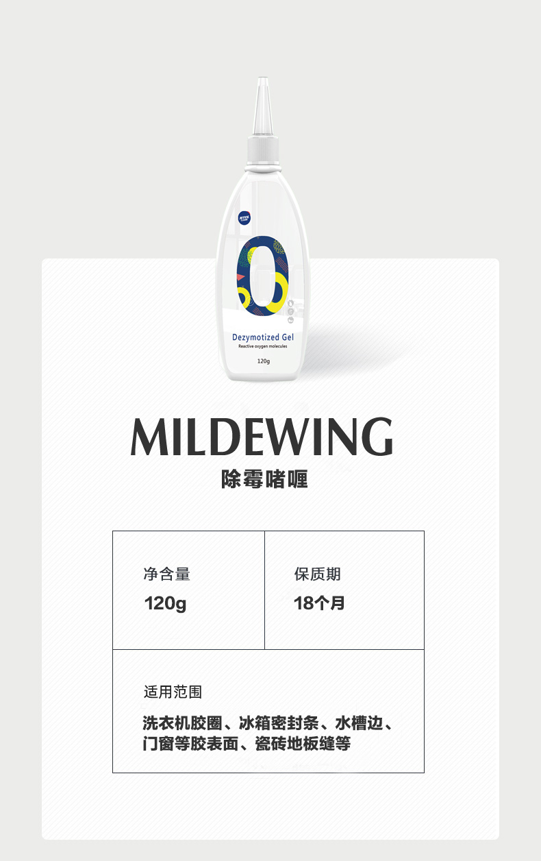 除霉啫喱:洗衣机胶圈、冰箱密封条、水槽边、门窗等胶表面、瓷砖地板缝