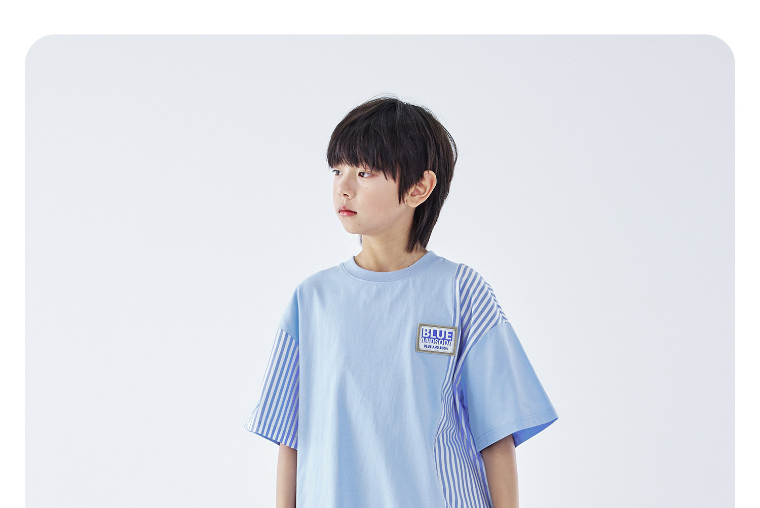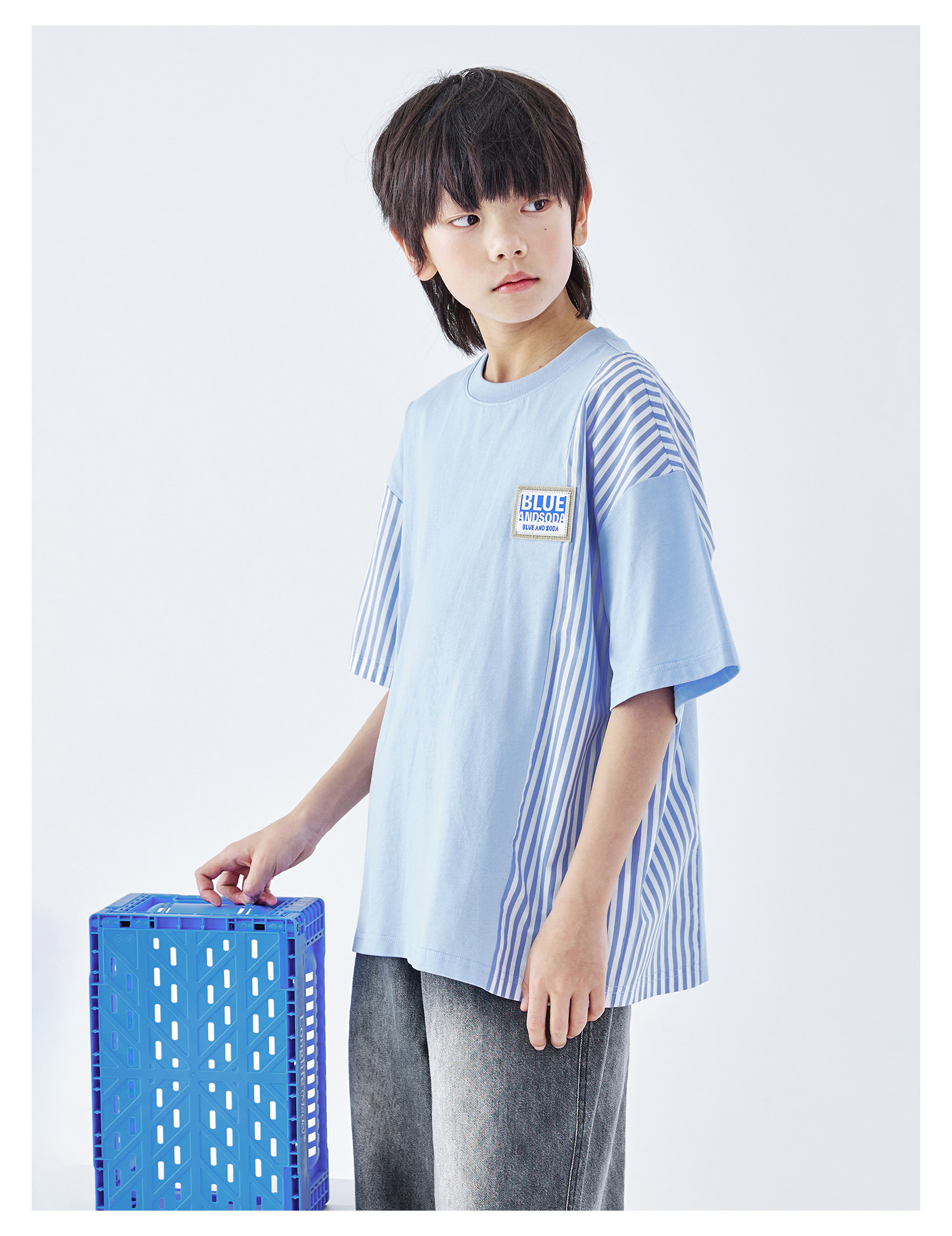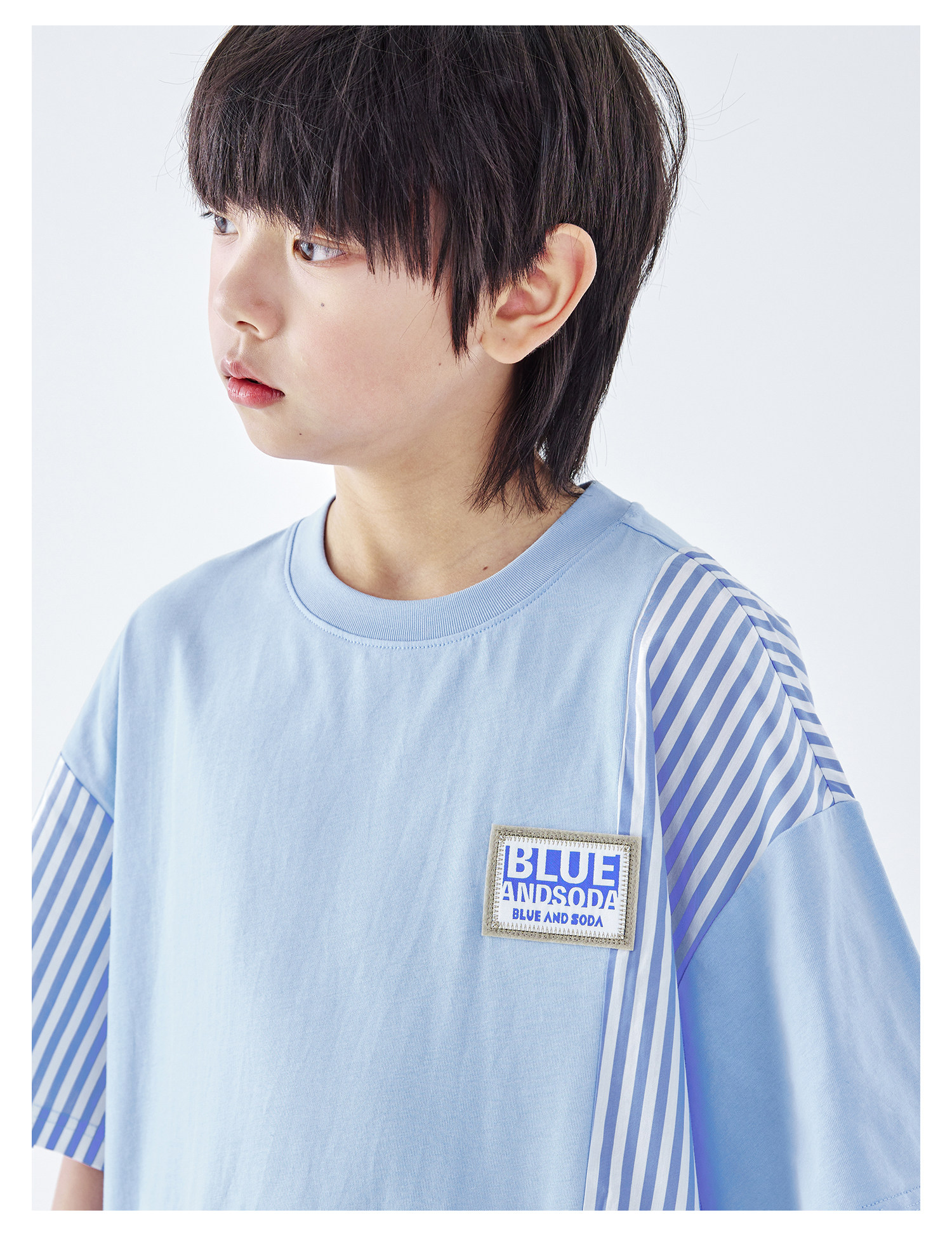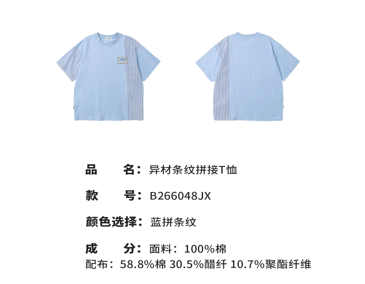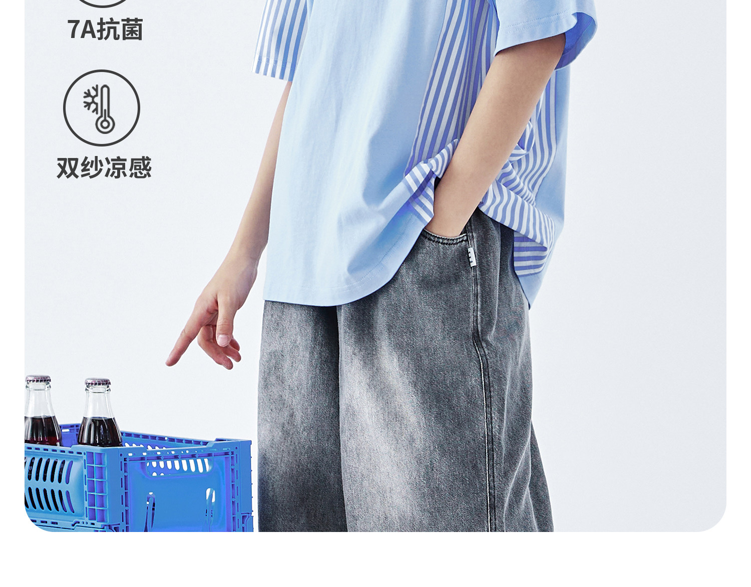 蓝汽水2026夏季新品男童条纹拼接上衣青少年凉感抗菌时尚短袖T恤