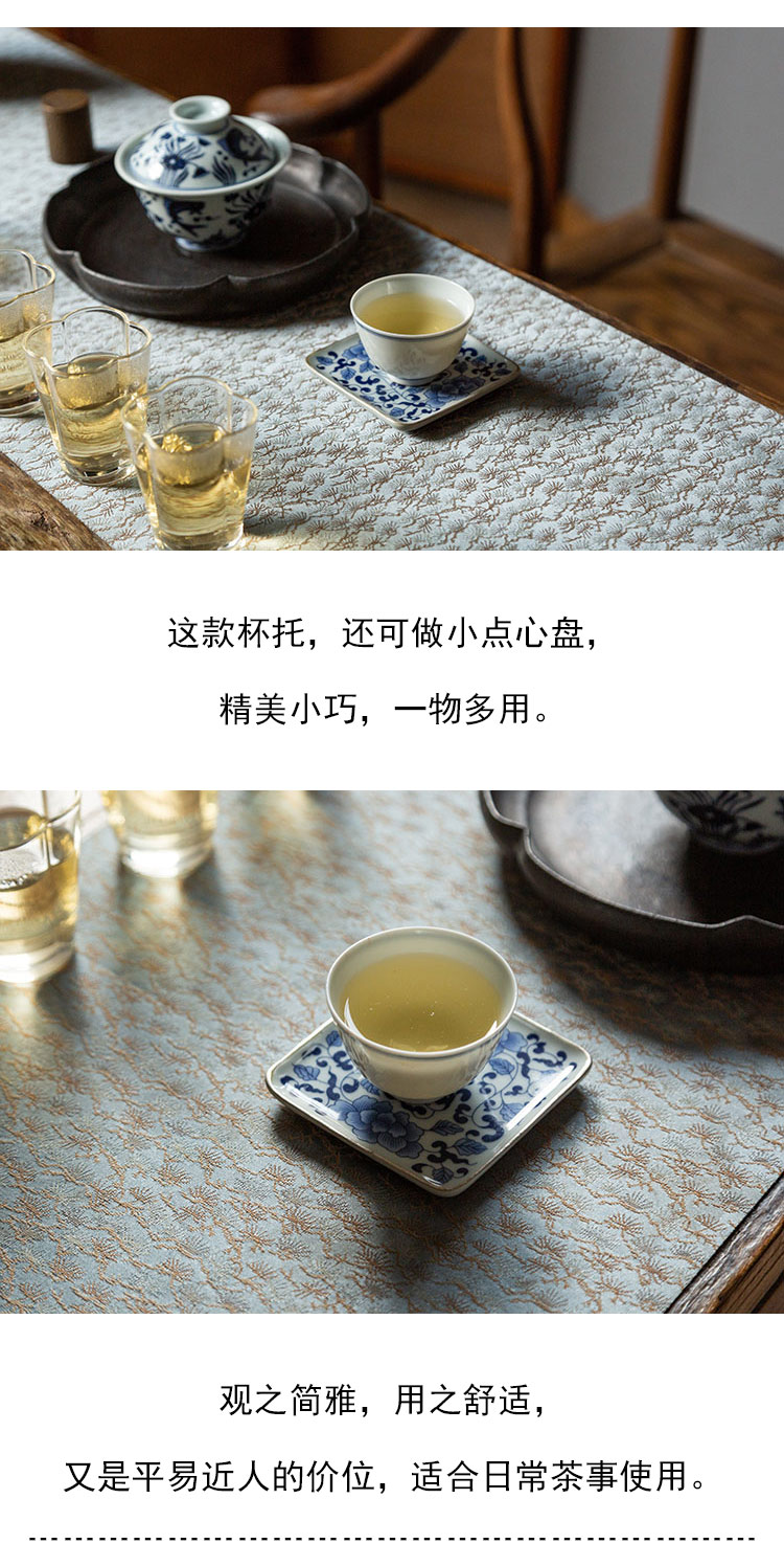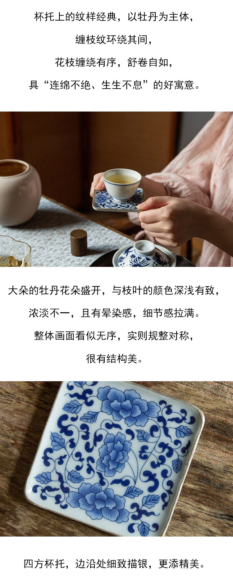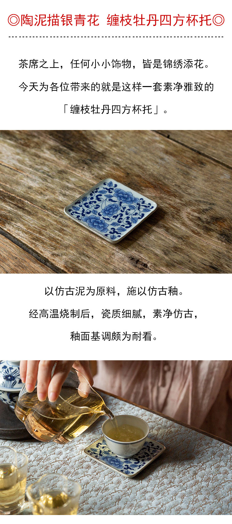 茶香记 陶泥描银青花 缠枝牡丹四方杯托 简雅实用 点心盘 杯垫