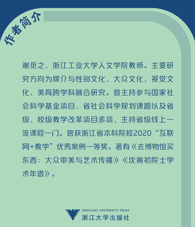 谢觅之,浙江工业大学人文学院教师。主要研究方向为媒介与性别文化、大众文化、视觉文化、美育跨学科融合研究。曾主持参与国家社会科学基金项目、省社会科学规划课题以及省级、校级教学改革项目多项,主持省级线上一流课程一门。曾获浙江省本科院校2020“互联网+教学”优秀案例一等奖。著有《去博物馆买东西:大众审美与艺术传播》《沈寅初院士学术年谱》。