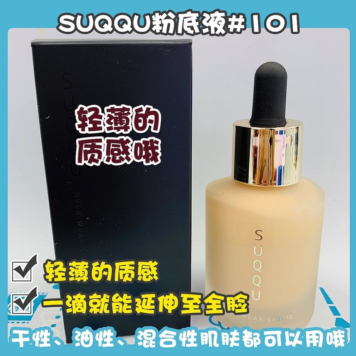 SUQQU粉底液#101👍新款Suqqu粉底液,轻薄的质感适合春夏季节,一滴就能延伸至全脸💧,不会给肌肤带来过重的负担感💆。水润美容液质地💦,油层和水层2层,但用前记得摇一摇哦❗通透性和轻薄程度特别好,💁干性、油性、混合性肌肤都可以用哦~☑不闷痘、不卡粉、好推开、持久性强。妆感是水光般的奶油肌〰带给你天生好皮肤的妆感~妥妥的,春夏强推🉑!#101是黄调最白,适合偏白皙肤色的小姐姐