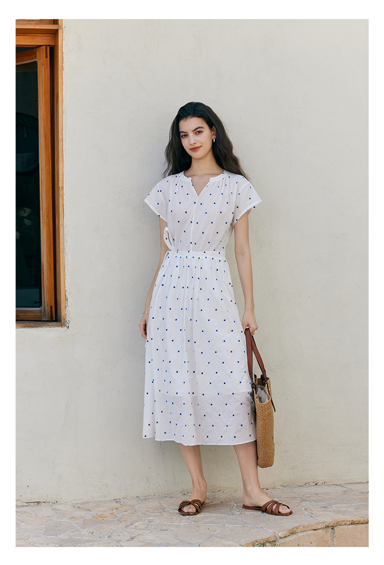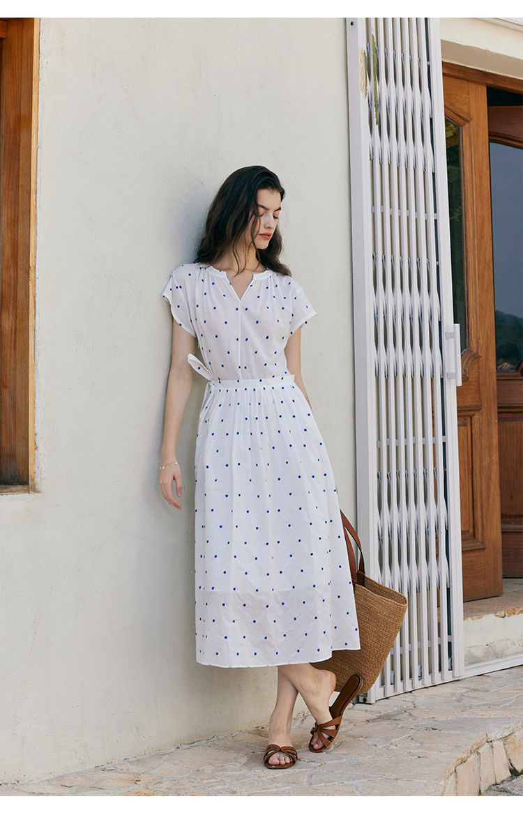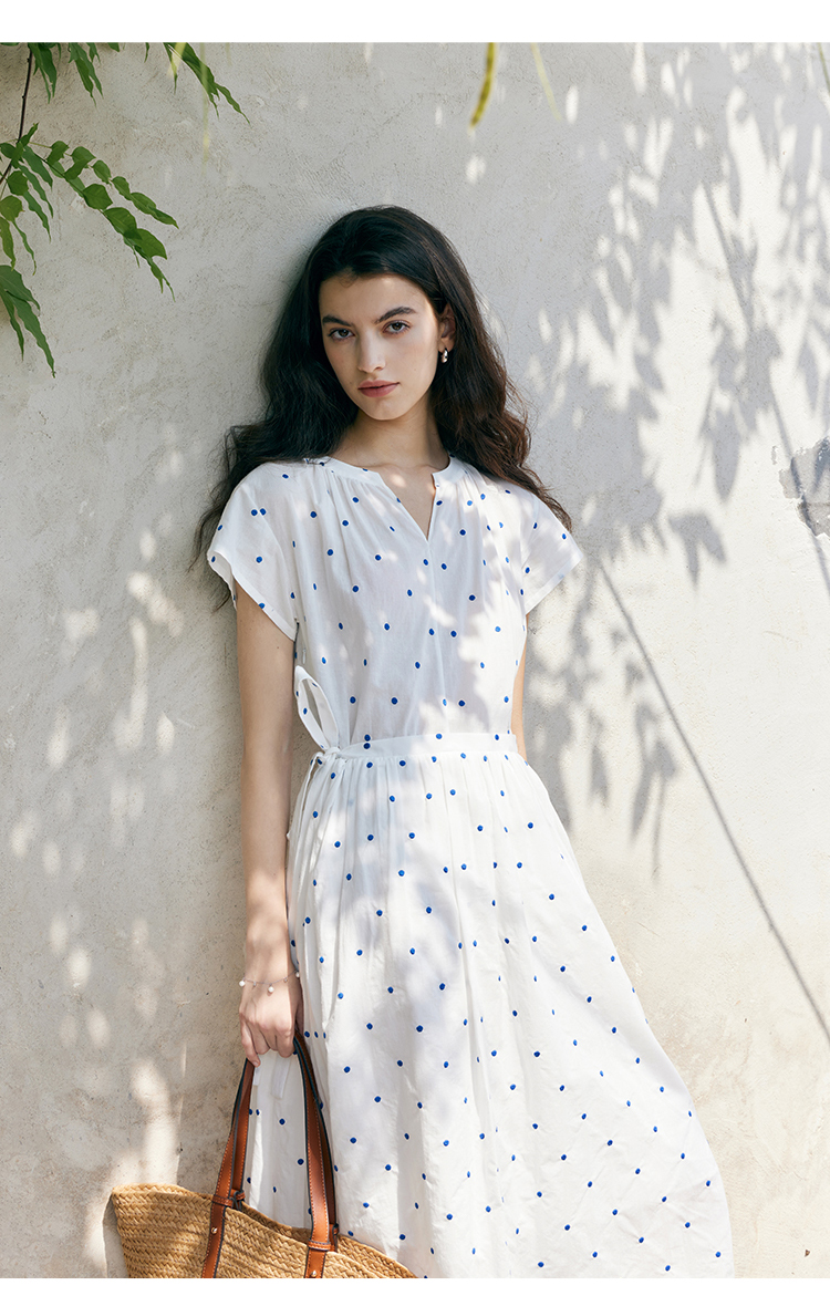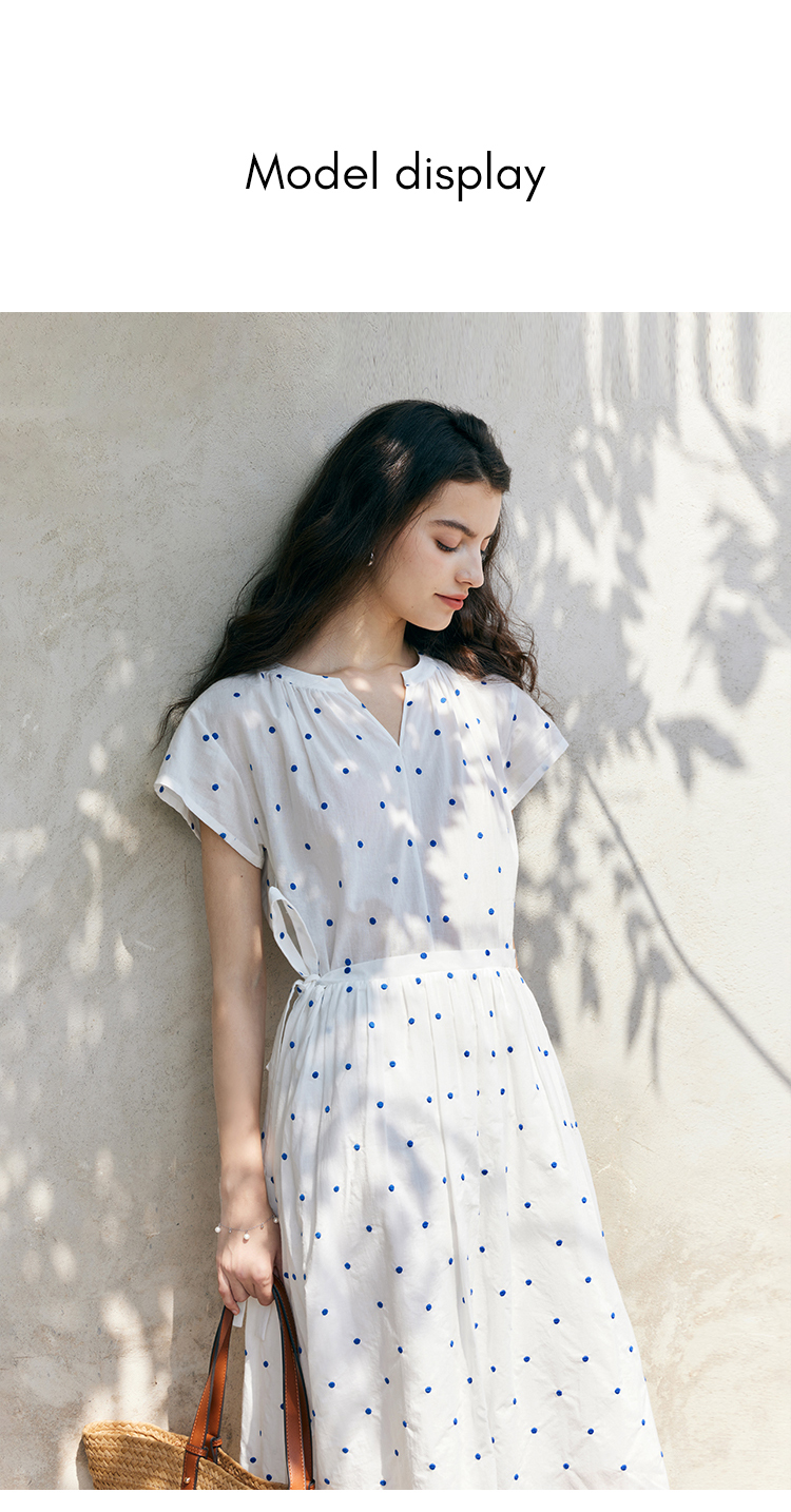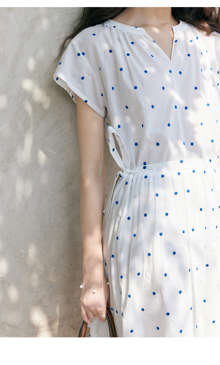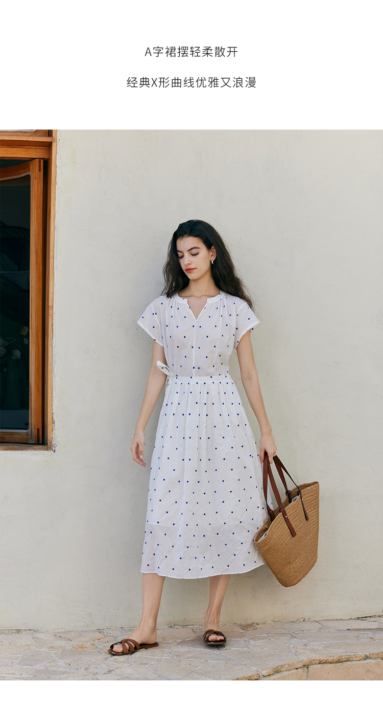 (小眠专属)HeyDress蓝色波点连衣裙女夏季法式V领收腰显瘦设计气质田园裙子