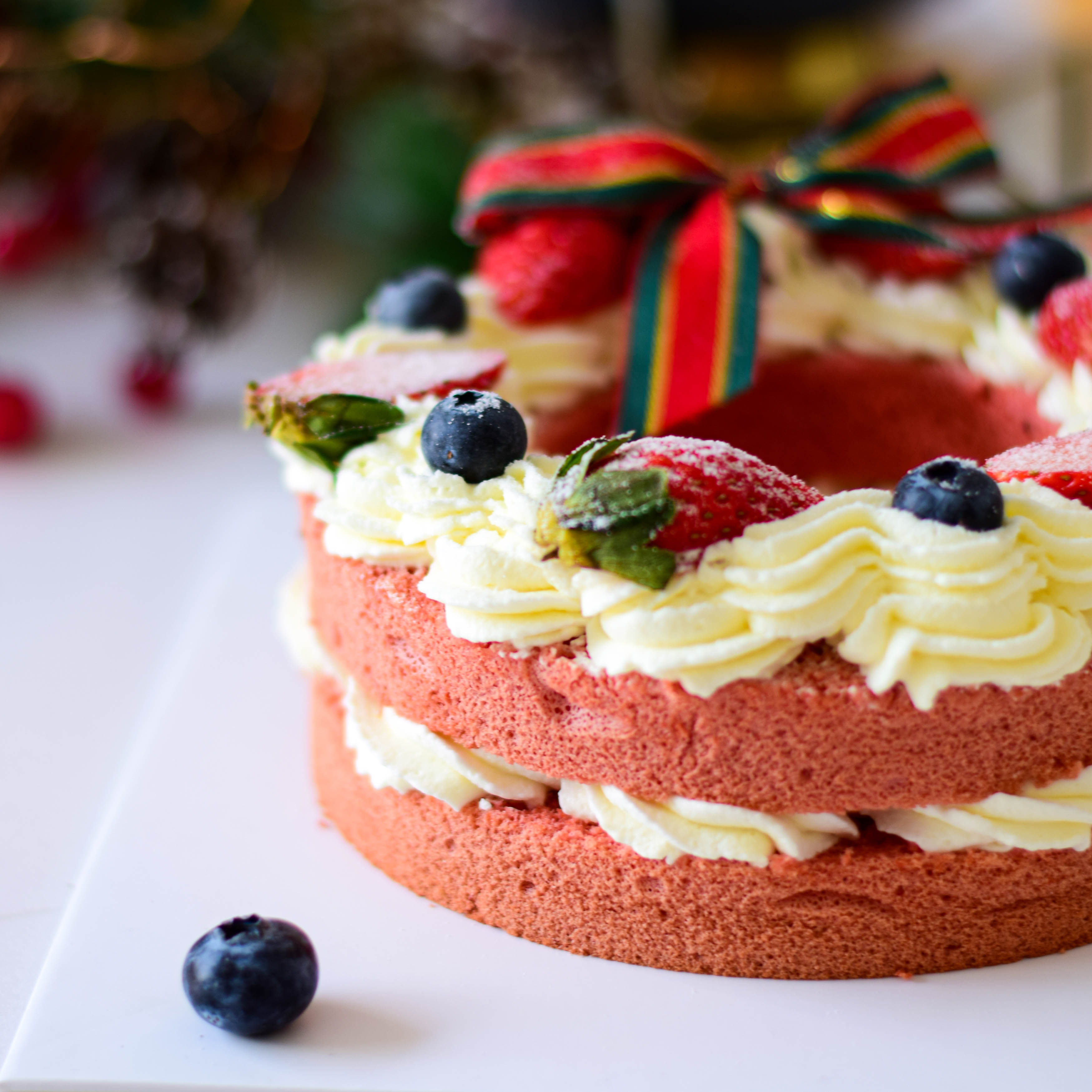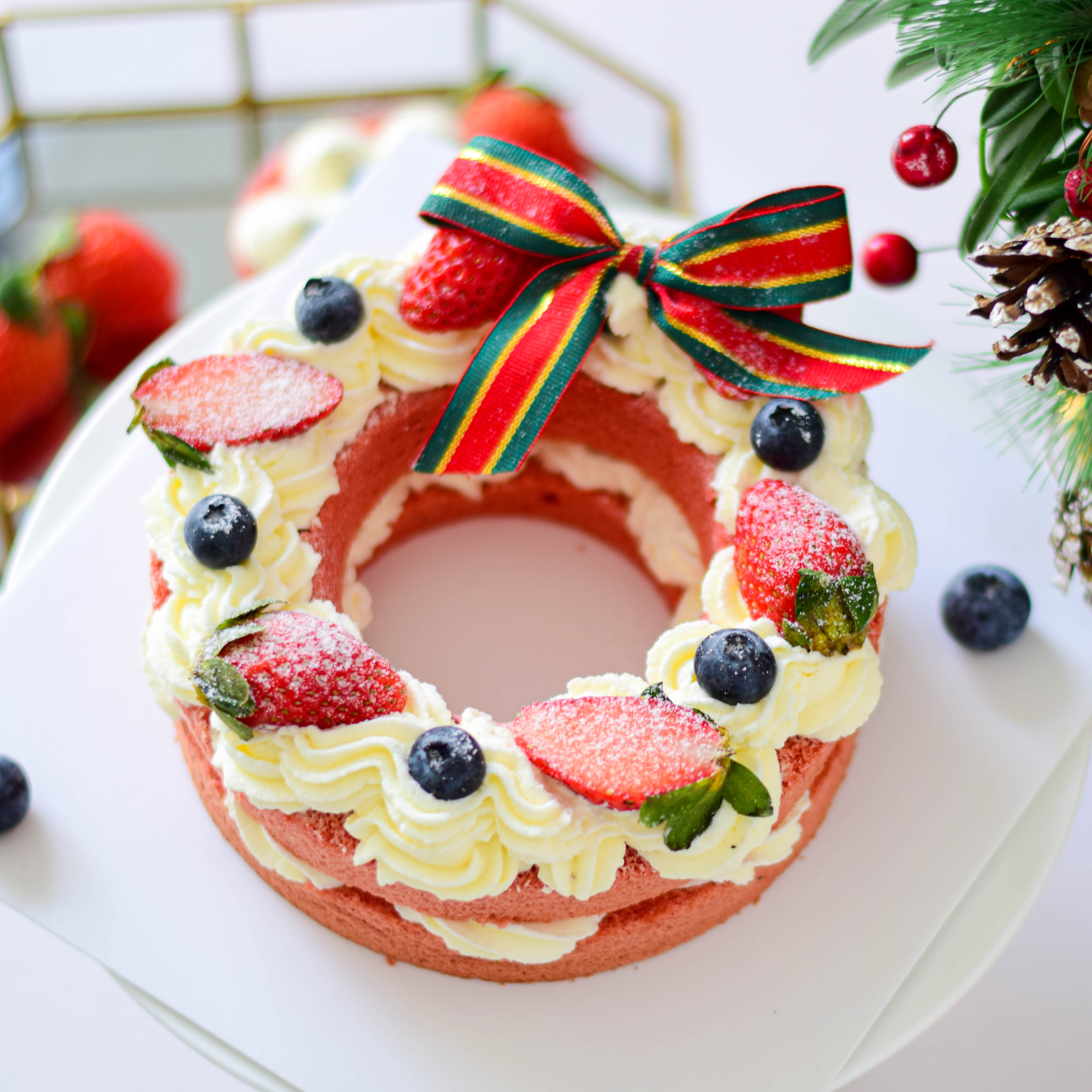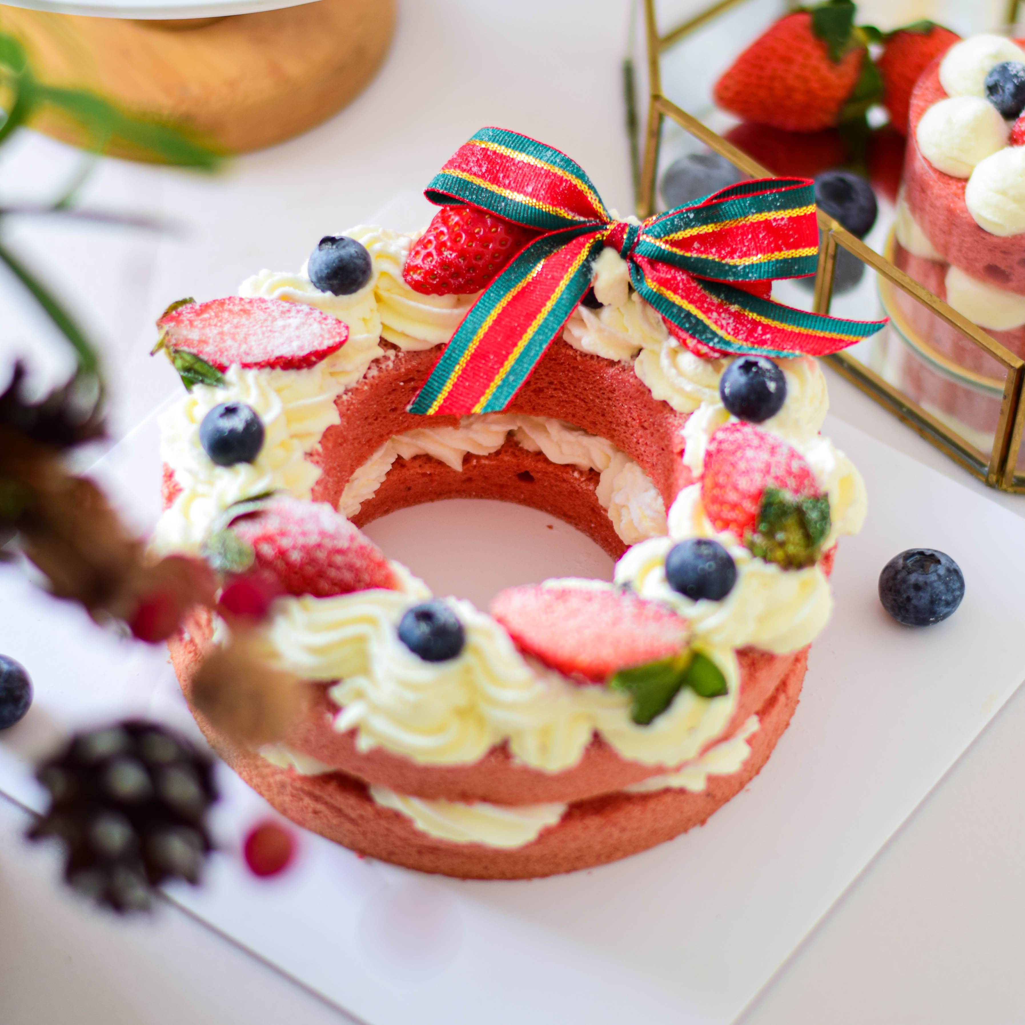 主要原料 法国进口淡奶油、小麦粉(荷兰)、纯牛奶(荷兰)、幼砂糖(韩国)、红曲粉、奶油草莓、蓝莓