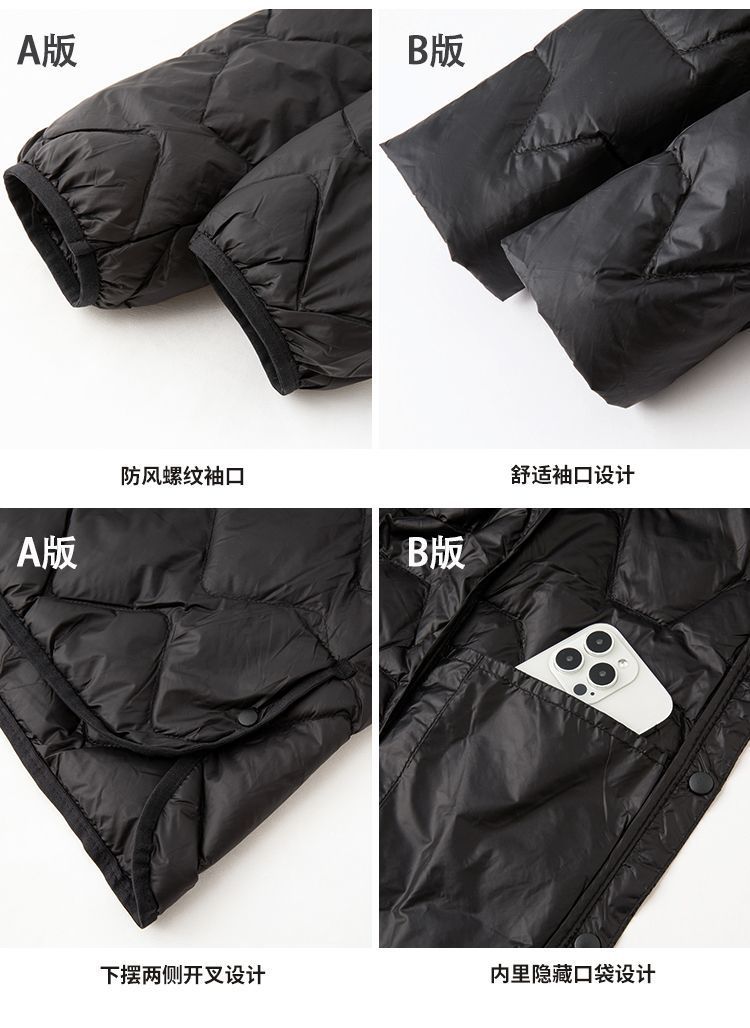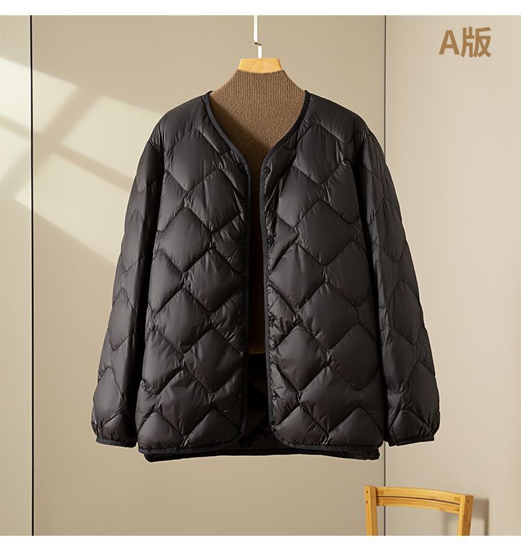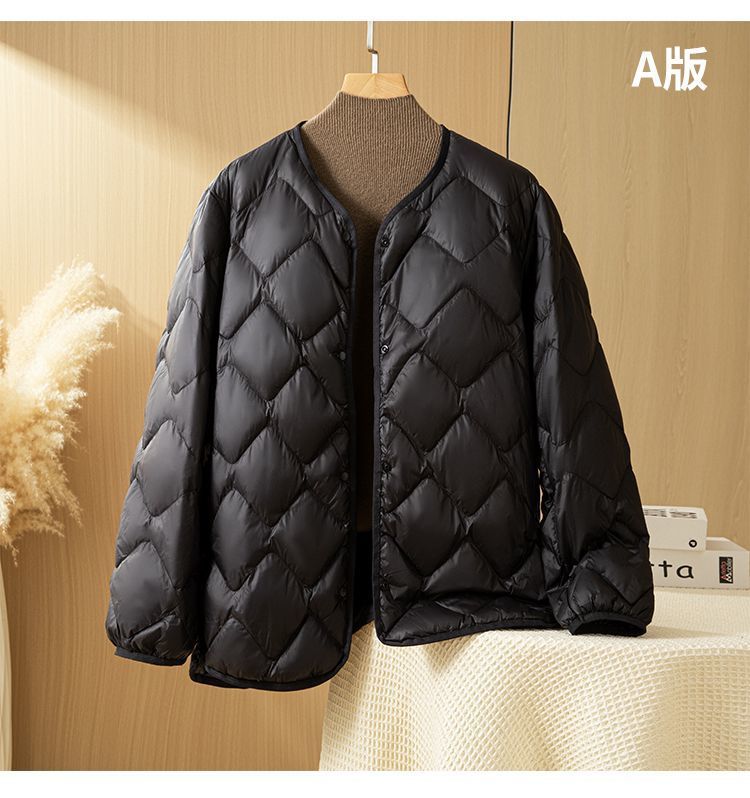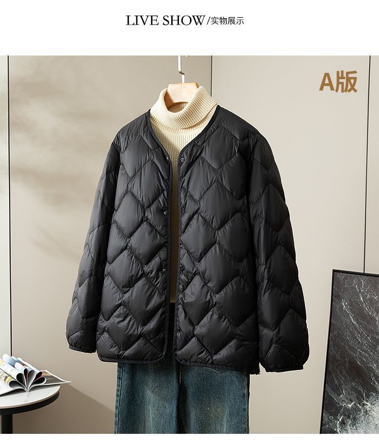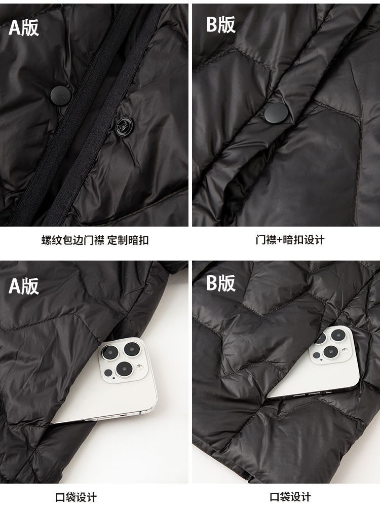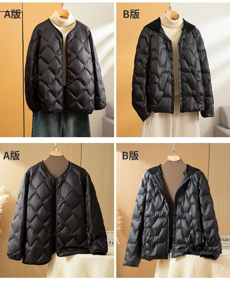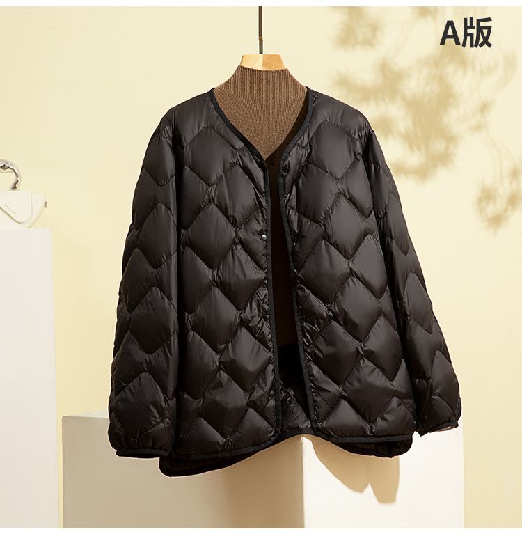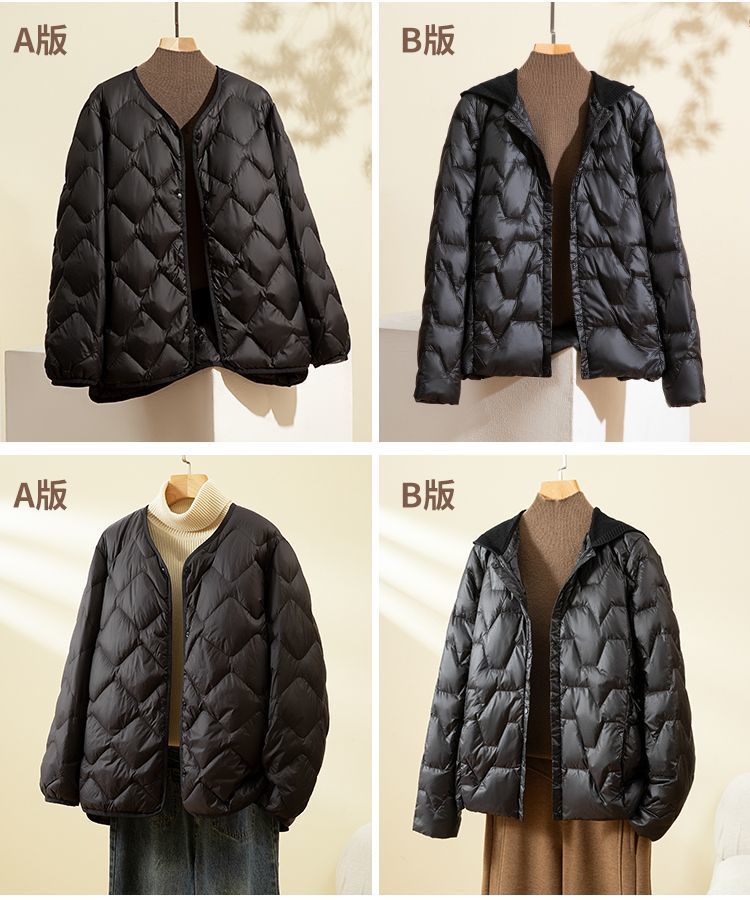 丁摩新款V领羽绒服女士轻薄宽松加大码内胆白鸭绒连帽外套AL