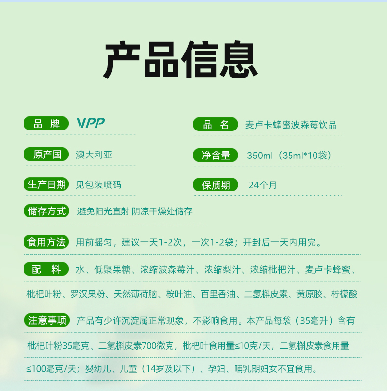 澳大利亚原装进口VPP麦卢卡蜂蜜波森莓饮
