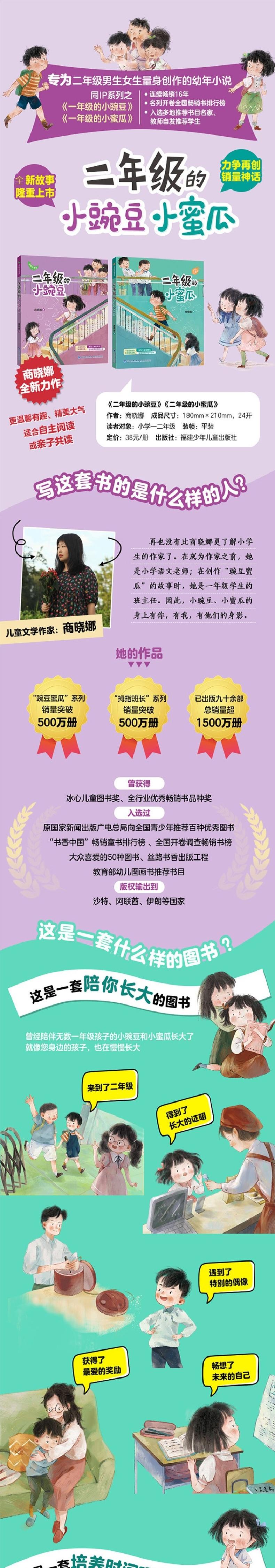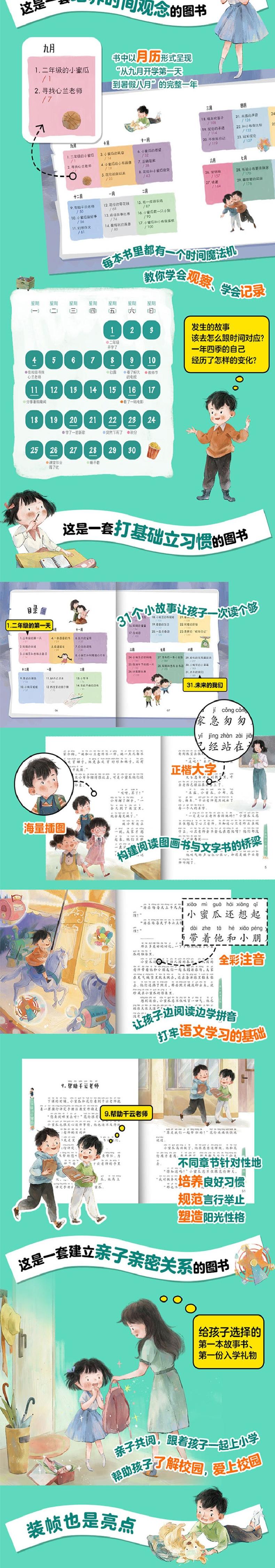 这是儿童文学作家商晓娜继《一年级的小蜜瓜》之后,专为二年级小学生写的校园类儿童文学读物。随着小蜜瓜升学成为二年级的小学生,他在新班主任千云老师的带领下,和花伦、格本、米露、小布等小伙伴们一起,在丰富多彩的校园生活中继续成长。全书共有三十一个小故事,全彩注音,画面精美,符合当代小学生的阅读审美,是一本适合小学低年级学生亲子共读或自主阅读的优秀读物。