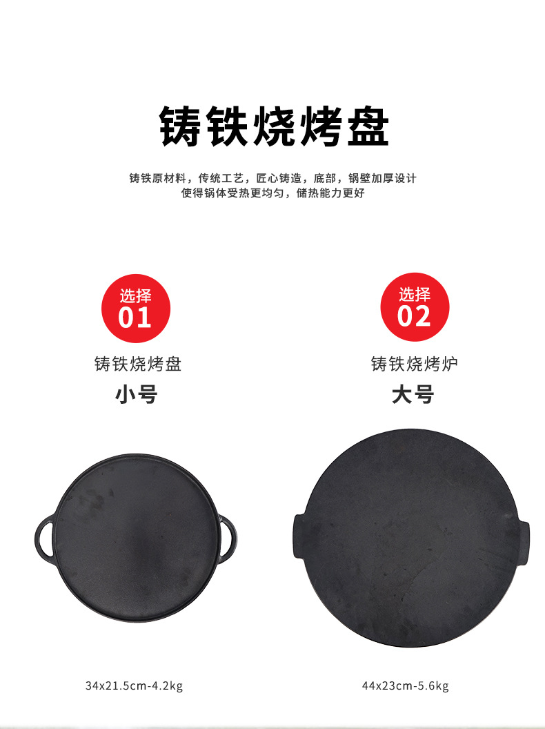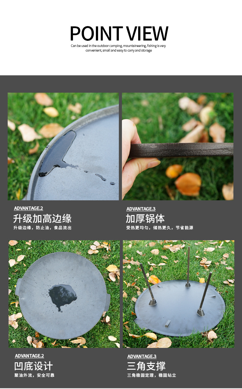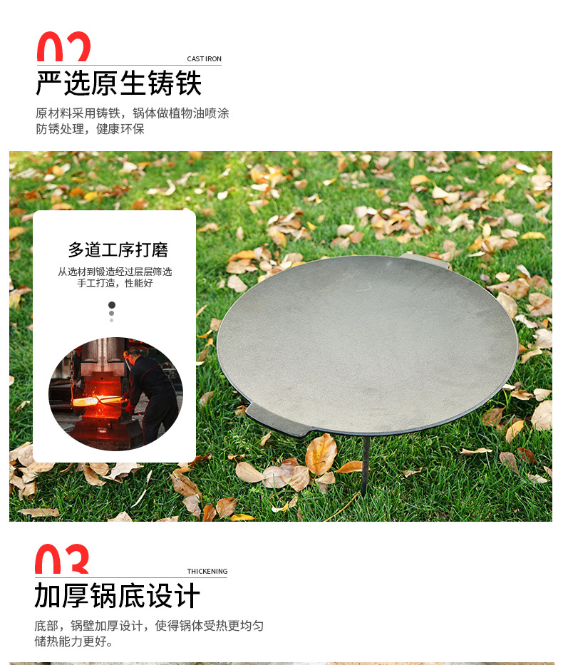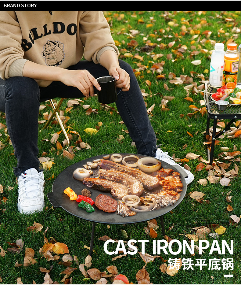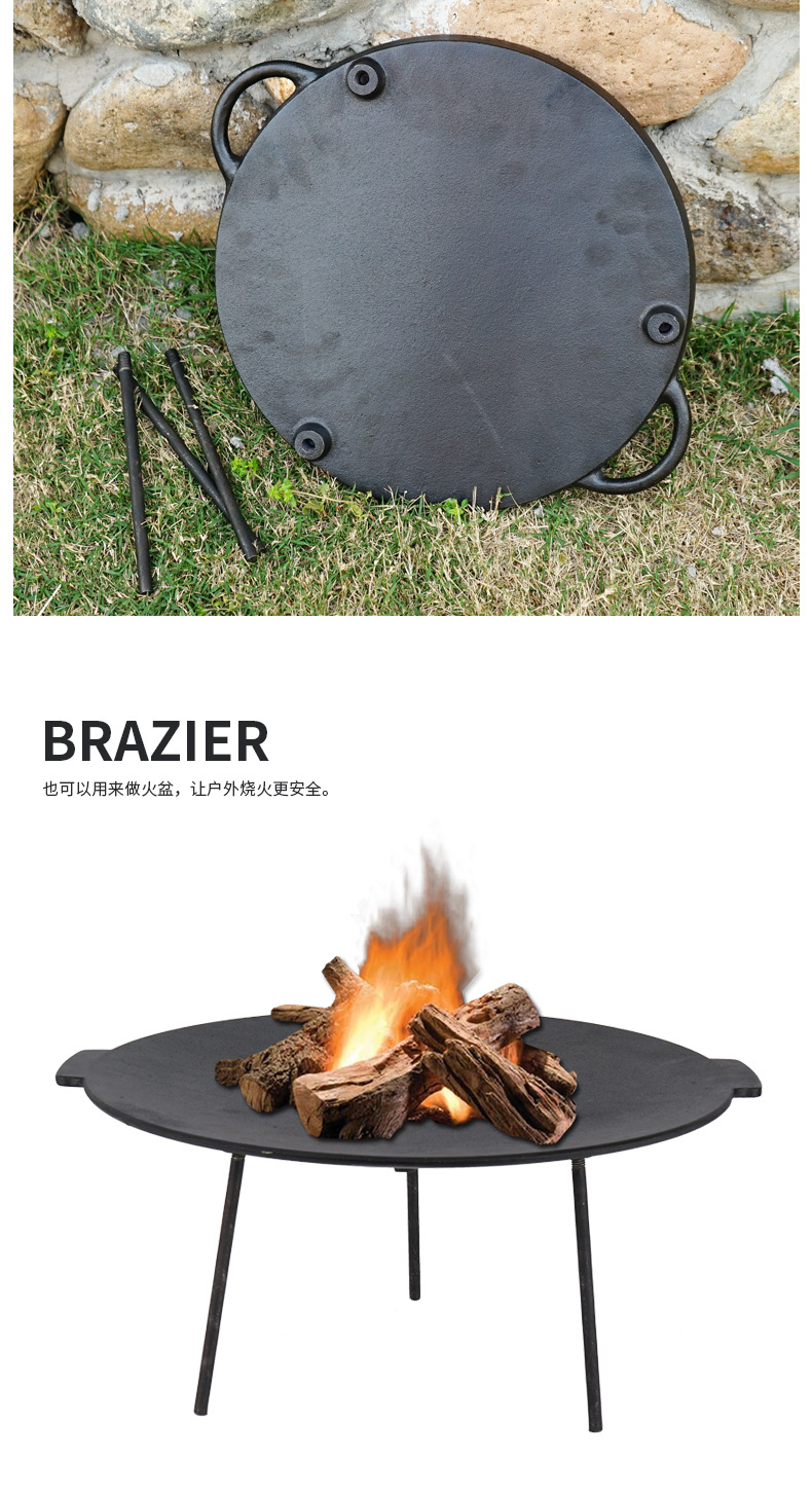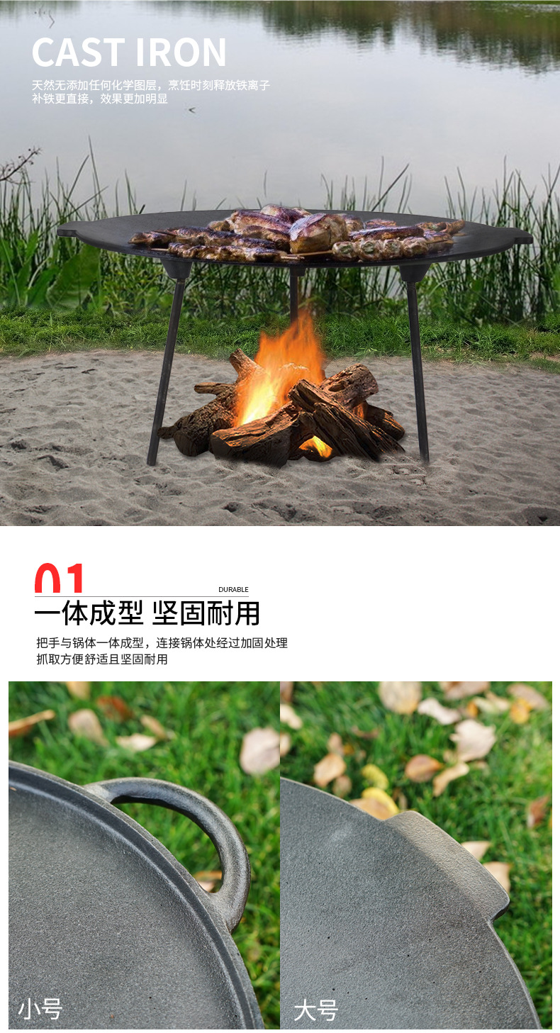 「户外露营烧烤盘」大型饼坑铸铁平底锅 野营煎锅 自驾游铸铁烤炉烤肉架