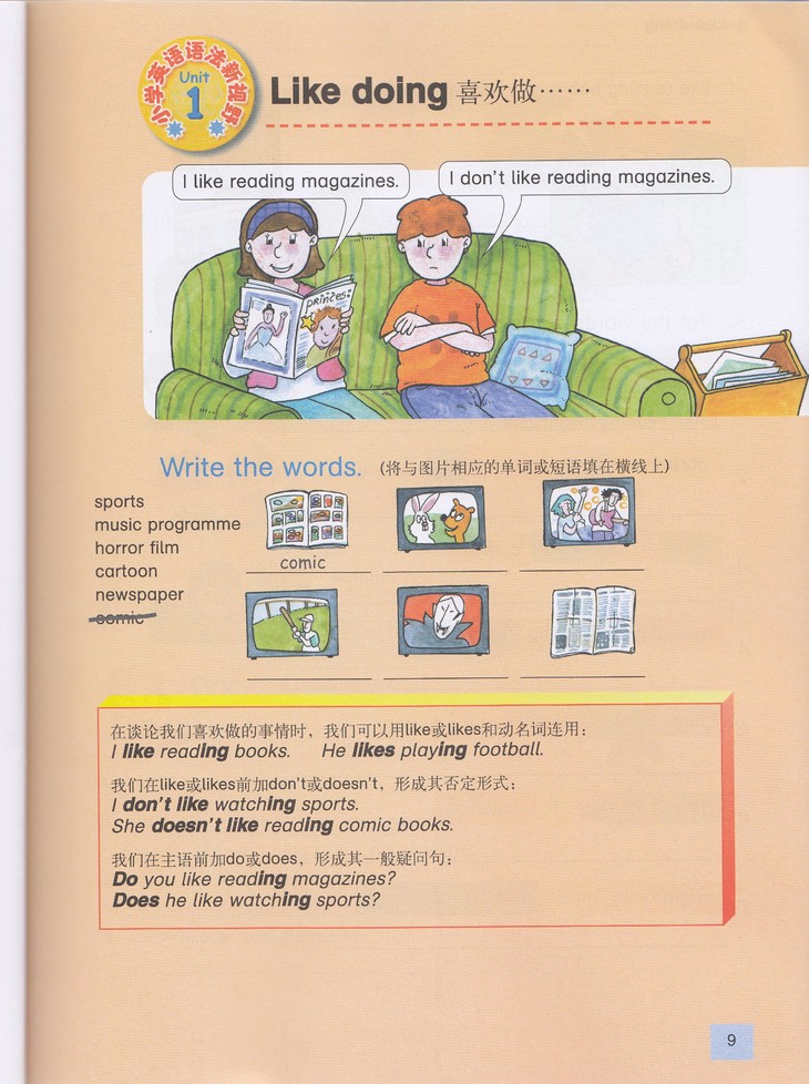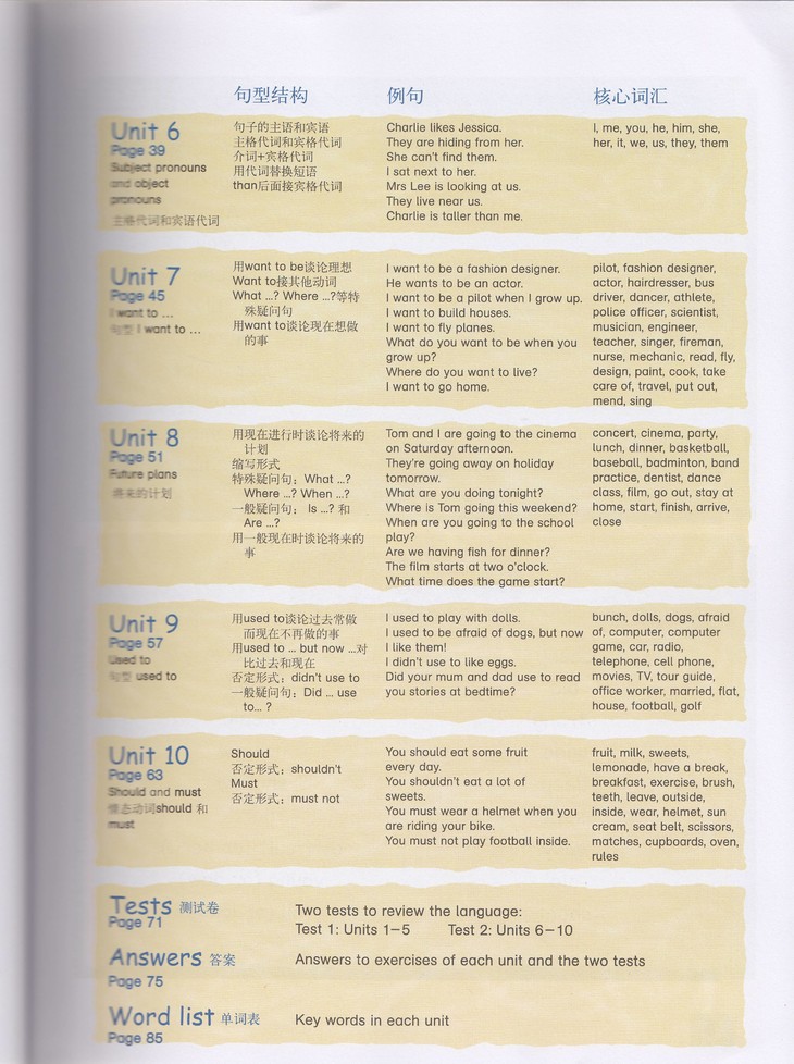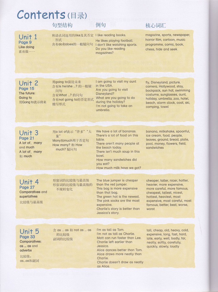 Unit 1 Page 9 Like doing 喜欢做…… Unit 2 Page 15 The future:Going to 用Going to表示将来 Unit 3 Page 21 A lot of , many and much A lot of、 many 和 much Unit 4 Page 27 Comparatives and superlatives 比较级与zui高级