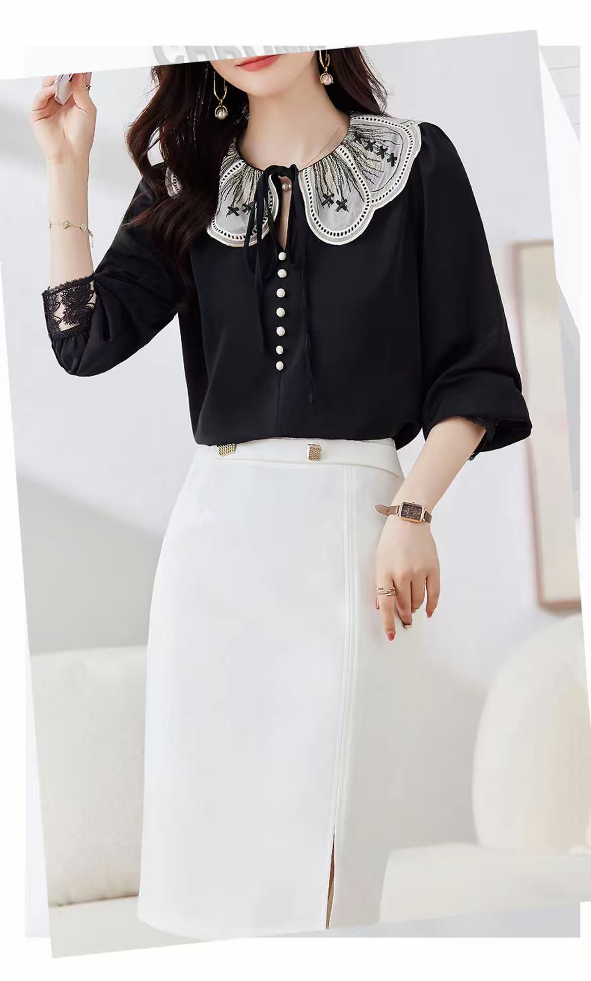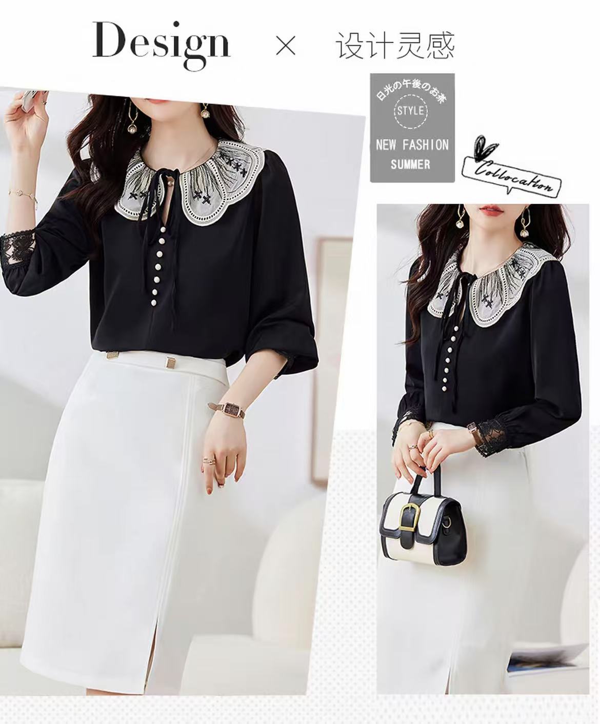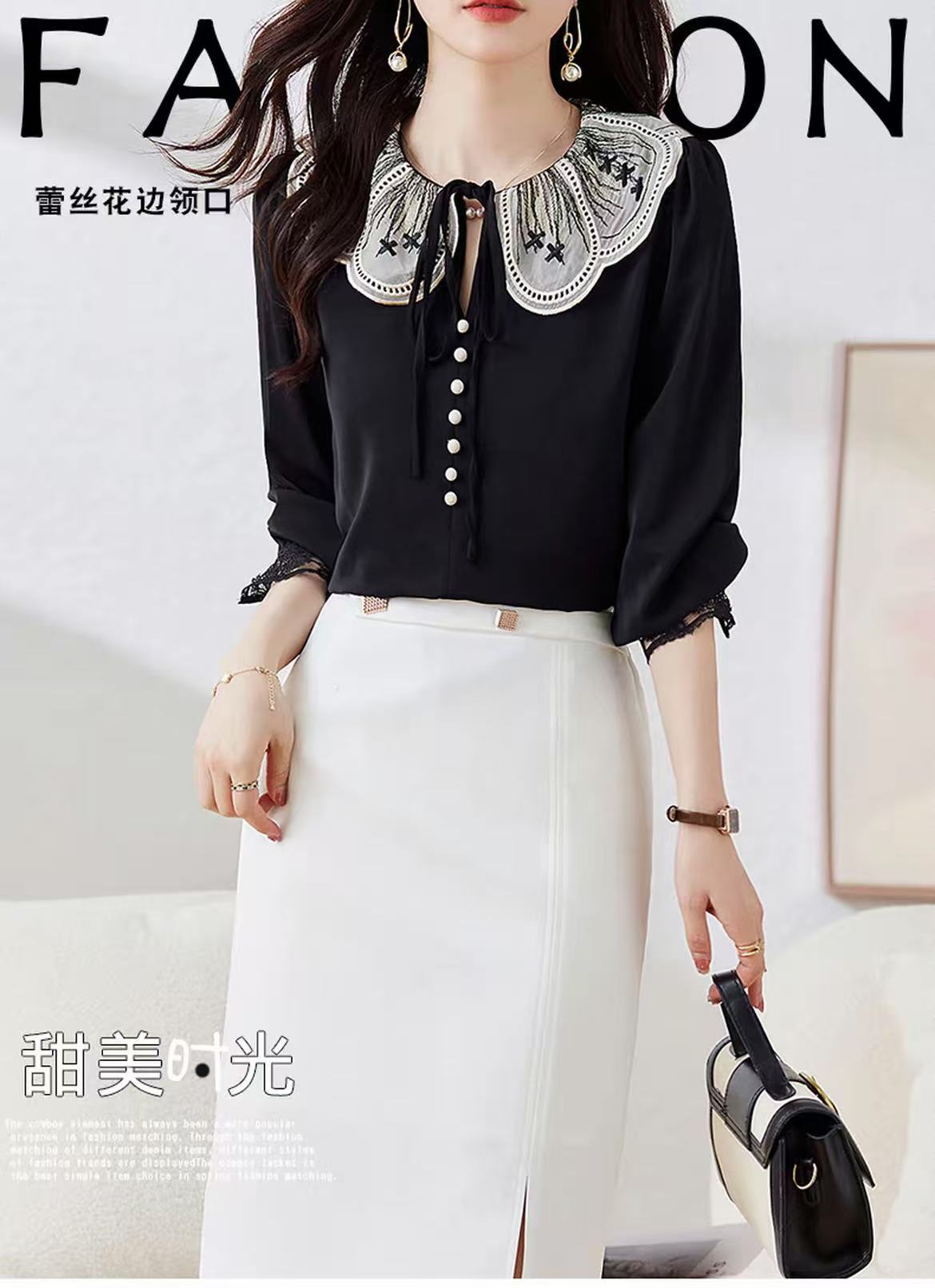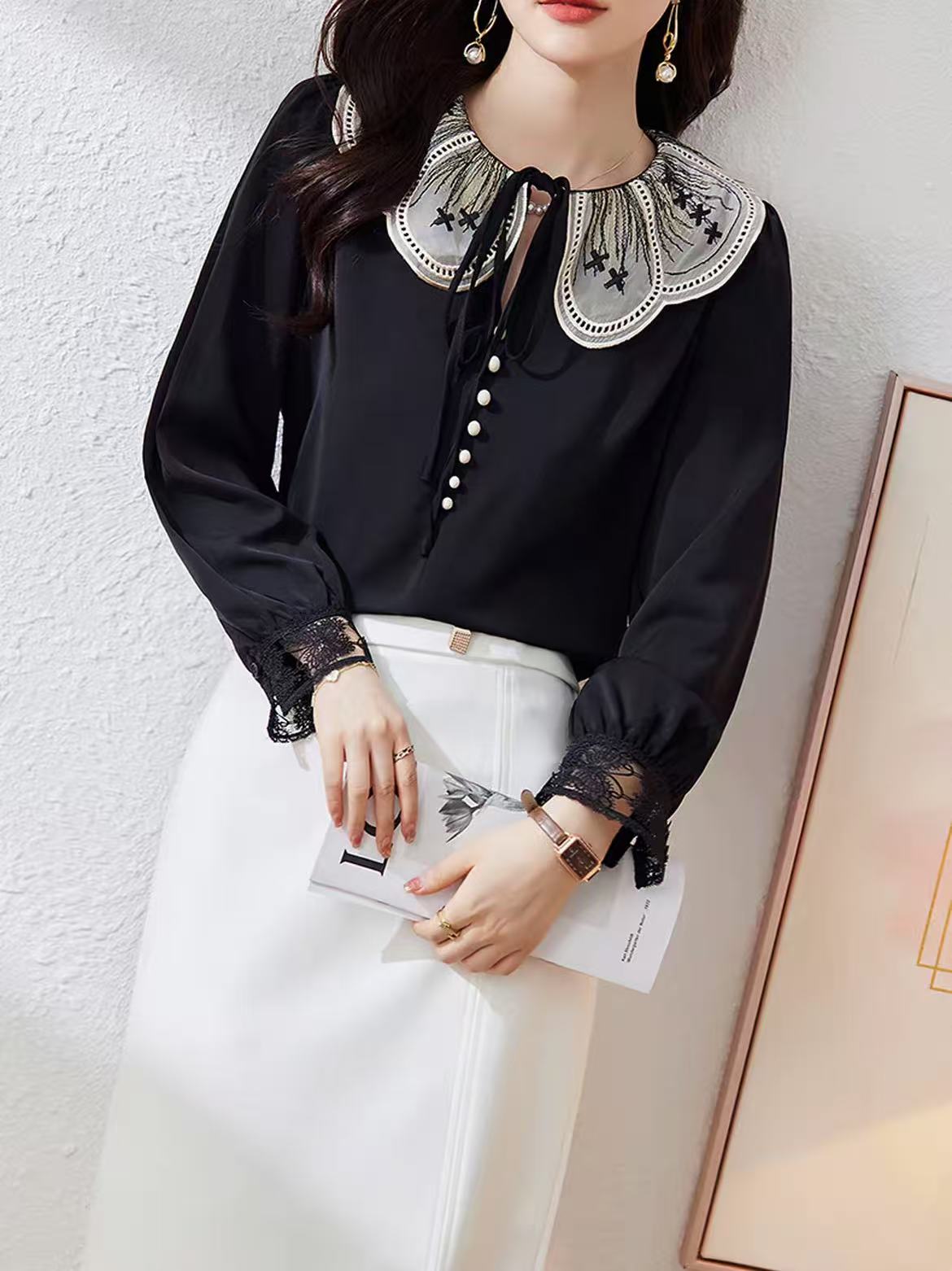 【早秋特卖】88103蕾丝刺绣系带优雅气质长袖小衫衬衫-喜出