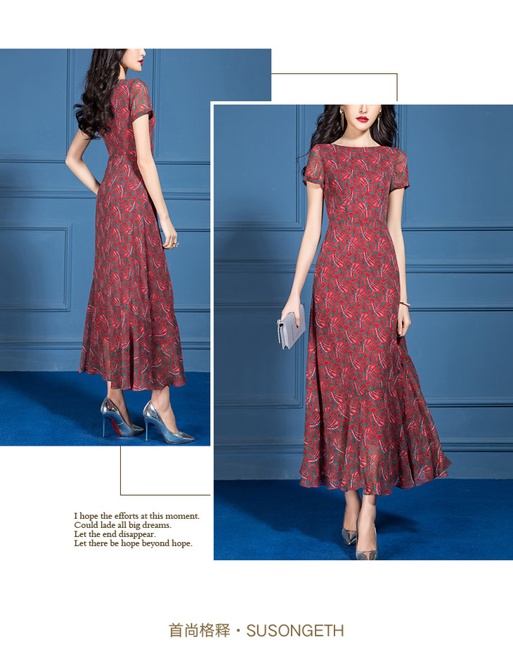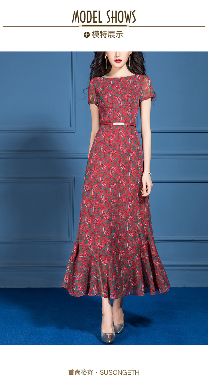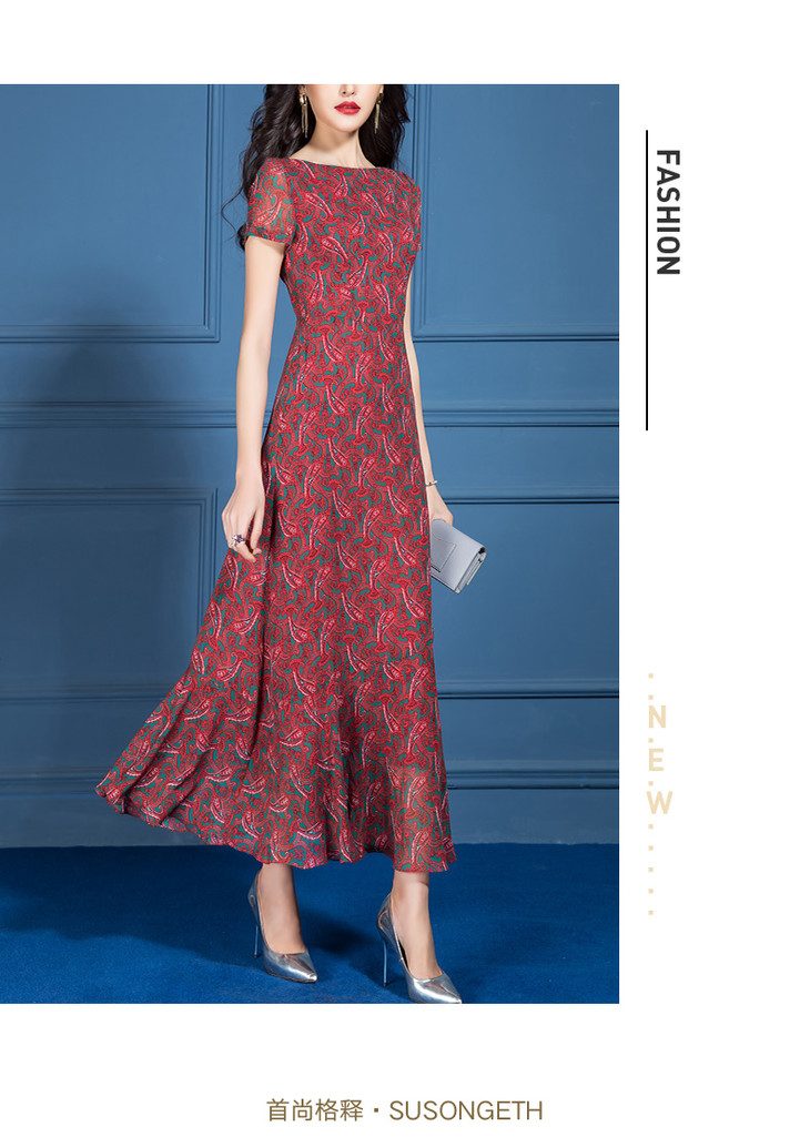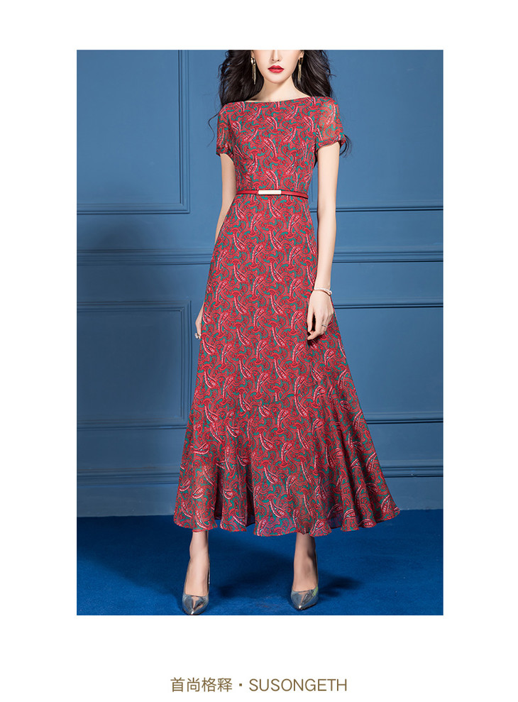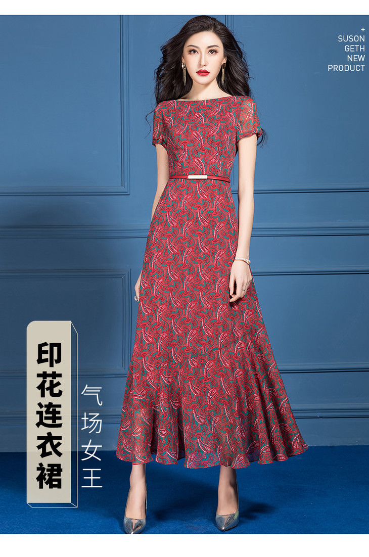 HT-387新款一字领印花收腰修身显瘦优雅大摆连衣裙