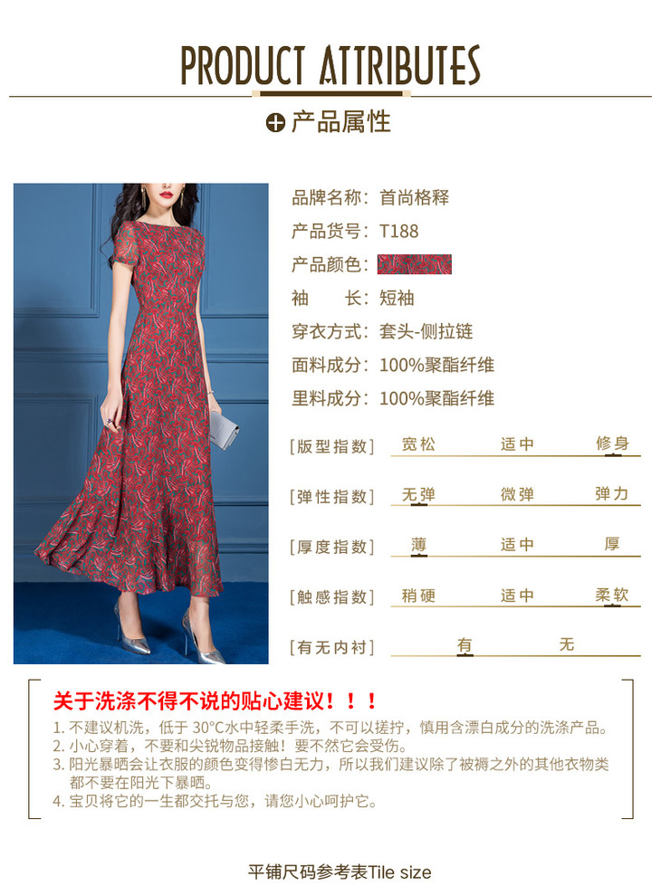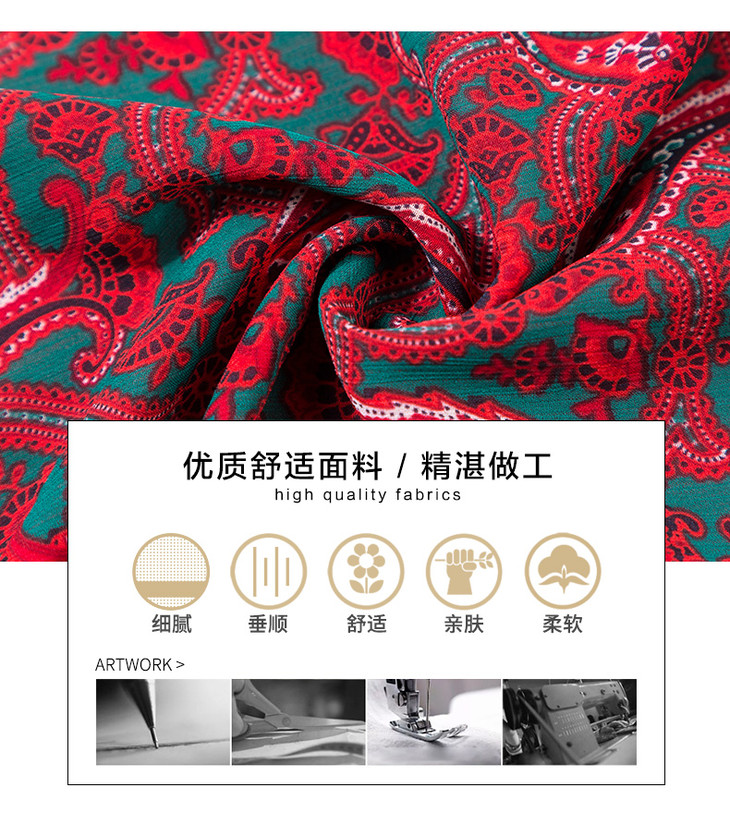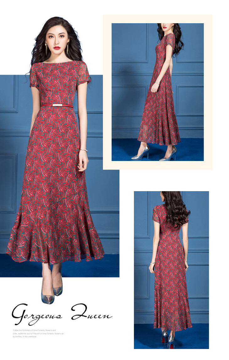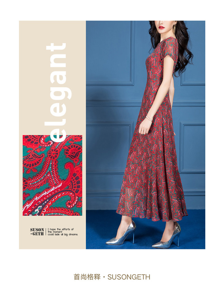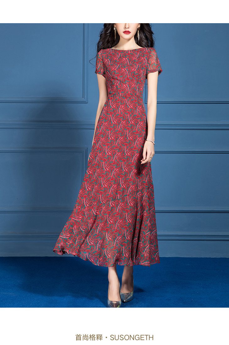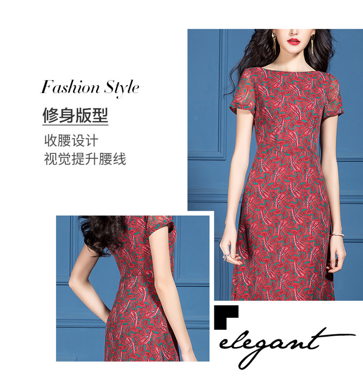 HT-387新款一字领印花收腰修身显瘦优雅大摆连衣裙