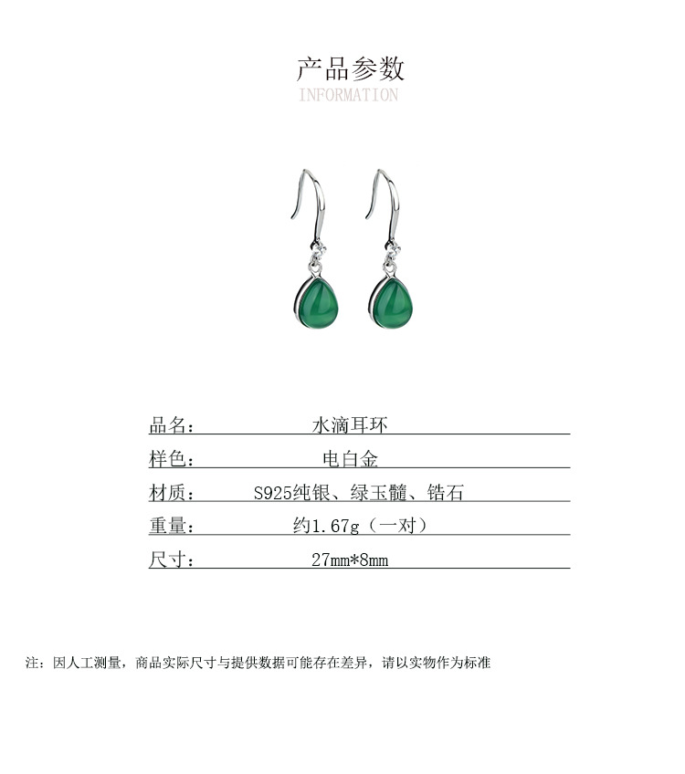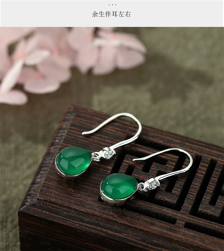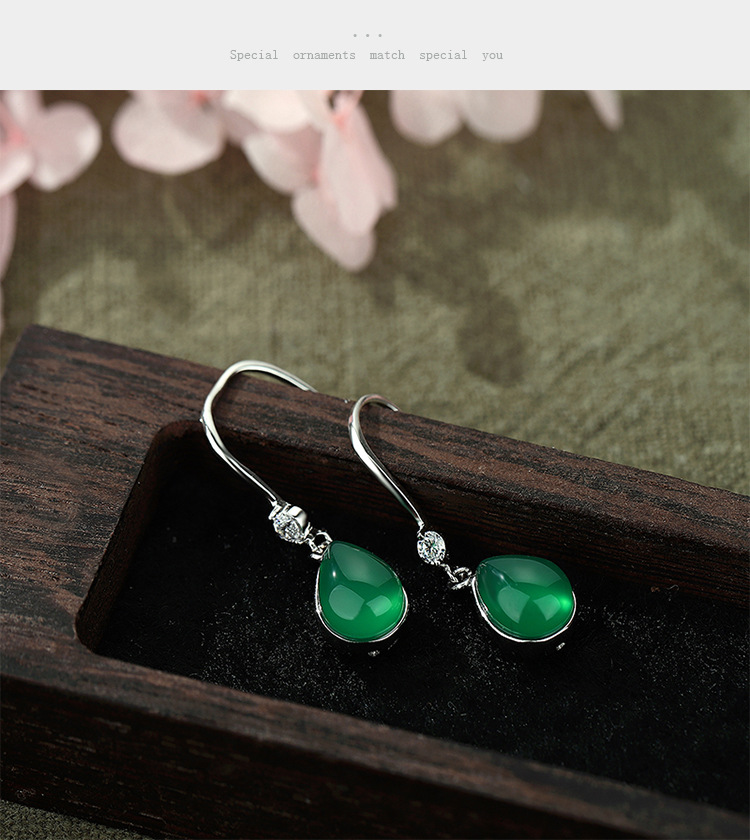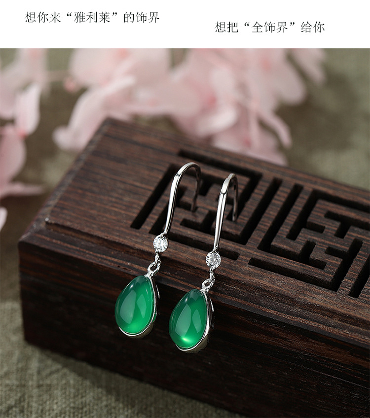 YLL-S925纯银滴绿玉髓耳环女镶嵌锆石复古气质长款耳饰