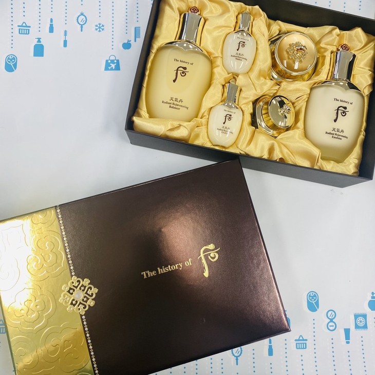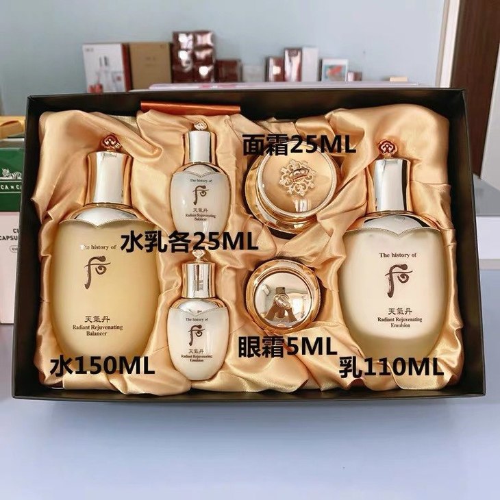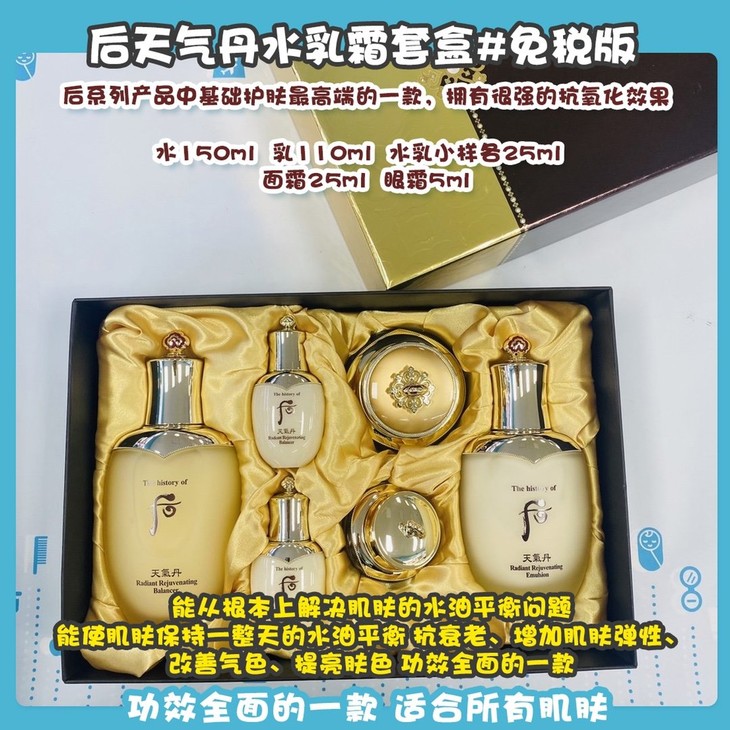 后天气丹水乳霜套盒#免税版👍后系列产品中基础护肤最高端的一款,拥有很强的抗氧化效果👊,能从根本上解决肌肤的水油平衡问题,能使肌肤保持一整天的水油平衡💦。抗衰老、增加肌肤弹性、改善气色、提亮肤色🤩,功效全面的一款。适合所有肌肤,孕妇敏感肌可用。套装包括:水150ml➕乳110ml➕水乳小样各25ml➕面霜25ml➖眼霜5ml。