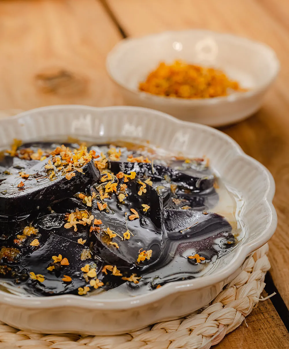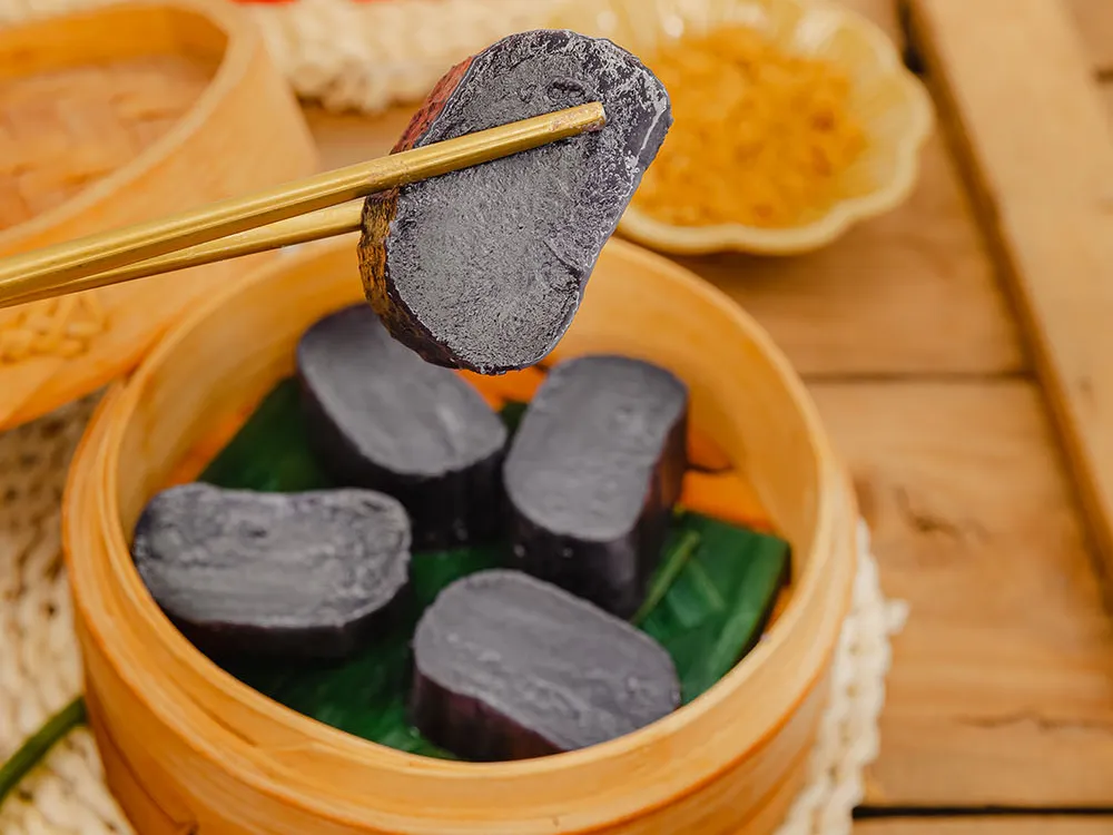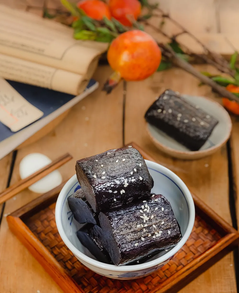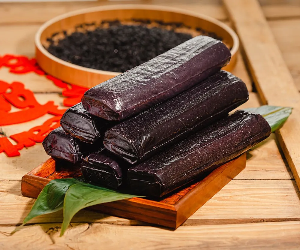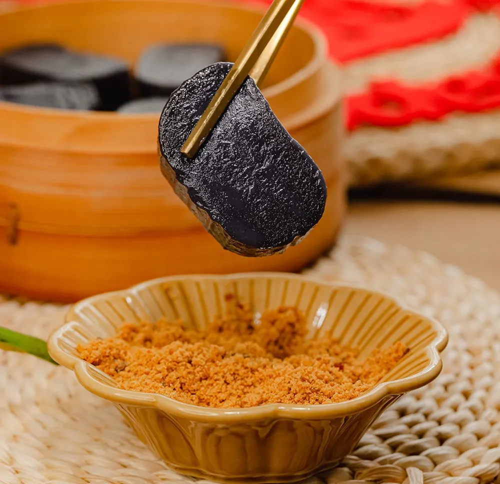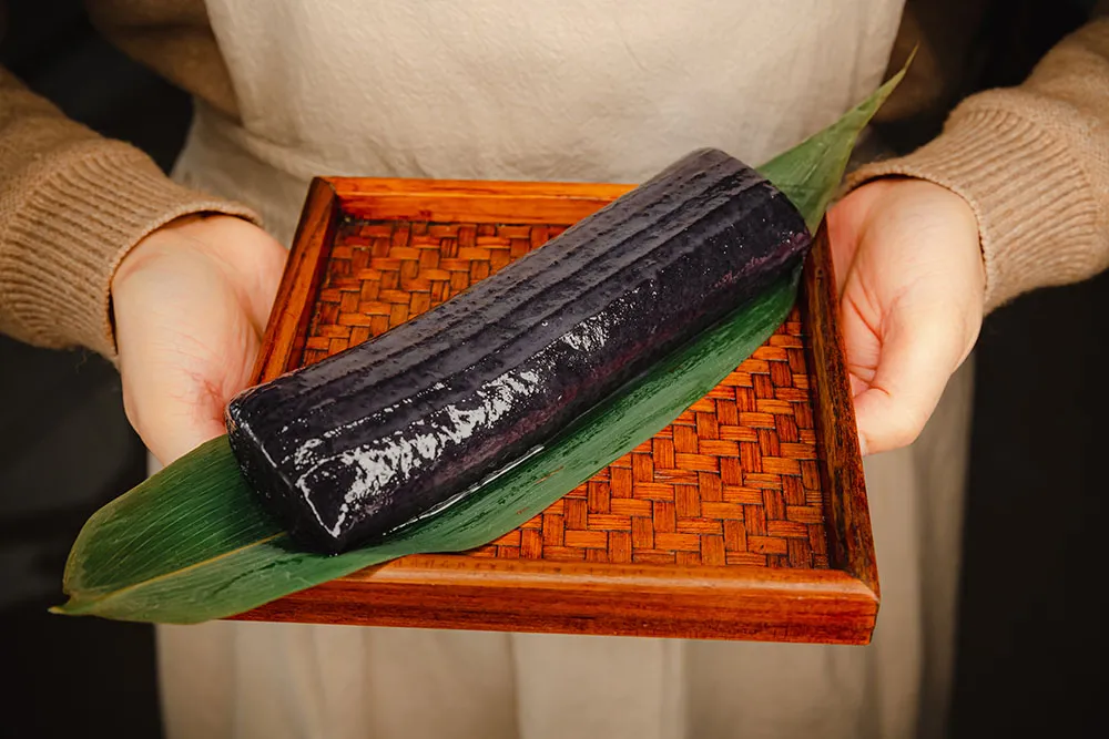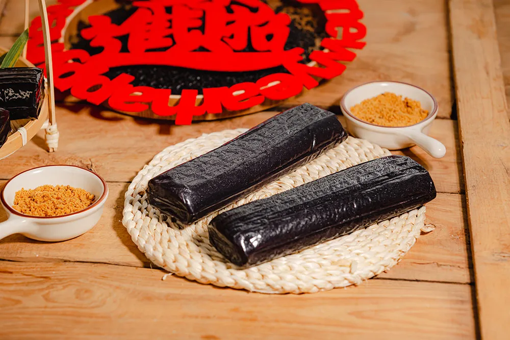 乌饭庄园的乌饭年糕有着水磨年糕的特点:浅煮Q弹柔韧,久煮绵软不烂,口感韧而不黏。