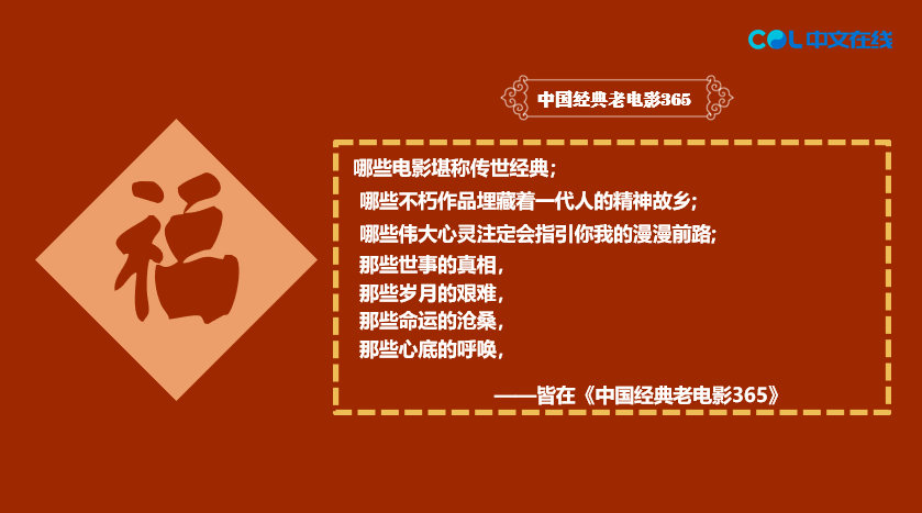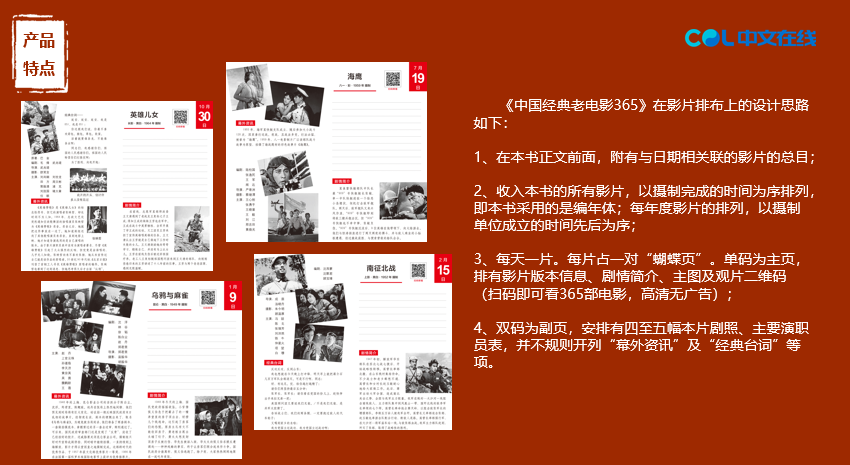 出版方从这十七年间拍摄的六百多部故事片、戏曲(含歌剧、舞剧等)片及美术片中,挑选出365部影片,编成本日历,使其具有实用、普及、怀旧和珍藏的多重效能,也是七八九零后们向父母表达爱意的一种独特的、颇有文化意味的精神交流物件。