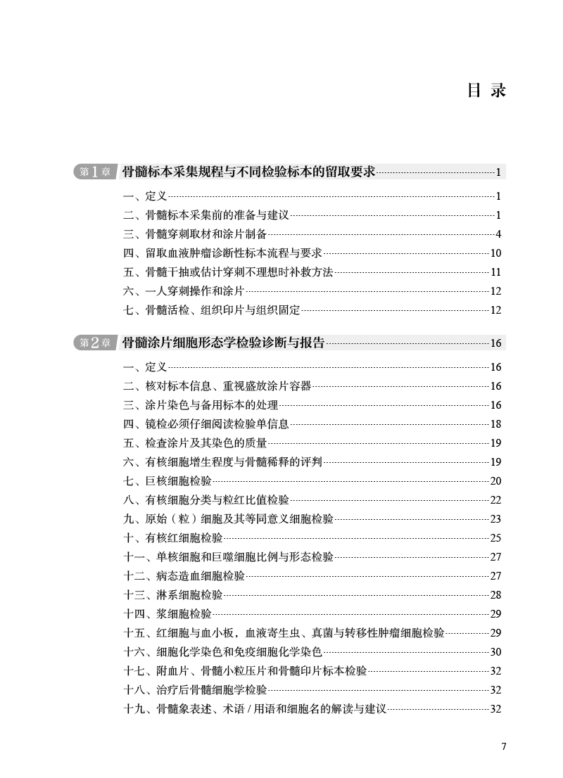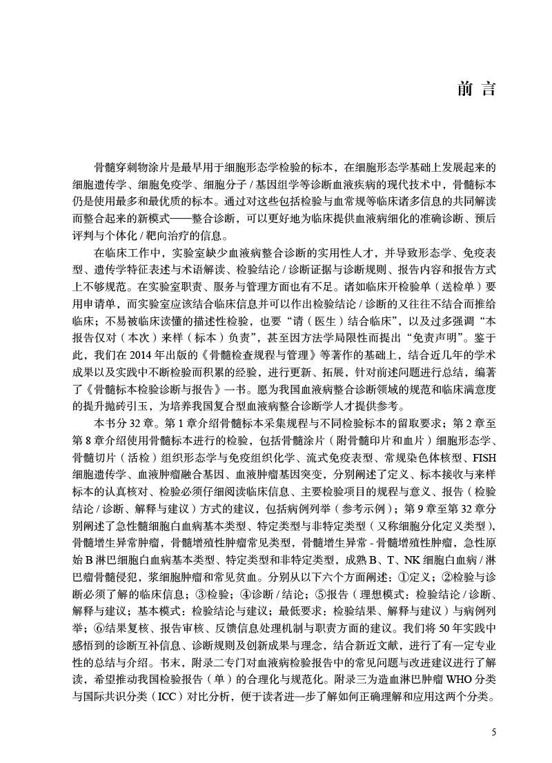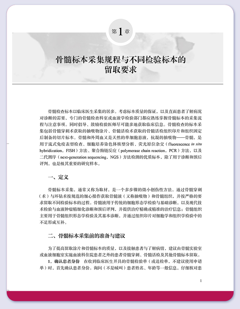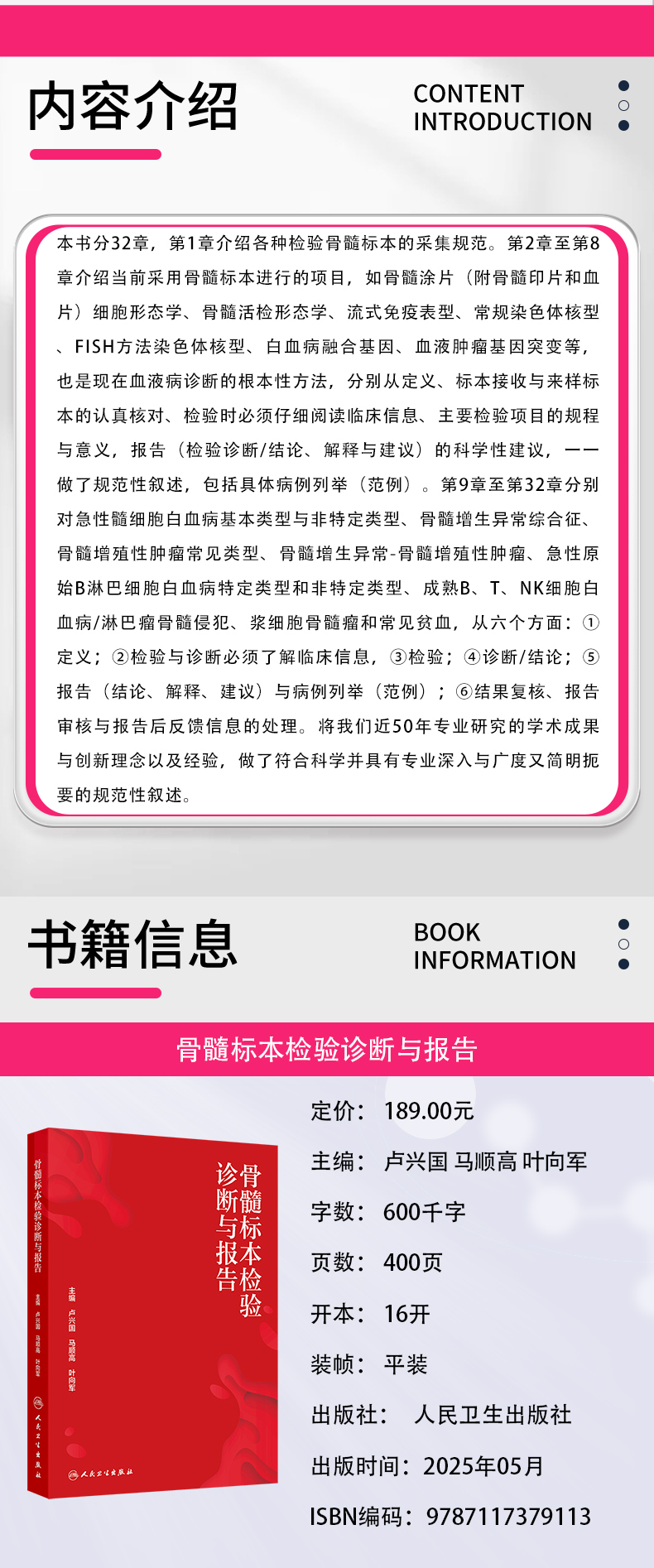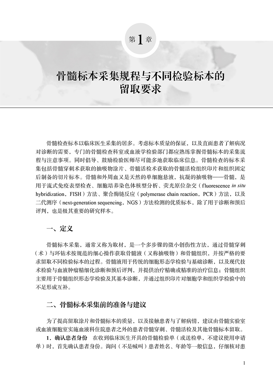 本书分32章,第1章介绍各种检验骨髓标本的采集规范。第2章至第8章介绍当前采用骨髓标本进行的项目,如骨髓涂片(附骨髓印片和血片)细胞形态学、骨髓活检形态学、流式免疫表型、常规染色体核型、FISH方法染色体核型、白血病融合基因、血液肿瘤基因突变等,也是现在血液病诊断的根本性方法,分别从定义、标本接收与来样标本的认真核对、检验时必须仔细阅读临床信息、主要检验项目的规程与意义,报告(检验诊断/结论、解释与建议)的科学性建议,一一做了规范性叙述,包括具体病例列举(范例)。第9章至第32章分别对急性髓细胞白血病基本类型与非特定类型、骨髓增生异常综合征、骨髓增殖性肿瘤常见类型、骨髓增生异常-骨髓增殖性肿瘤、急性原始B淋巴细胞白血病特定类型和非特定类型、成熟B、T、NK细胞白血病/淋巴瘤骨髓侵犯、浆细胞骨髓瘤和常见贫血,从六个方面:①定义;②检验与诊断必须了解临床信息,③检验;④诊断/结论;⑤报告(结论、解释、建议)与病例列举(范例);⑥结果复核、报告审核与报告后反馈信息的处理。将我们近50年专业研究的学术成果与创新理念以及经验,做了符合科学并具有专业深入与广度又简明扼要的规范性叙述。