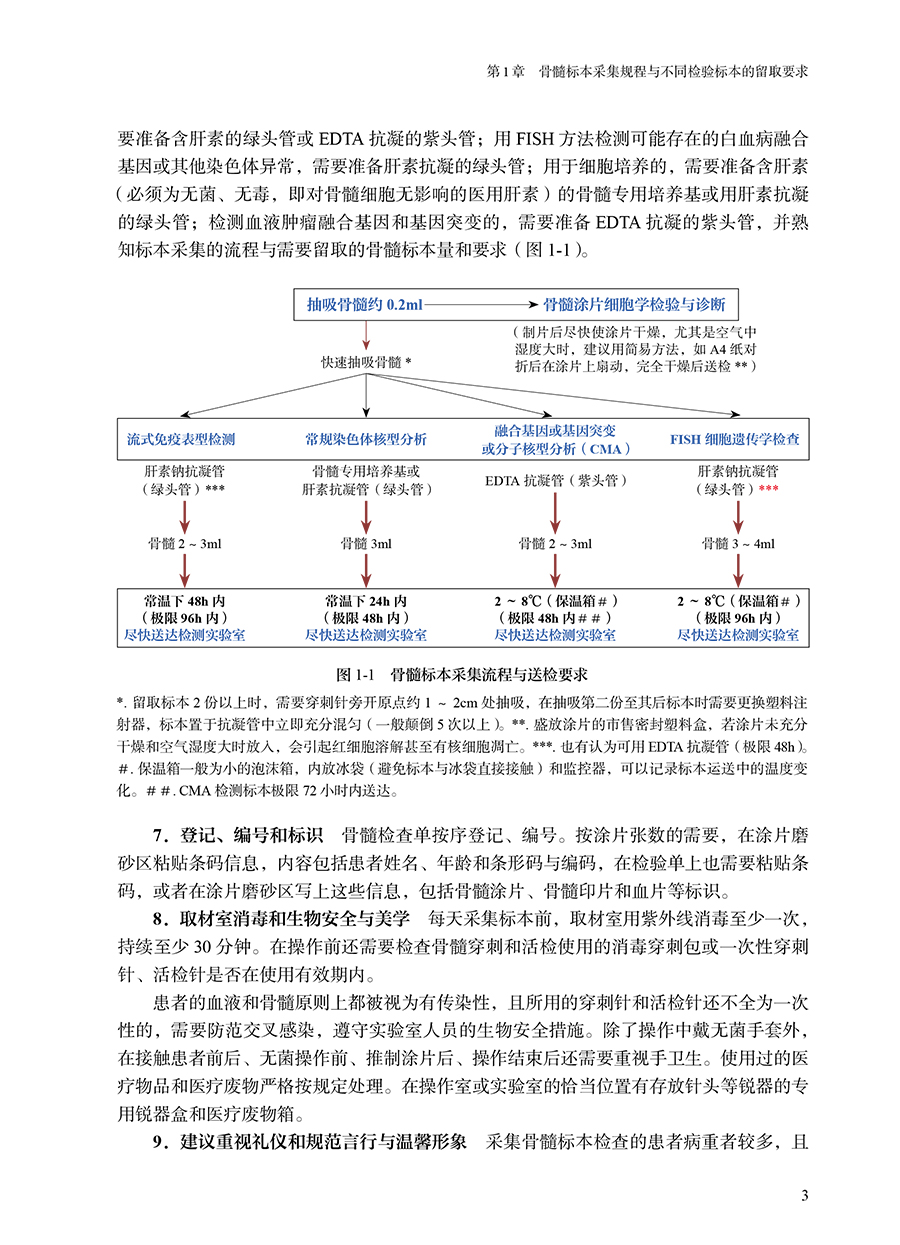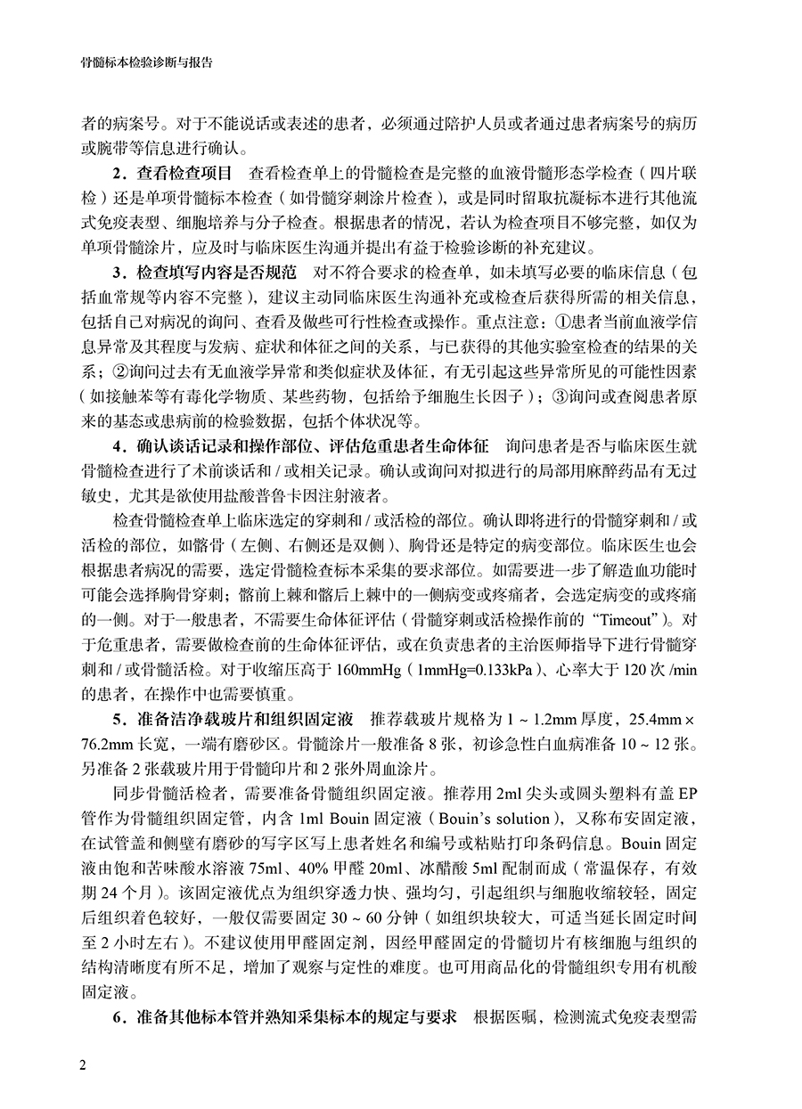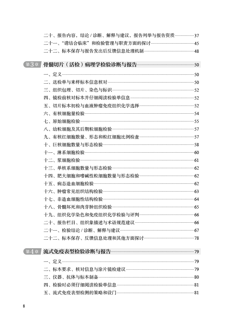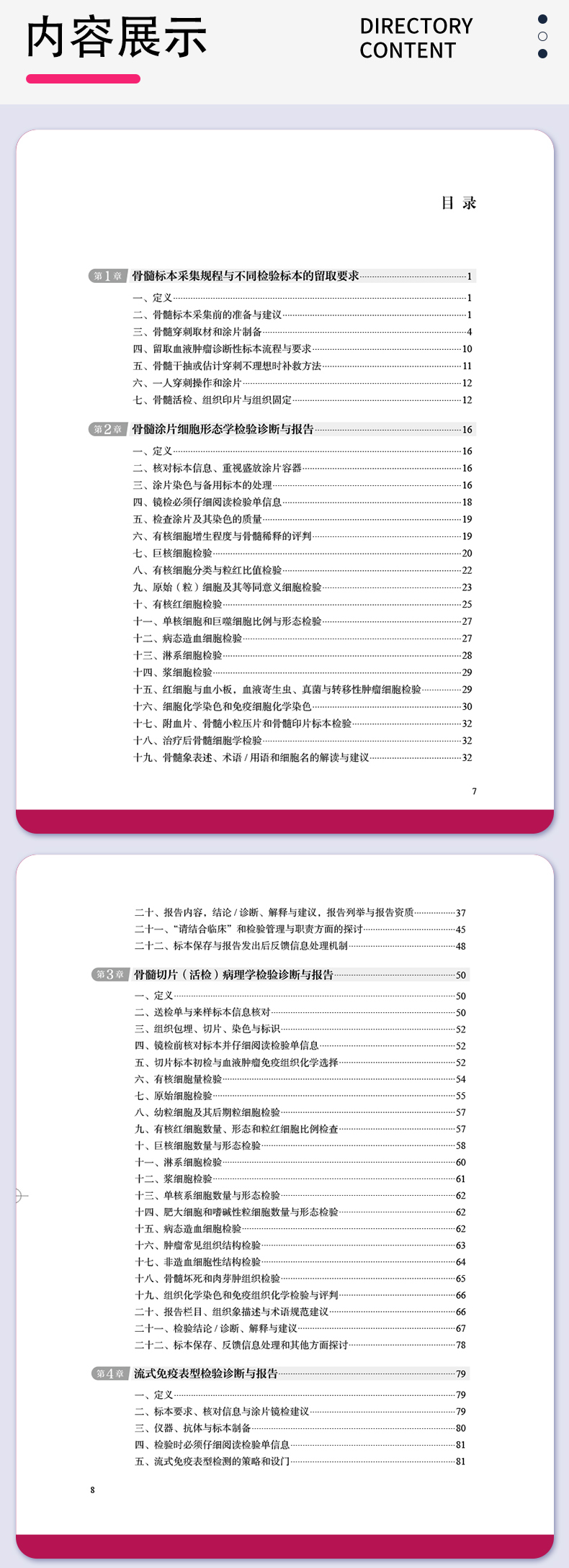 本书分32章,第1章介绍各种检验骨髓标本的采集规范。第2章至第8章介绍当前采用骨髓标本进行的项目,如骨髓涂片(附骨髓印片和血片)细胞形态学、骨髓活检形态学、流式免疫表型、常规染色体核型、FISH方法染色体核型、白血病融合基因、血液肿瘤基因突变等,也是现在血液病诊断的根本性方法,分别从定义、标本接收与来样标本的认真核对、检验时必须仔细阅读临床信息、主要检验项目的规程与意义,报告(检验诊断/结论、解释与建议)的科学性建议,一一做了规范性叙述,包括具体病例列举(范例)。第9章至第32章分别对急性髓细胞白血病基本类型与非特定类型、骨髓增生异常综合征、骨髓增殖性肿瘤常见类型、骨髓增生异常-骨髓增殖性肿瘤、急性原始B淋巴细胞白血病特定类型和非特定类型、成熟B、T、NK细胞白血病/淋巴瘤骨髓侵犯、浆细胞骨髓瘤和常见贫血,从六个方面:①定义;②检验与诊断必须了解临床信息,③检验;④诊断/结论;⑤报告(结论、解释、建议)与病例列举(范例);⑥结果复核、报告审核与报告后反馈信息的处理。将我们近50年专业研究的学术成果与创新理念以及经验,做了符合科学并具有专业深入与广度又简明扼要的规范性叙述。