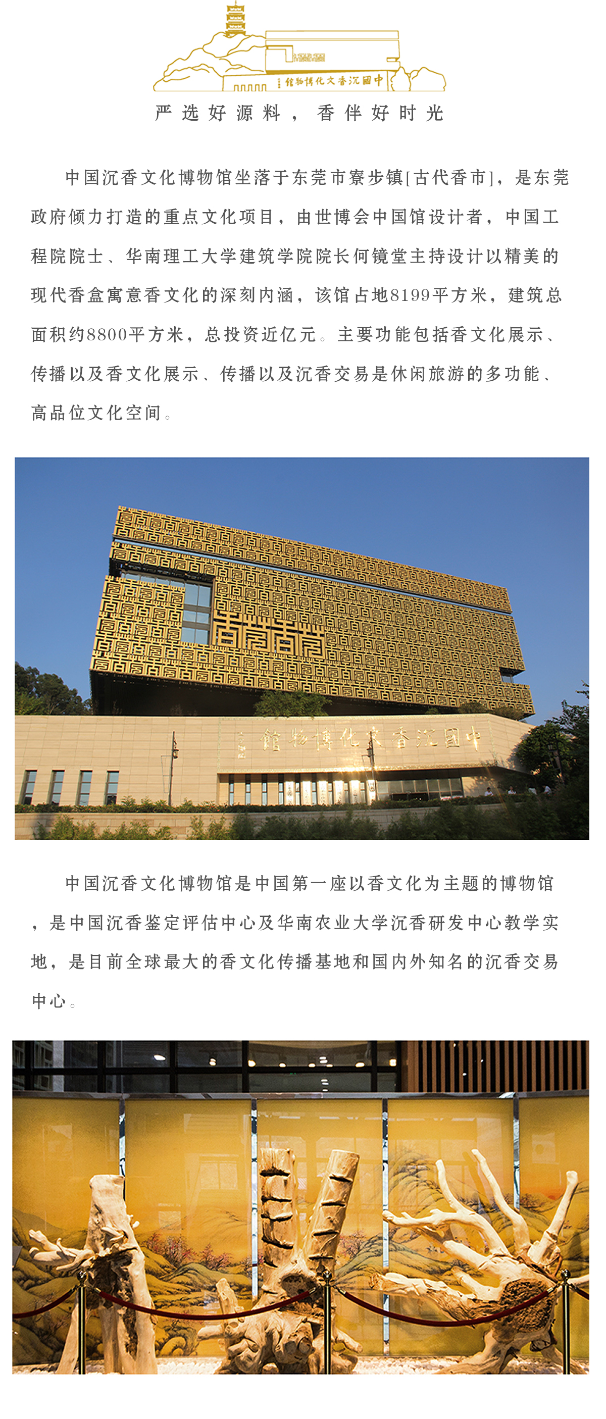 中国沉香文化博物馆坐落于古代[香市]东莞市寮步镇,是东莞政府倾力打造的重点文化项目,由世博会中国馆设计者,中国工程院院士、华南理工大学建筑学院院长何镜堂主持设计,以精美的现代[香盒]寓意香文化的深刻内