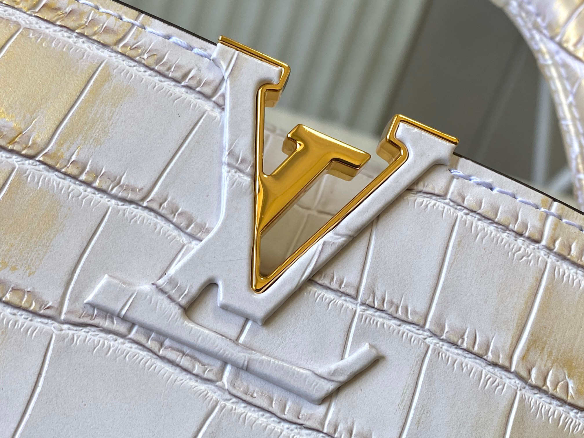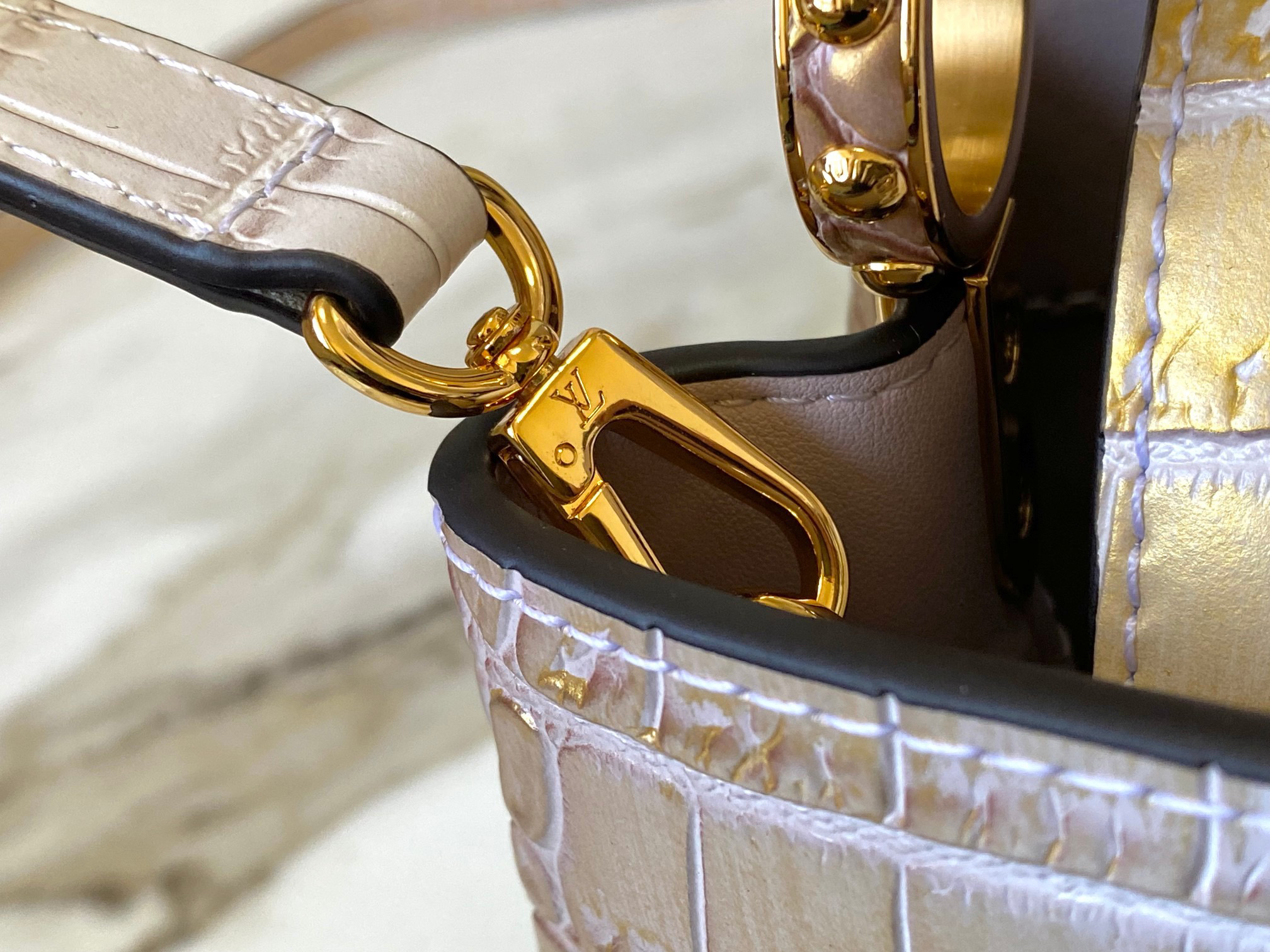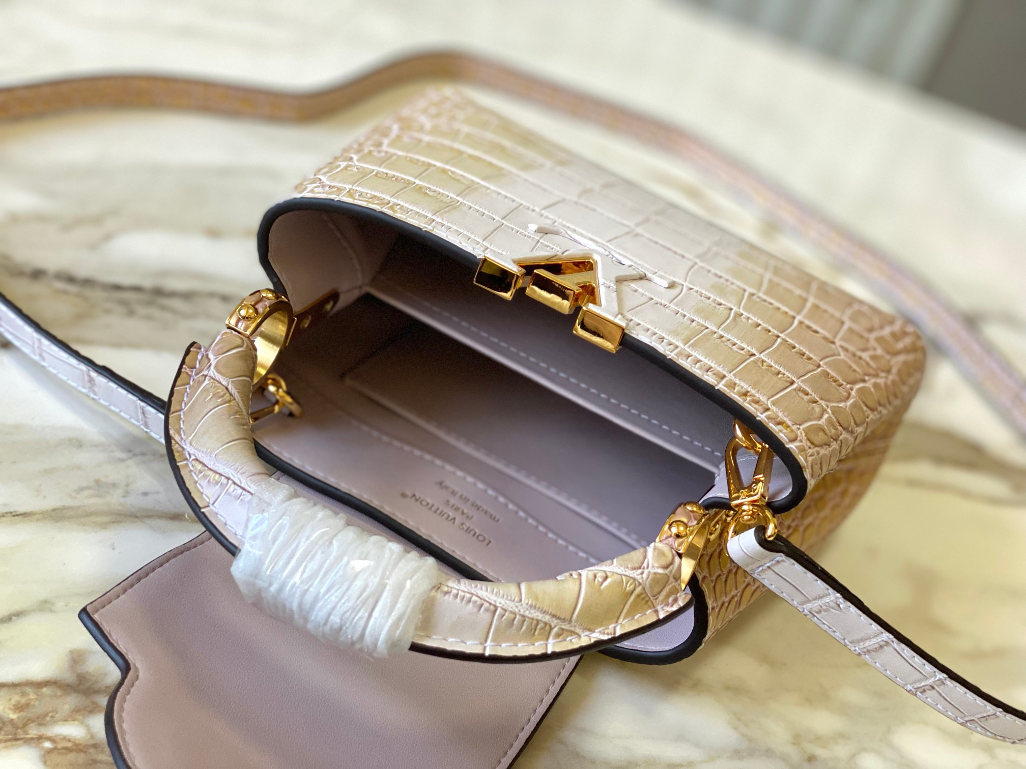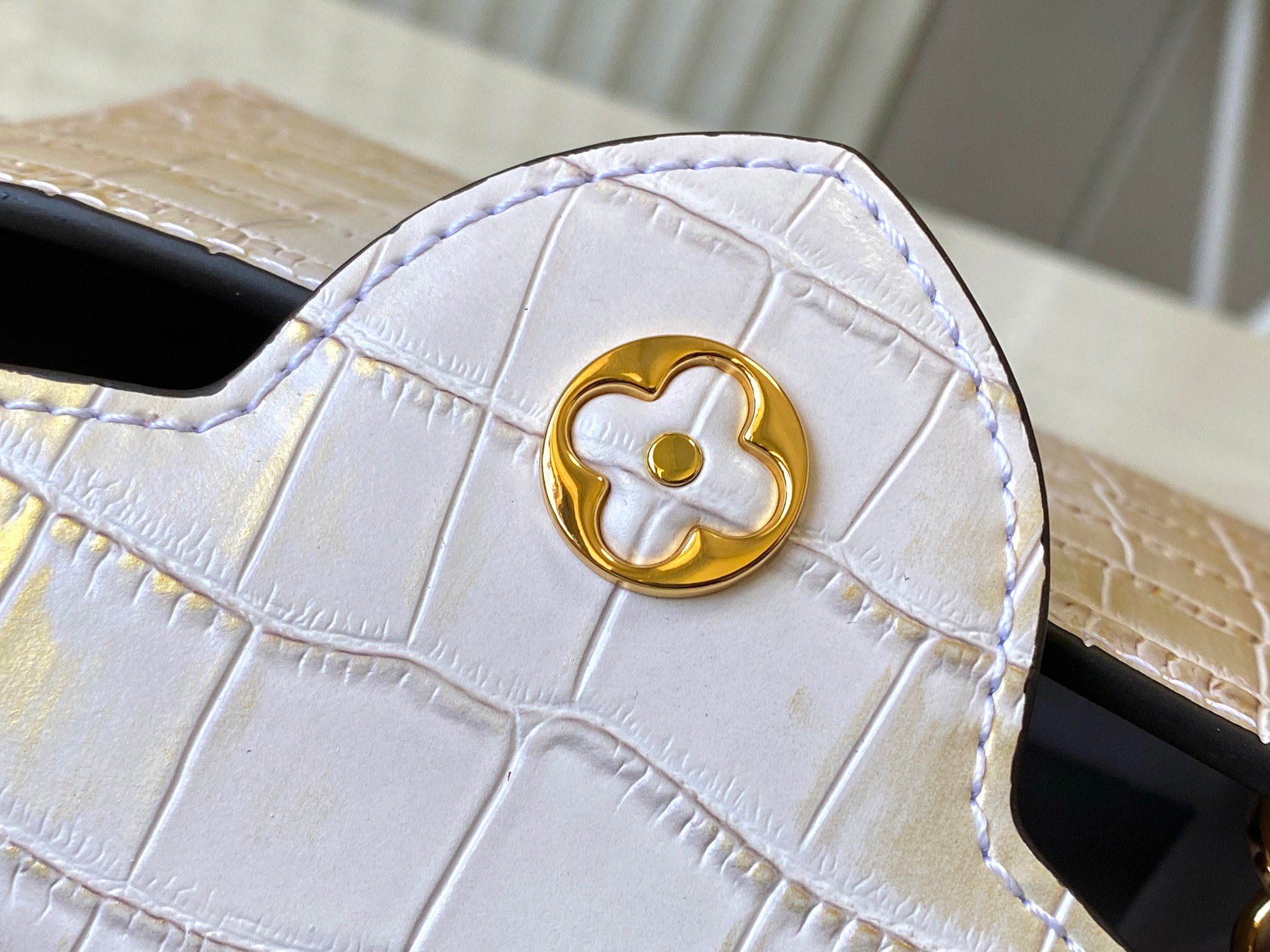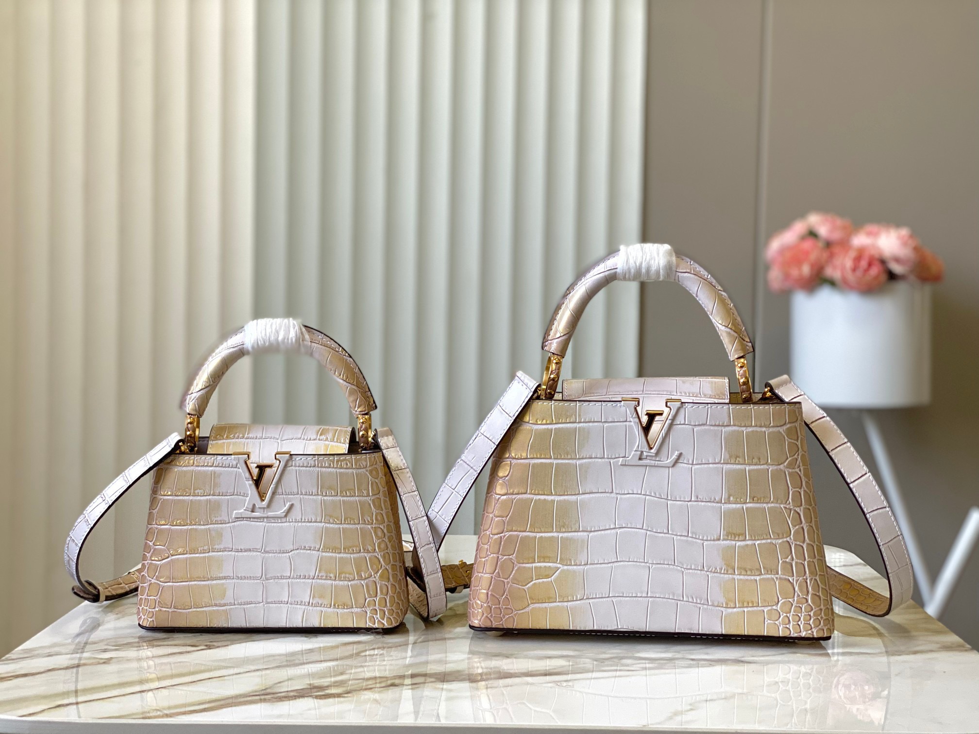 秋冬特惠💰1430 渠道级LV 新品 te级LV N93163/M48865流金尼罗鳄鱼纹 此款珍贵的Capucines手袋由鳄鱼皮纹 经上高光处理 闪耀迷人 奢华的山羊皮衬里与闪闪发光的金属饰件 特有的Capucines搭盖既可收入包内 展示字母标识 又可外翻 呈现Monogram Flower图案 出行的理想配饰 Size: 21 * 14 * 8 CM