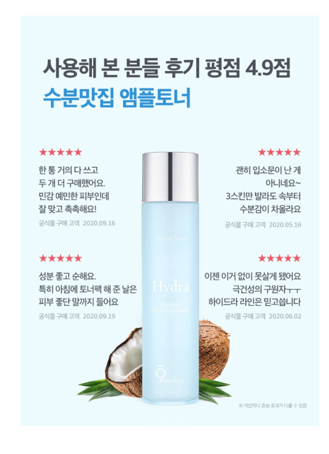 韩国9wishes爽肤水椰子水和玻尿酸补水化妆水保湿水OliveYoungJPY带授权招加盟代理