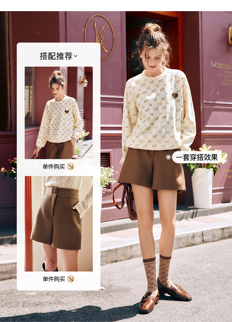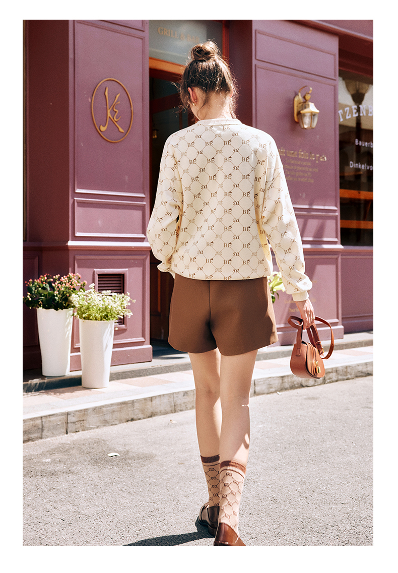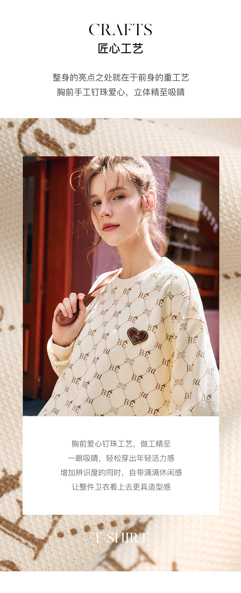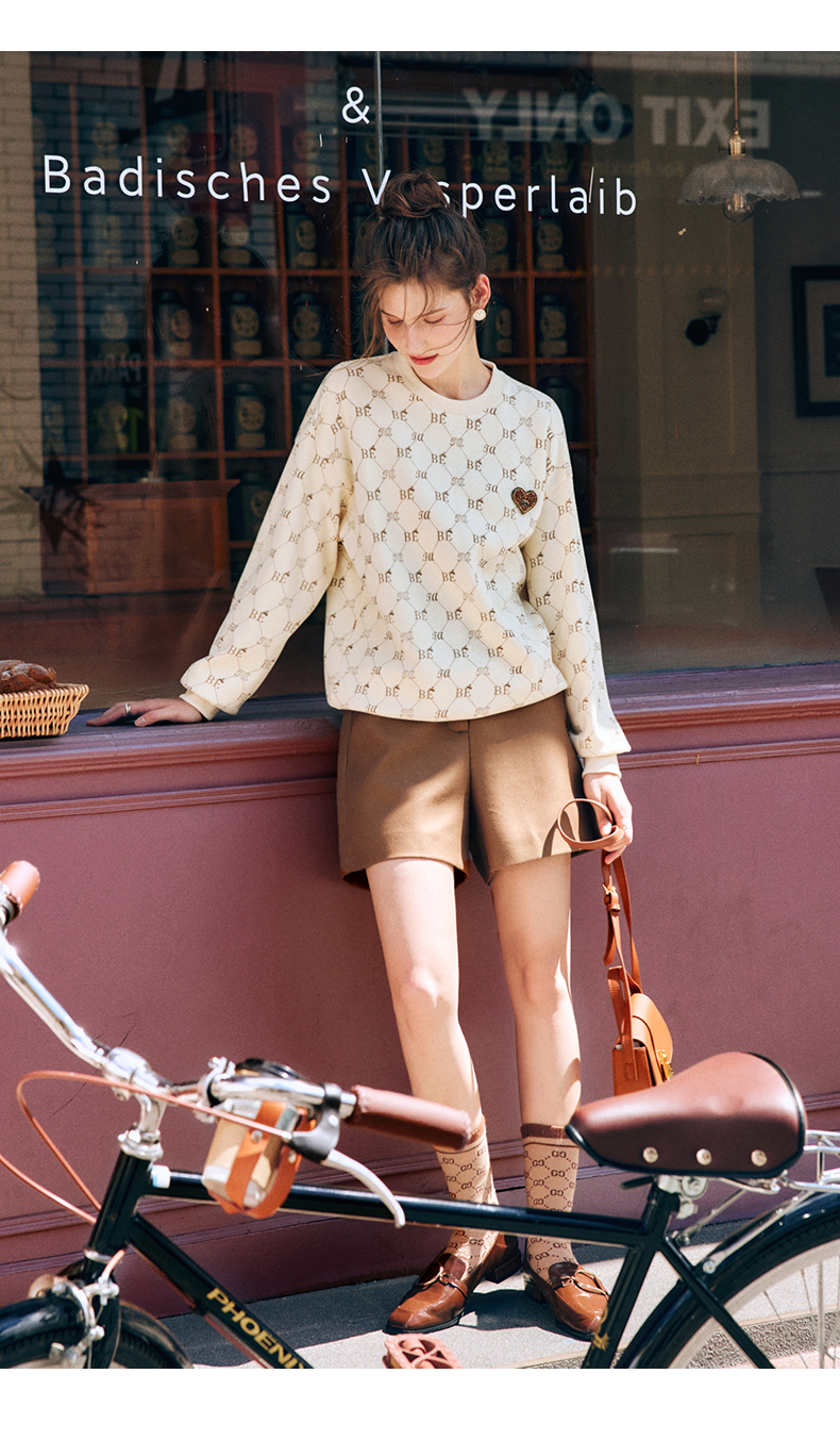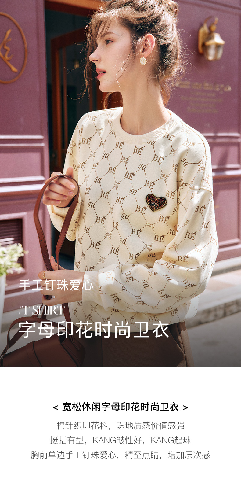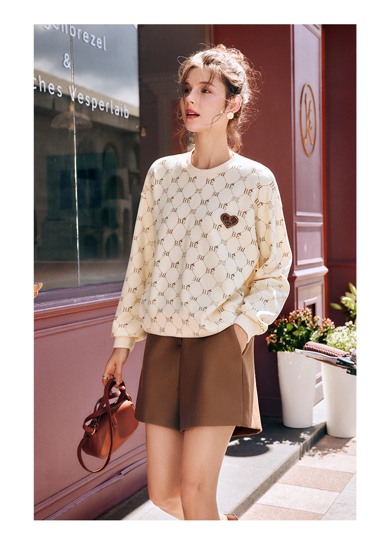 OLrain欧芮儿法式杏色卫衣女秋季2022年新款宽松珠地印花圆领上衣