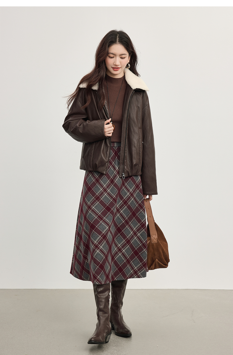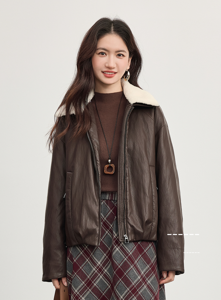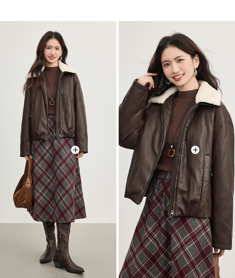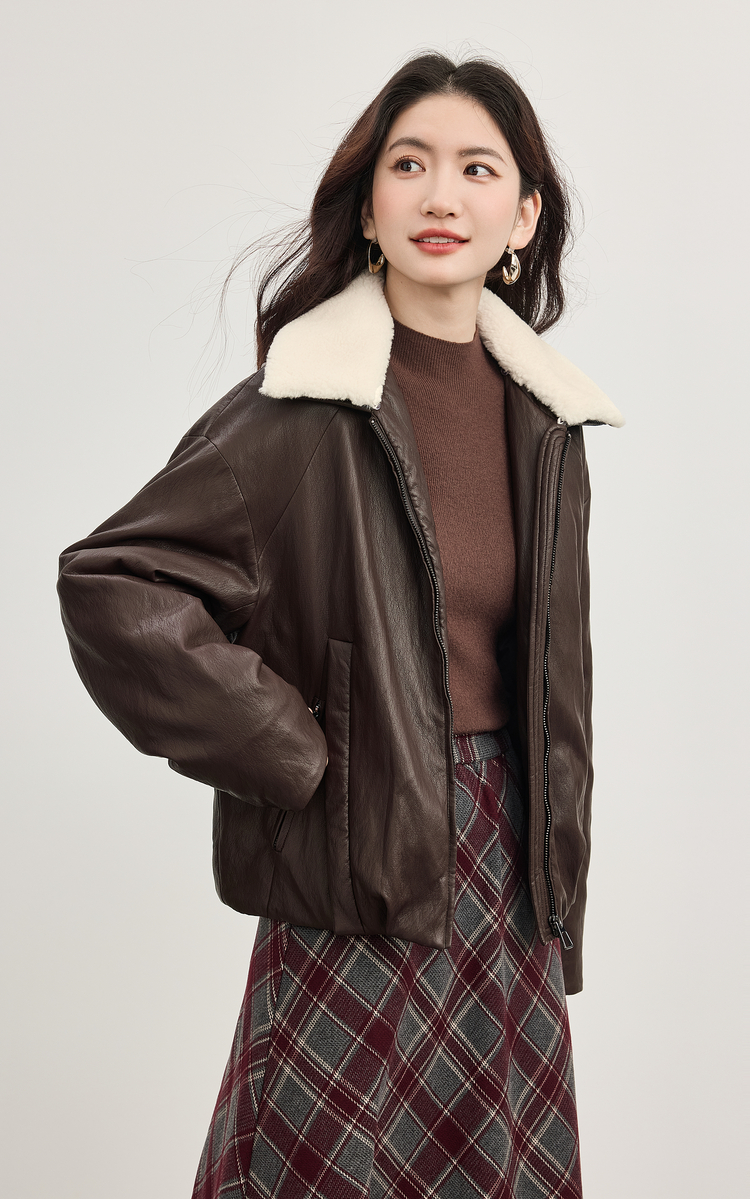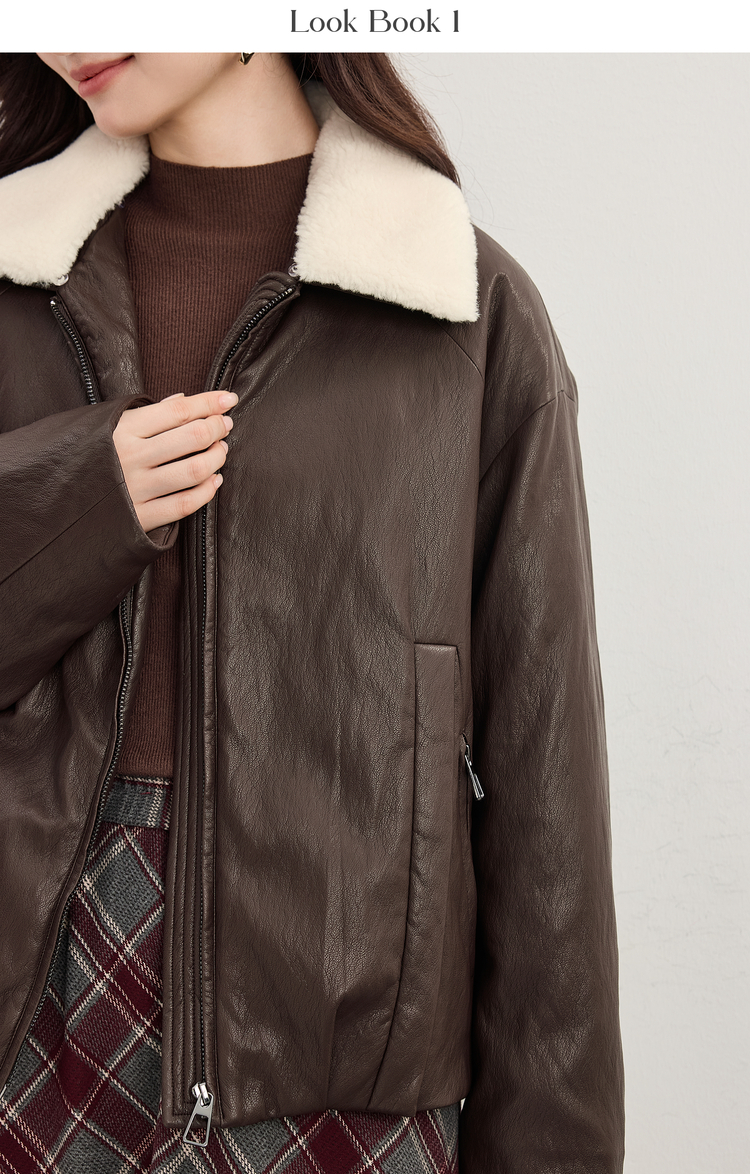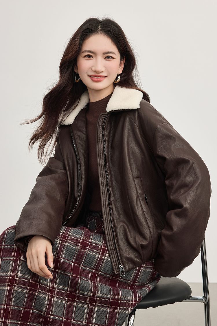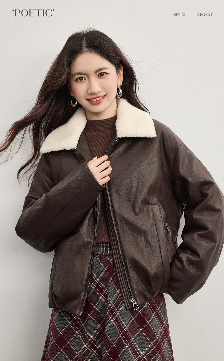 【年货节】熙世界酷飒风PU皮衣羽绒服女短款冬季新款复古毛领花苞外套白鸭绒